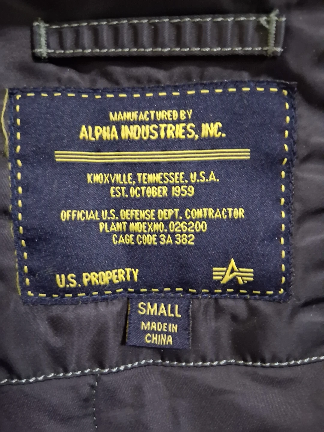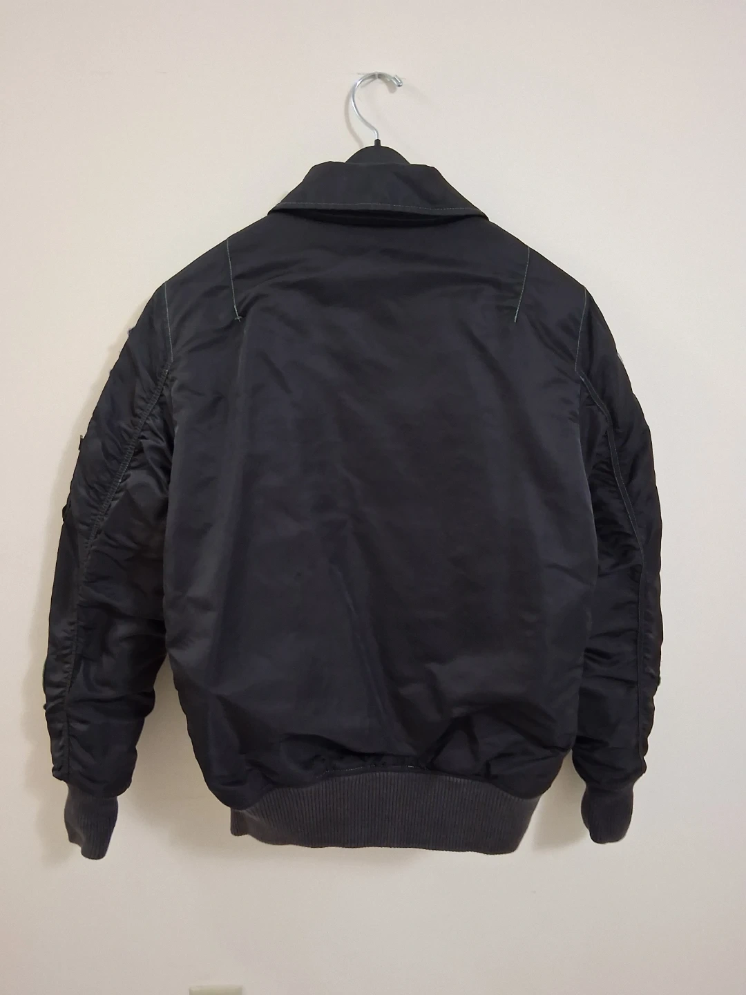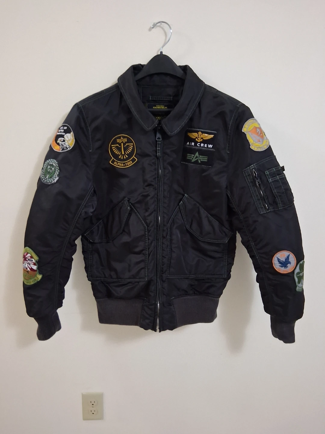 Selling an Alpha Industries bomber jacket in size medium. It's black with various patches on the front. A stylish and unique piece!