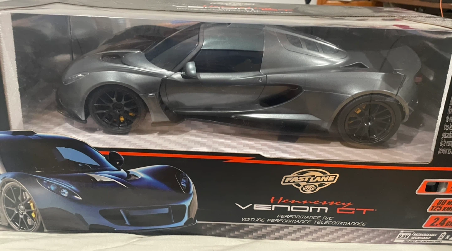 Selling a brand new Fast Lane RC Hennessey Venom GT, still in its original packaging! This performance R/C car features realistic engine sounds, working headlights and taillights. It operates on a 2.4 GHz frequency and has a range of 140 feet. Ready to run with included batteries! Great Christmas Present