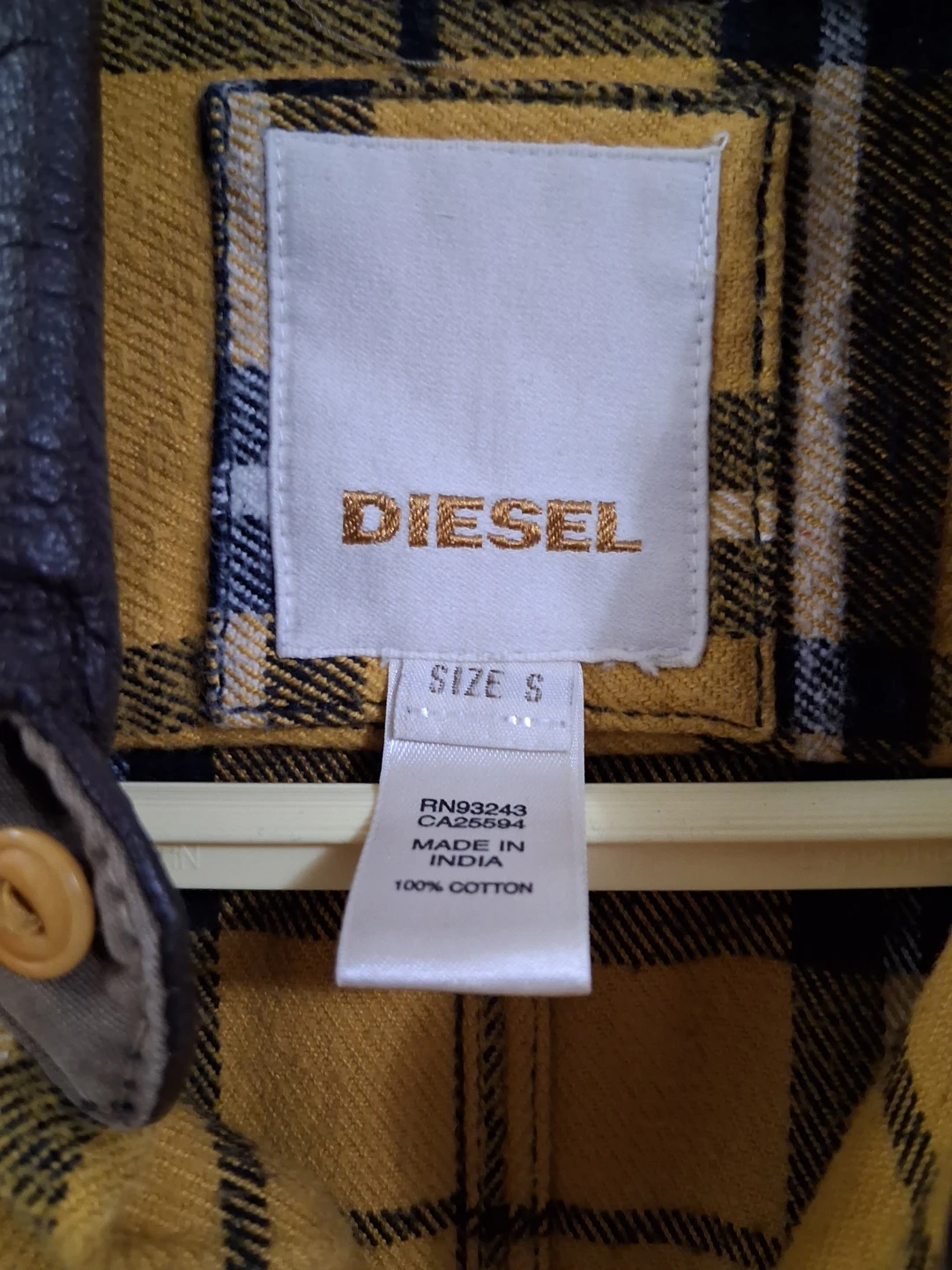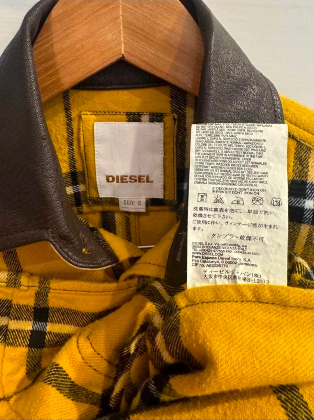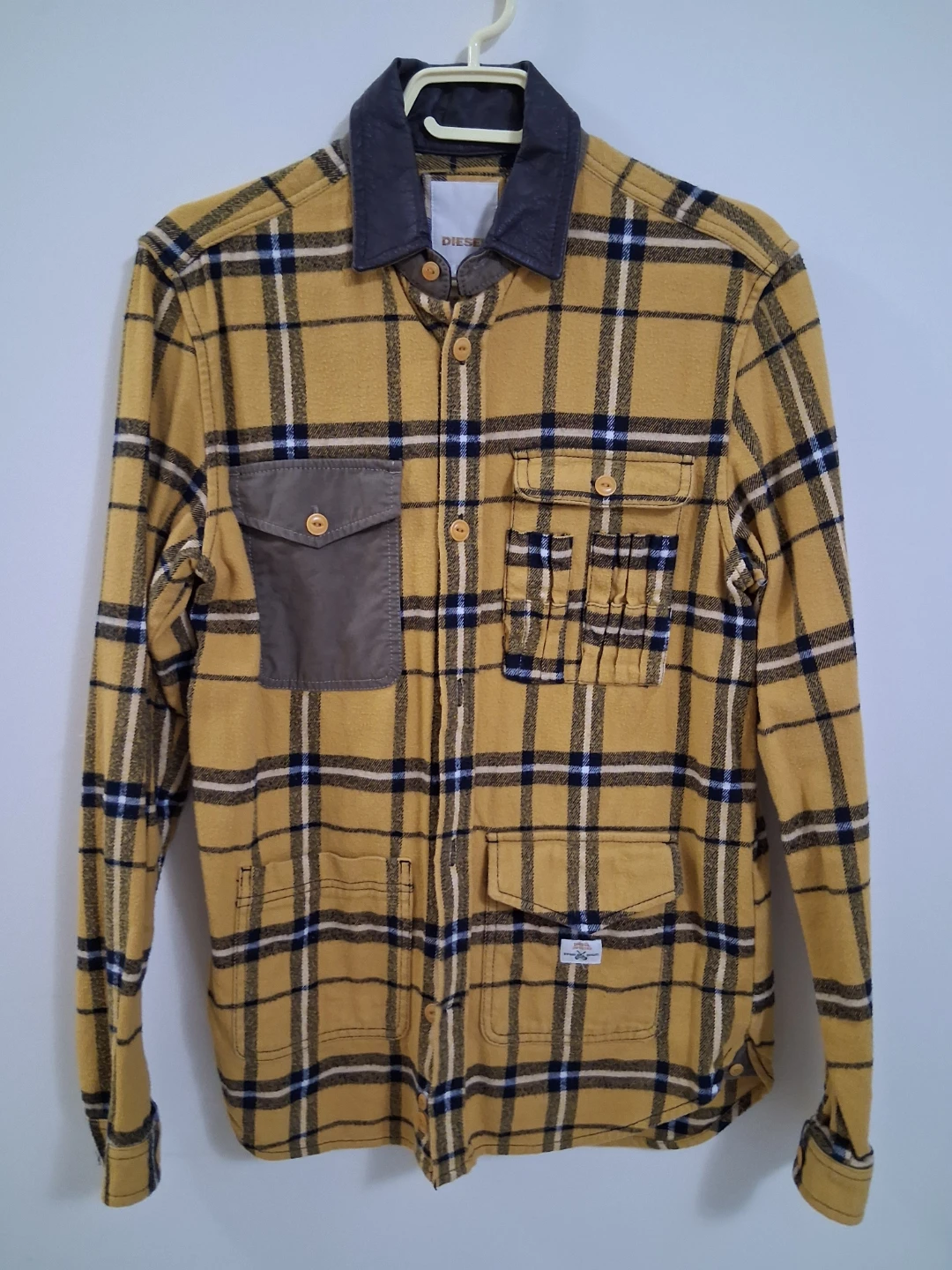 Selling a Diesel flannel shirt in size small. The shirt is yellow with a plaid pattern and has a leather collar. It's made of 100% cotton and in great condition!