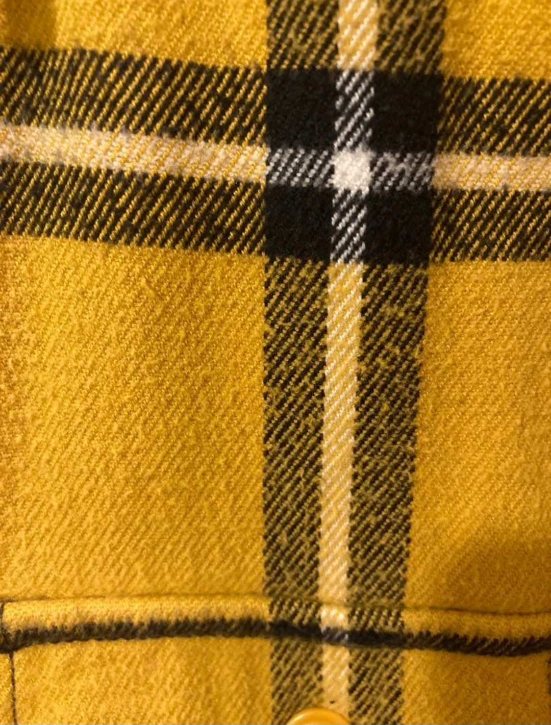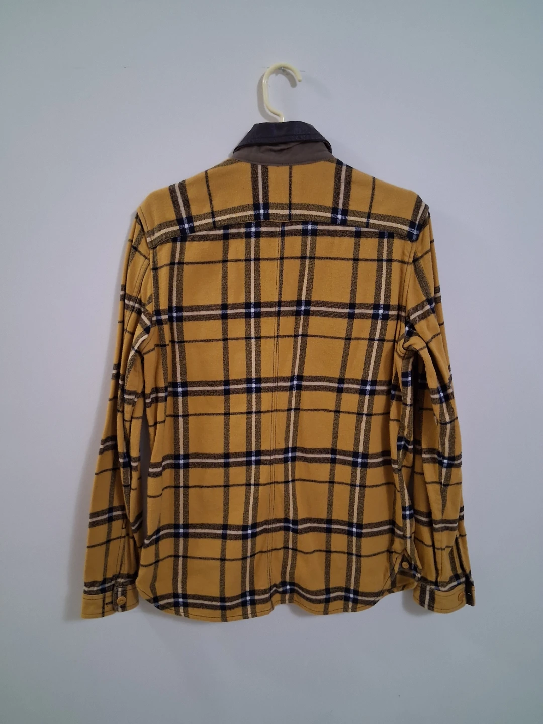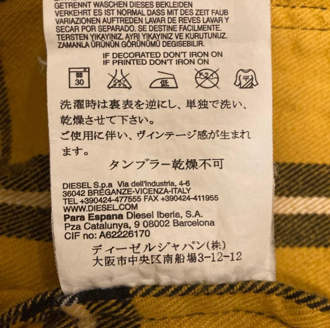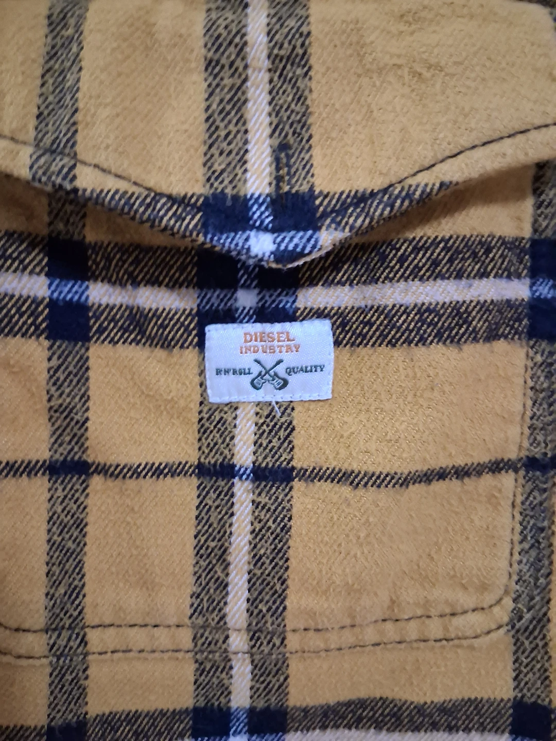 Selling a Diesel flannel shirt in size small. The shirt is yellow with a plaid pattern and has a leather collar. It's made of 100% cotton and in great condition!