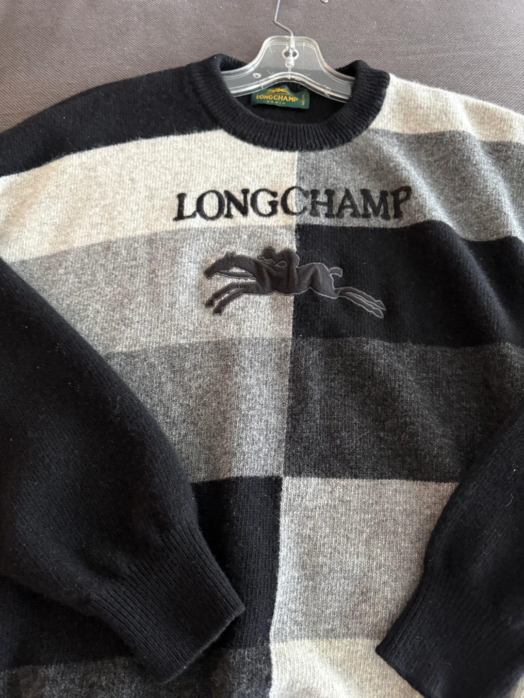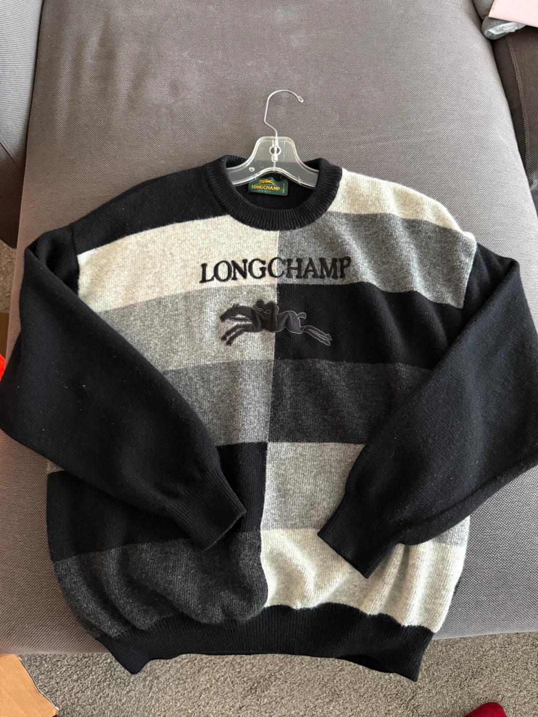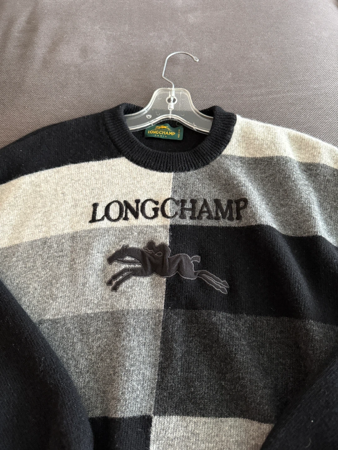 Here's a stylish Longchamp wool sweater! It features a unique patchwork design in black and grey. Perfect for adding a touch of luxury to your wardrobe!