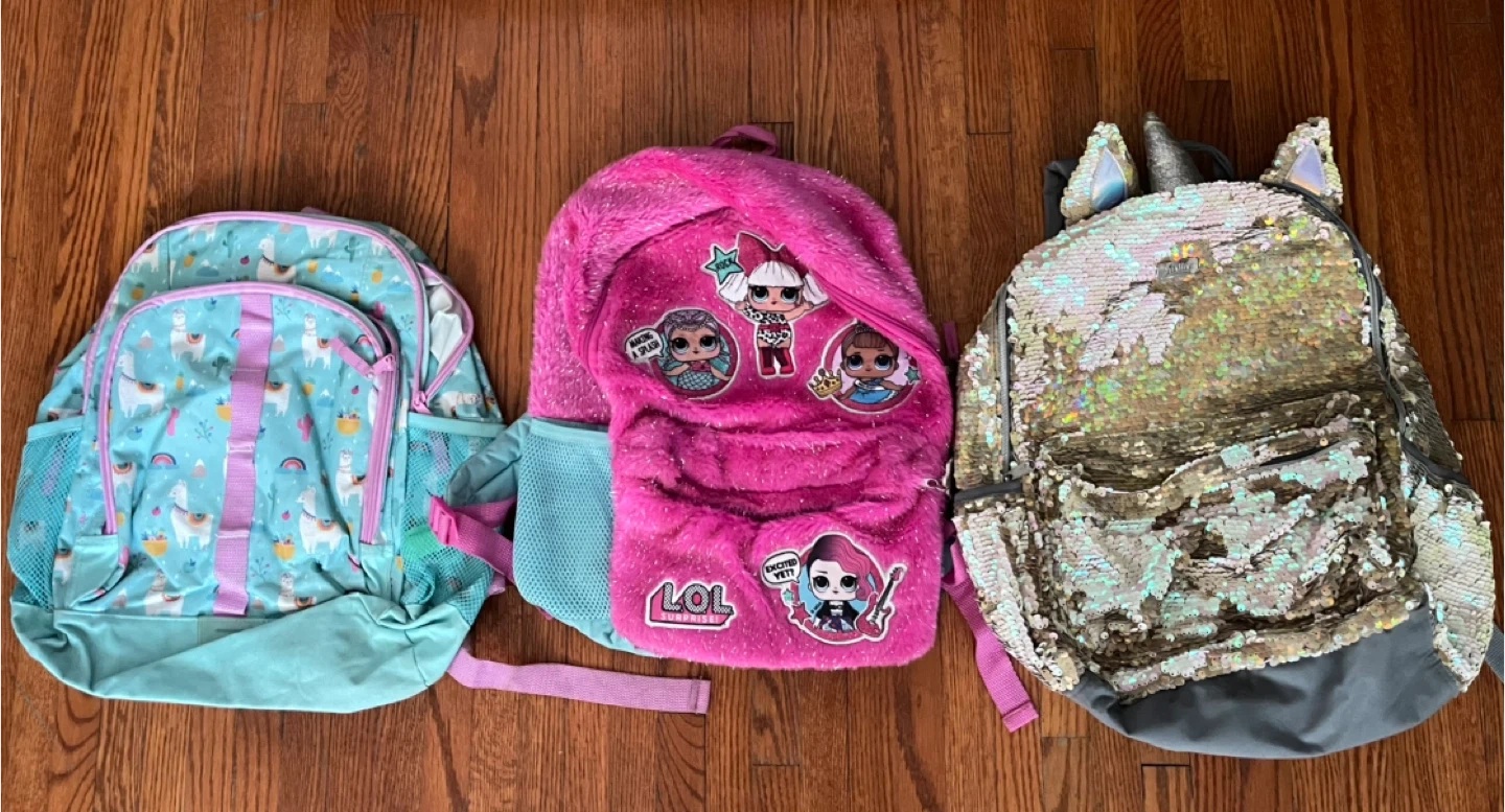 Selling a bundle of three kids' backpacks! There's a Justice sequin backpack with unicorn ears, a pink LOL Surprise backpack, and a light blue backpack with a llama print. All are in good used condition and ready for new adventures!