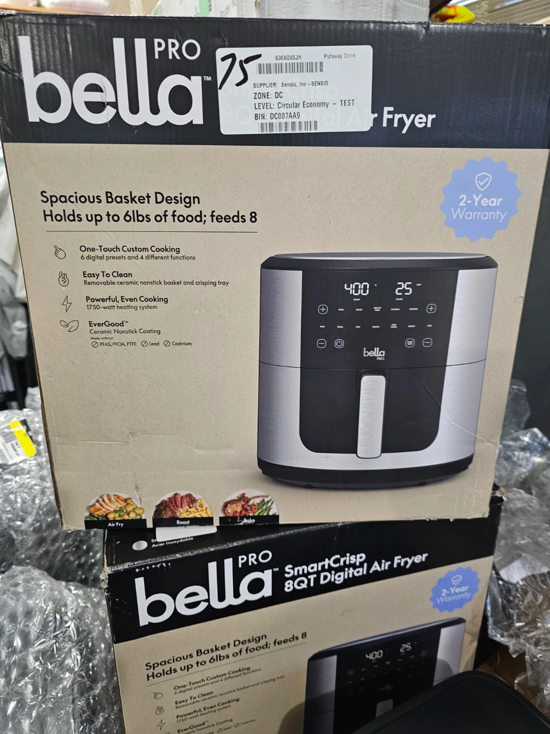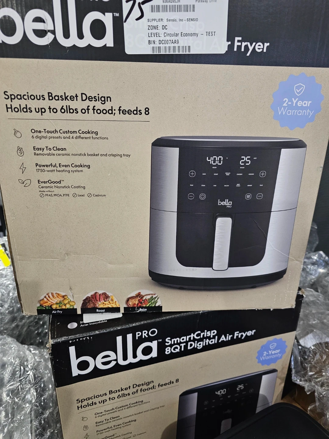 Selling a brand new Bella Pro SmartCrisp 8QT Digital Air Fryer! It has a spacious basket design that holds up to 6lbs of food, enough to feed 8 people. It features one-touch custom cooking with 6 digital presets and 4 different functions, and it's easy to clean with a removable ceramic nonstick basket and crisping tray. Also boasts a powerful, even cooking 1750-watt heating system. The box is included
