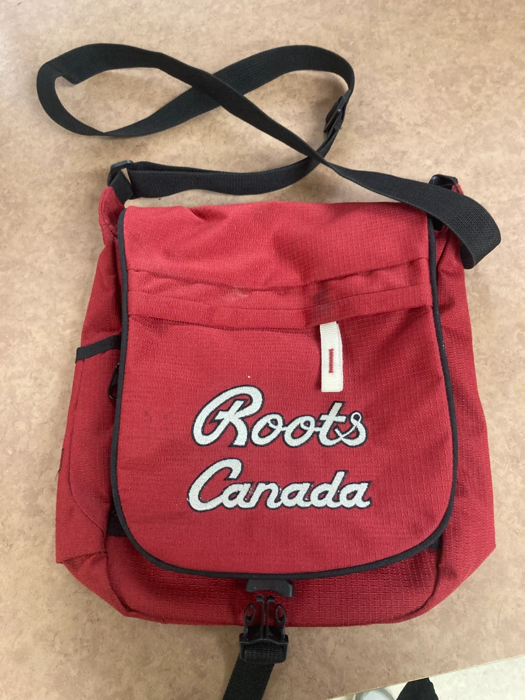 Selling a Roots Canada messenger bag in red! It features a black strap and trim, with the Roots Canada logo embroidered on the front. There's a Canadian flag detail as well. Perfect for everyday use or travel!