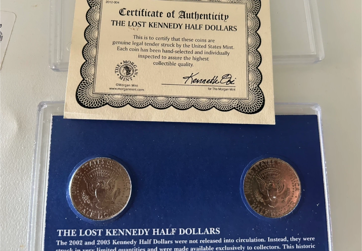 Selling a set of The Lost Kennedy Half Dollars. These coins are genuine legal tender struck by the United States Mint. Each coin has been hand-selected and individually inspected to assure the highest collectible quality. The 2002 and 2003 Kennedy Half Dollars were not released into circulation and were made available exclusively to collectors