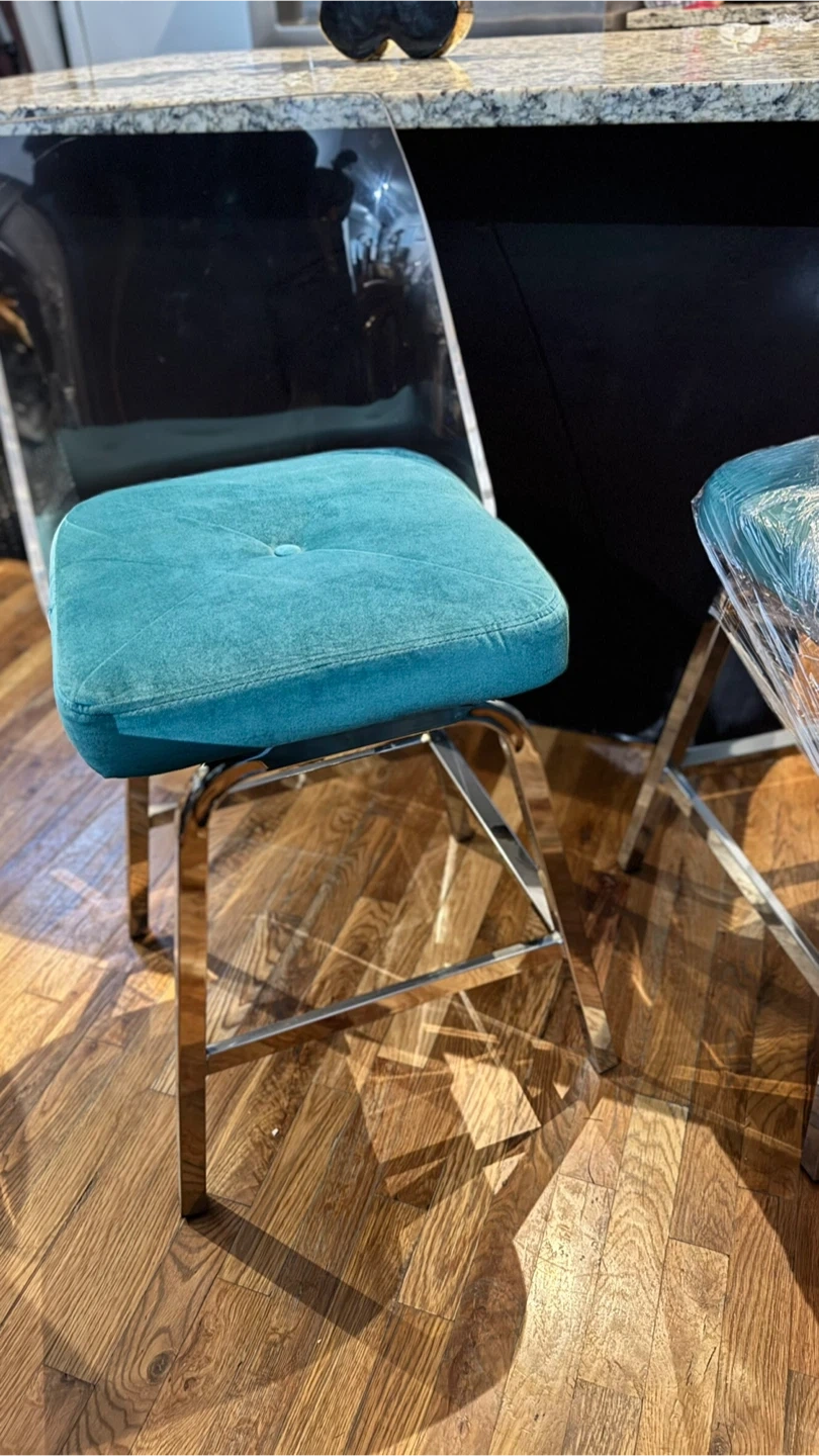 * Plush, velvet-upholstered seat available in blue steel, navy blue, and teal
