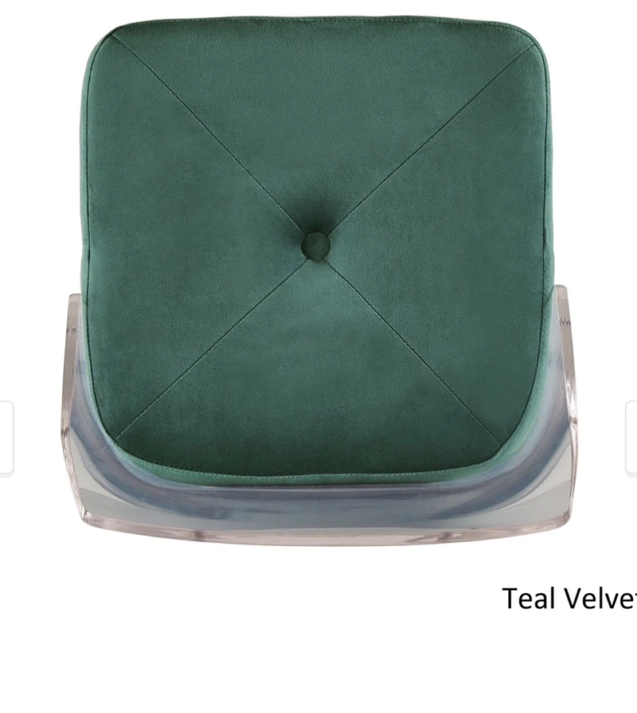 This is an iNSPIRE Q Bold Lennox counter height swivel stool with a teal velvet cushion and a clear acrylic backrest.