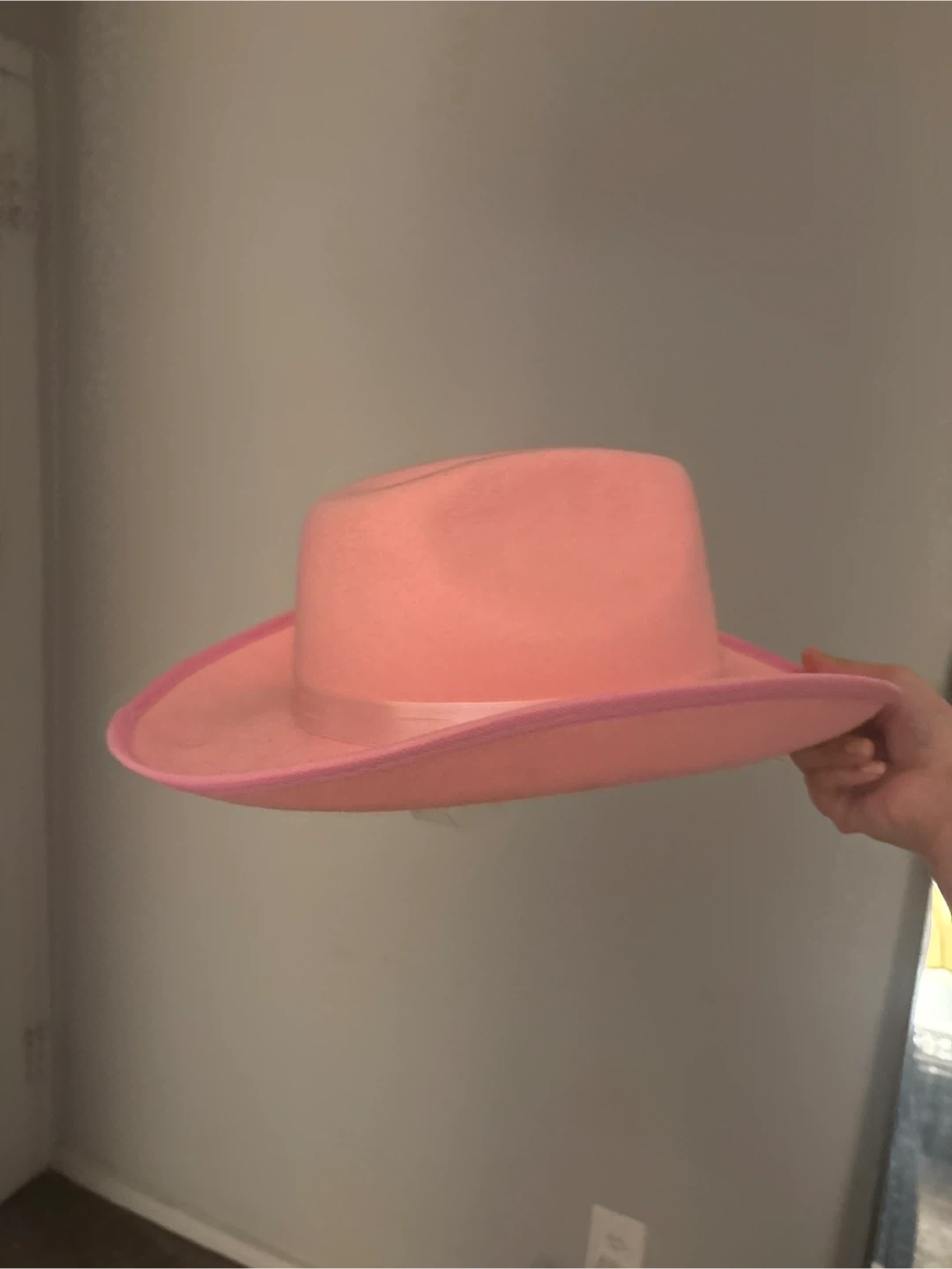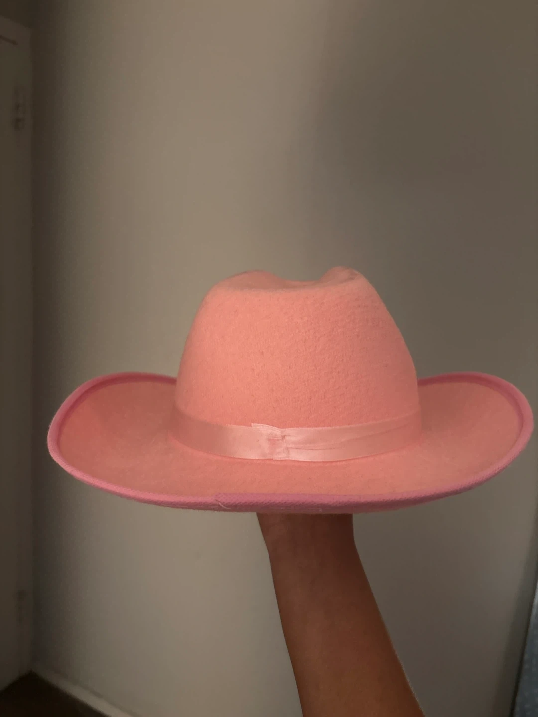 Selling a cute pink cowboy hat! It's in great condition and perfect for adding a fun touch to any outfit. The hat features a classic cowboy shape and a ribbon detail. It's a fun accessory to have!