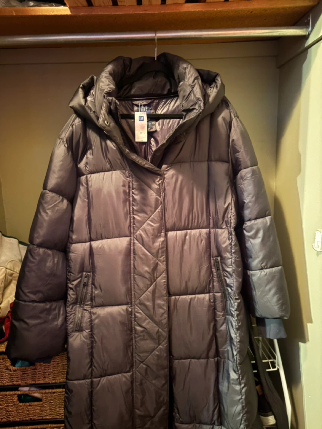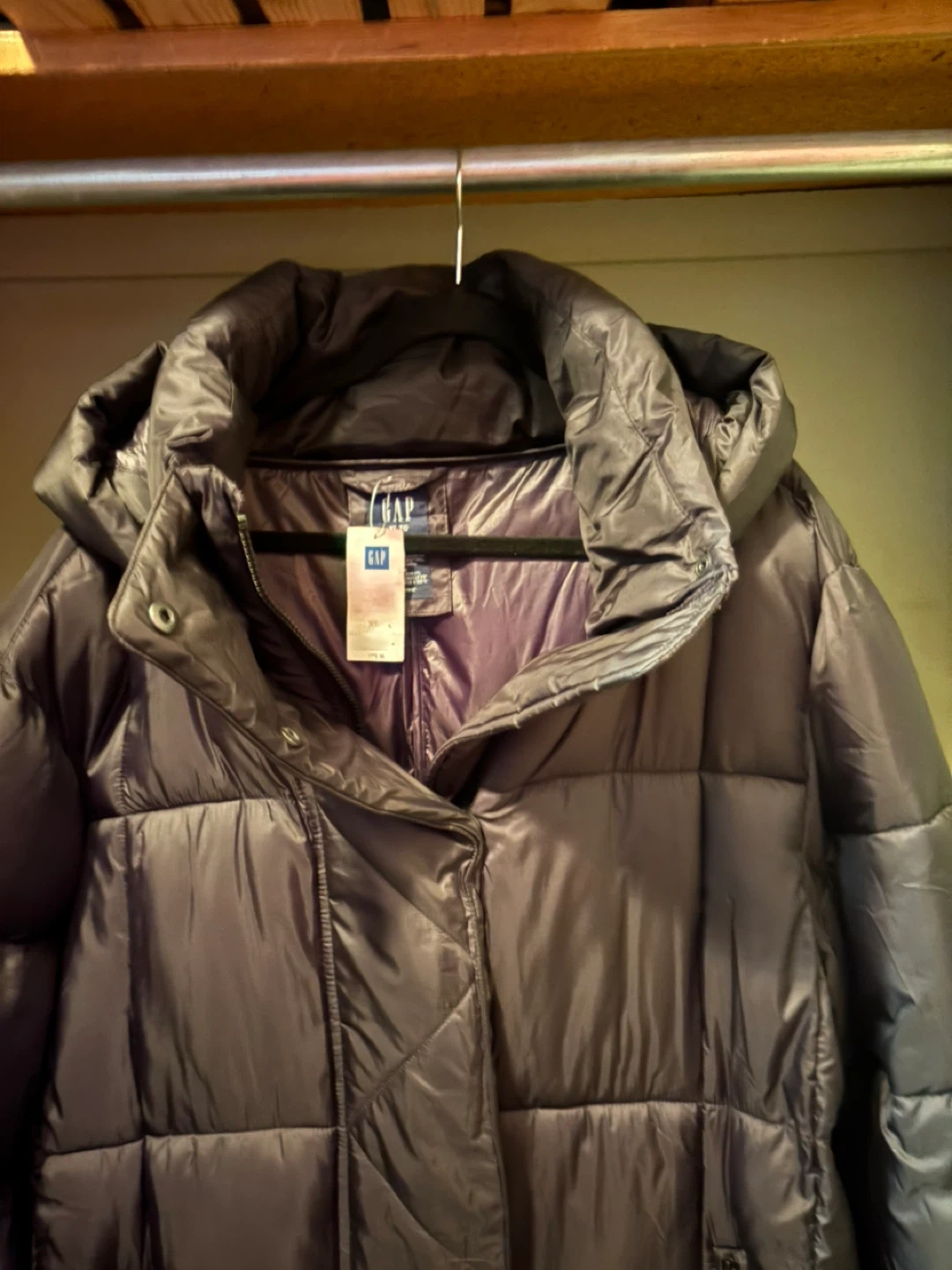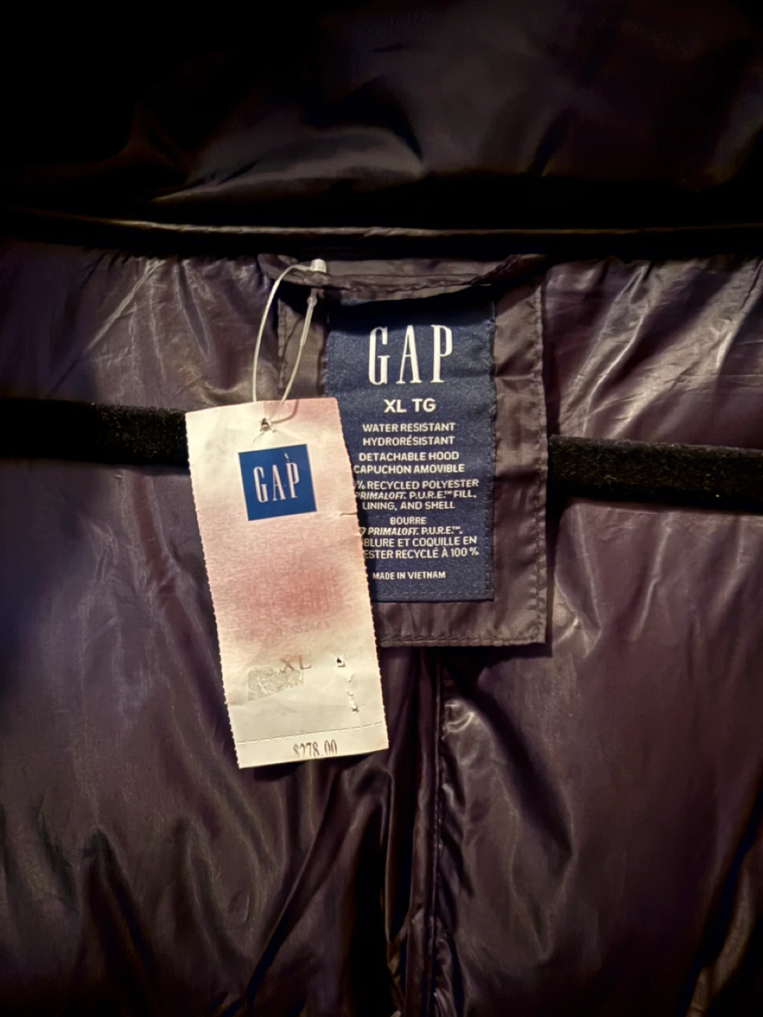 I'm selling a Gap water-resistant puffer coat in size XL. It has a detachable hood and is made of recycled polyester. Originally bought for $278