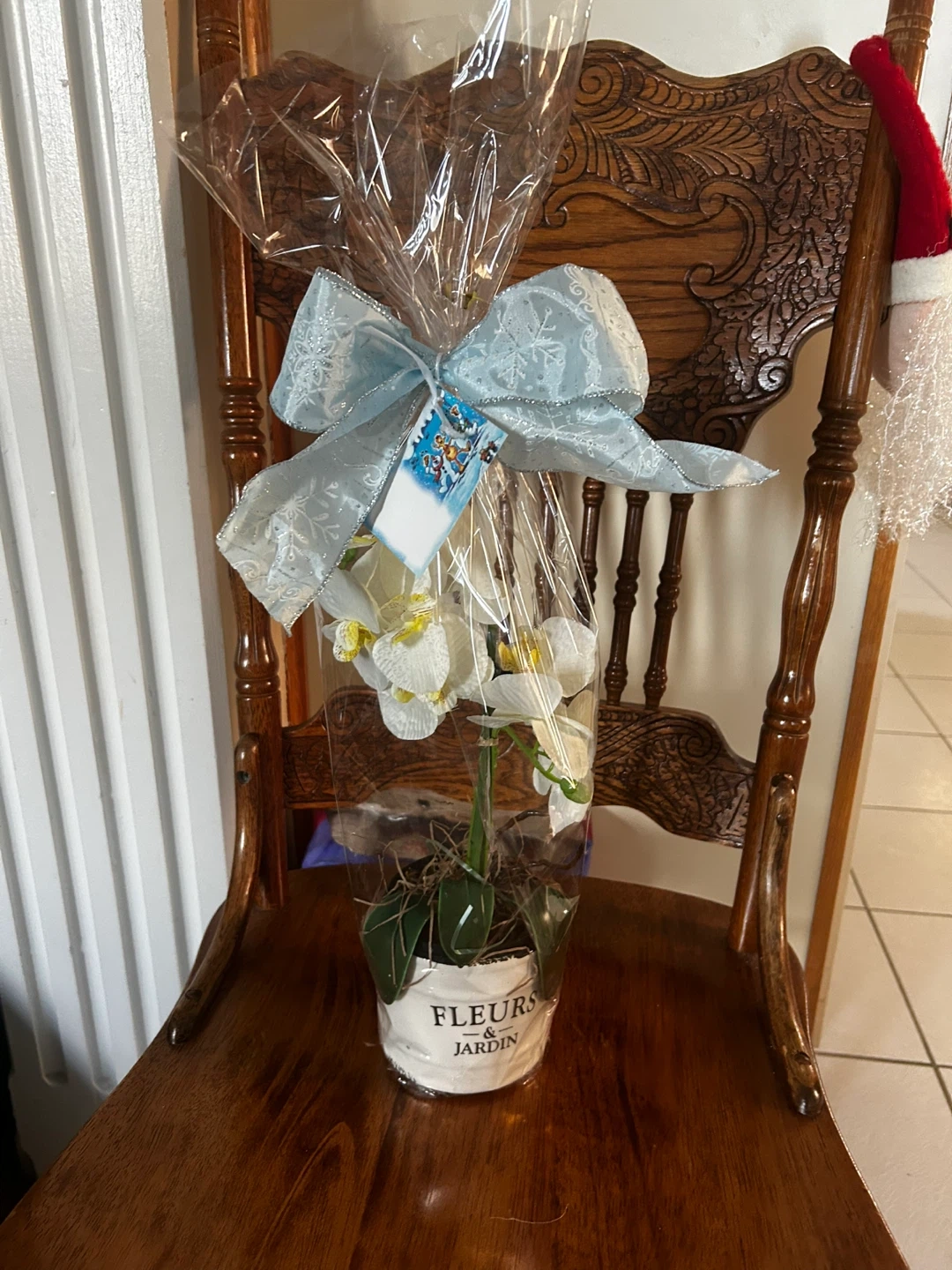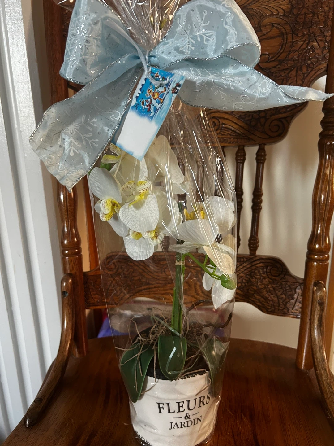 Here's a beautiful orchid plant, all wrapped up and ready to brighten your space! It's in great condition and would make a lovely addition to any room