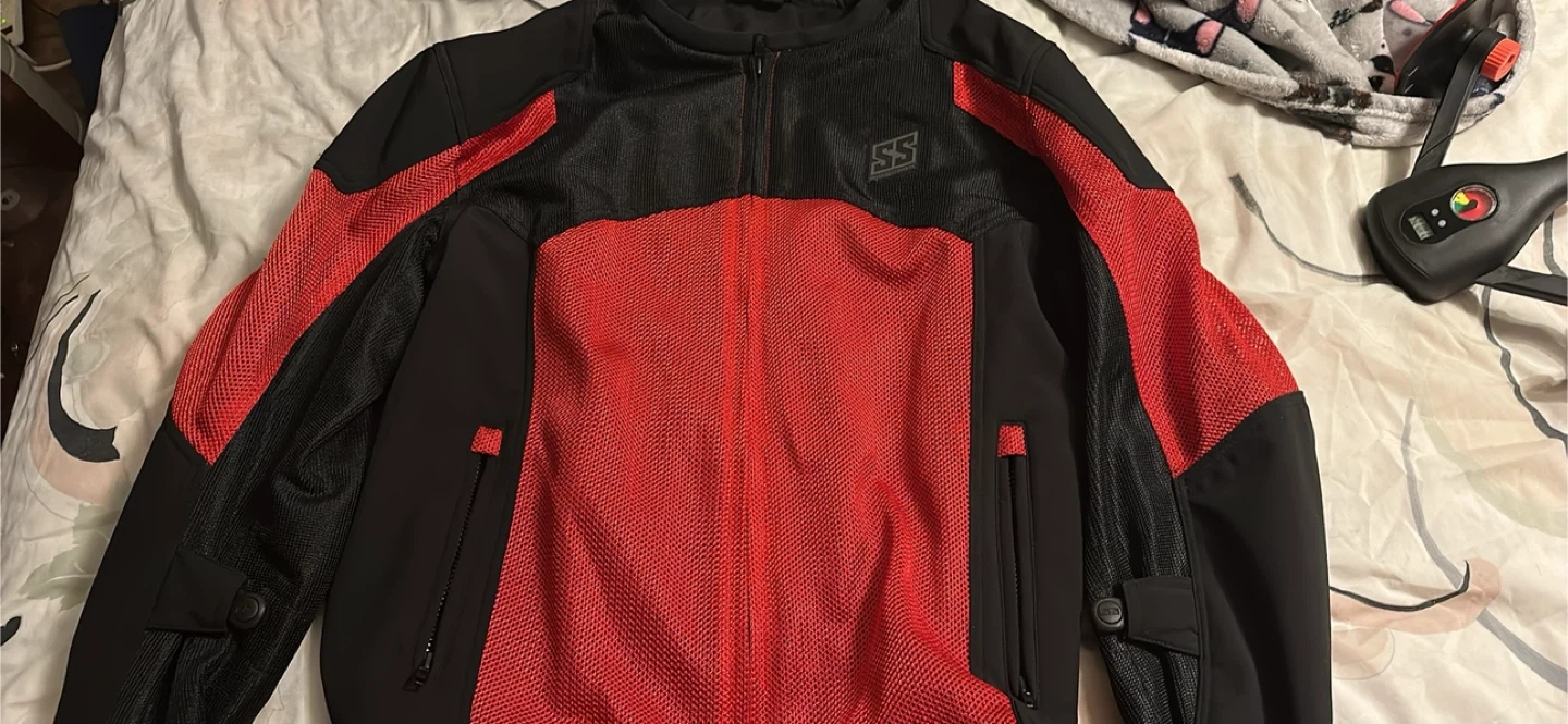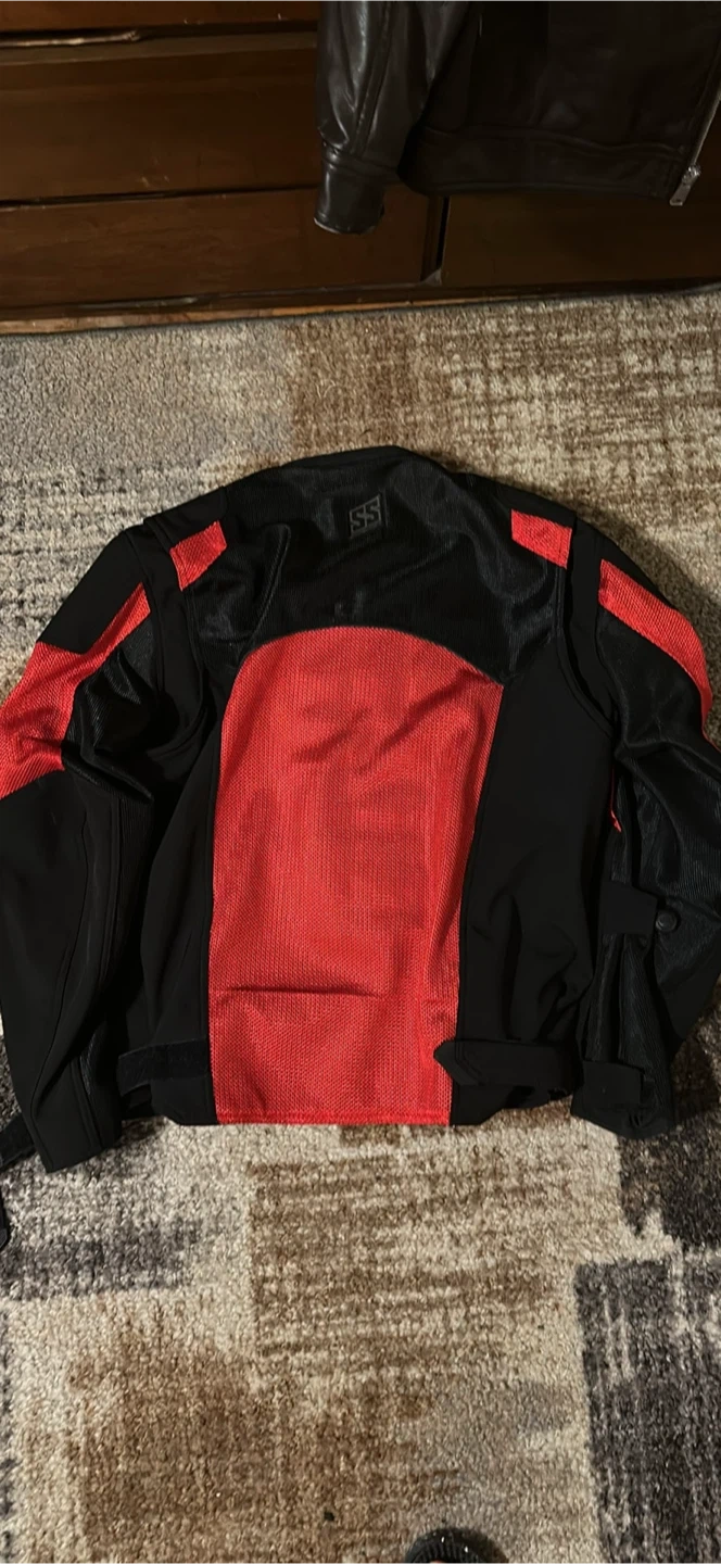 Selling a Speed and Strength motorcycle jacket in red and black. The jacket is made of 100% polyester shell and lining. It also has Vault Armor Systems.