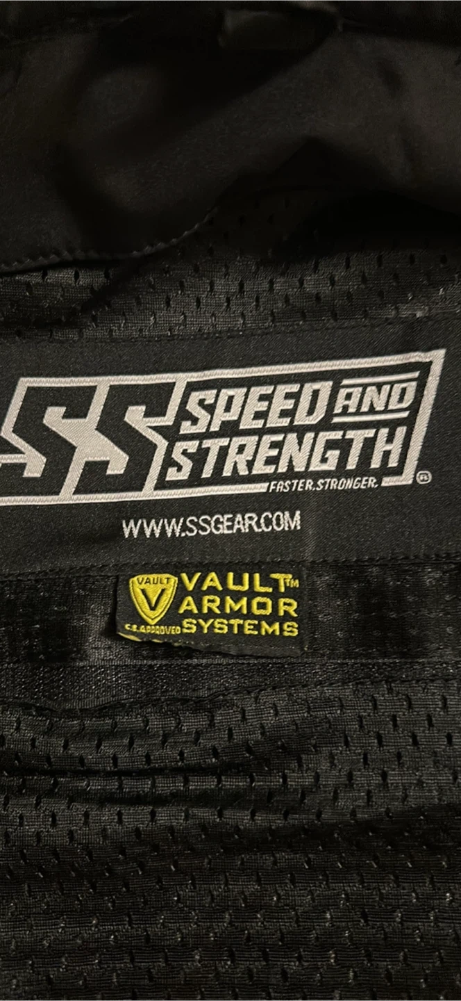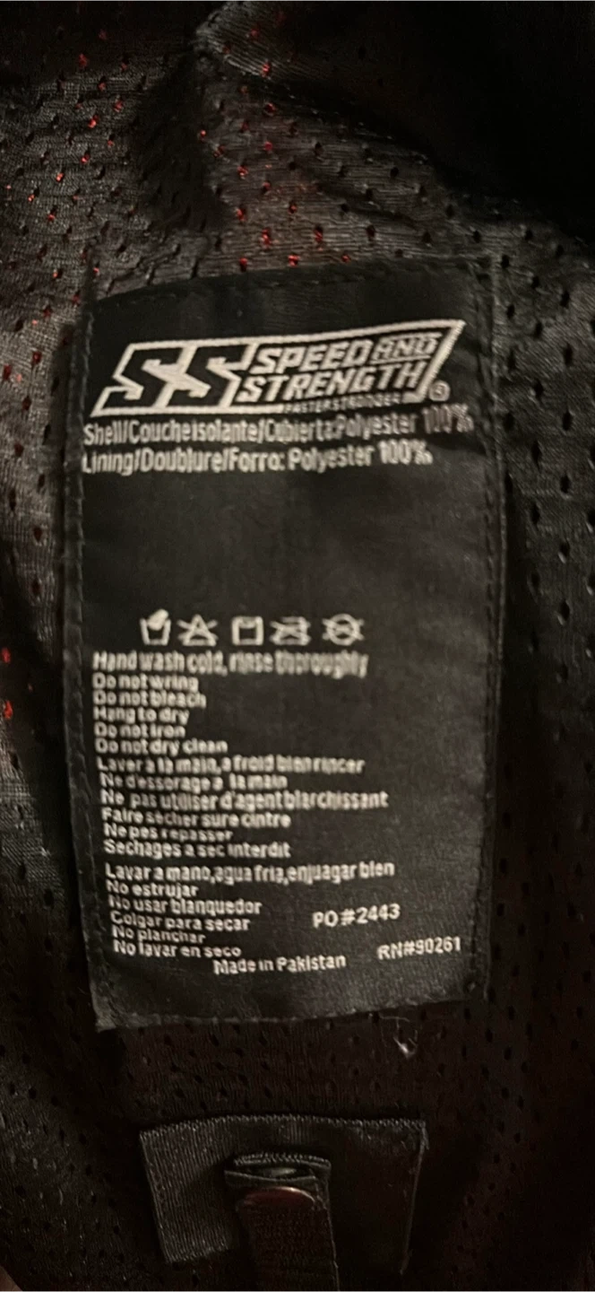 Selling a Speed and Strength motorcycle jacket in red and black. The jacket is made of 100% polyester shell and lining. It also has Vault Armor Systems.