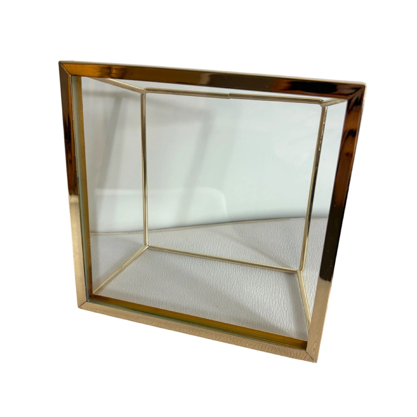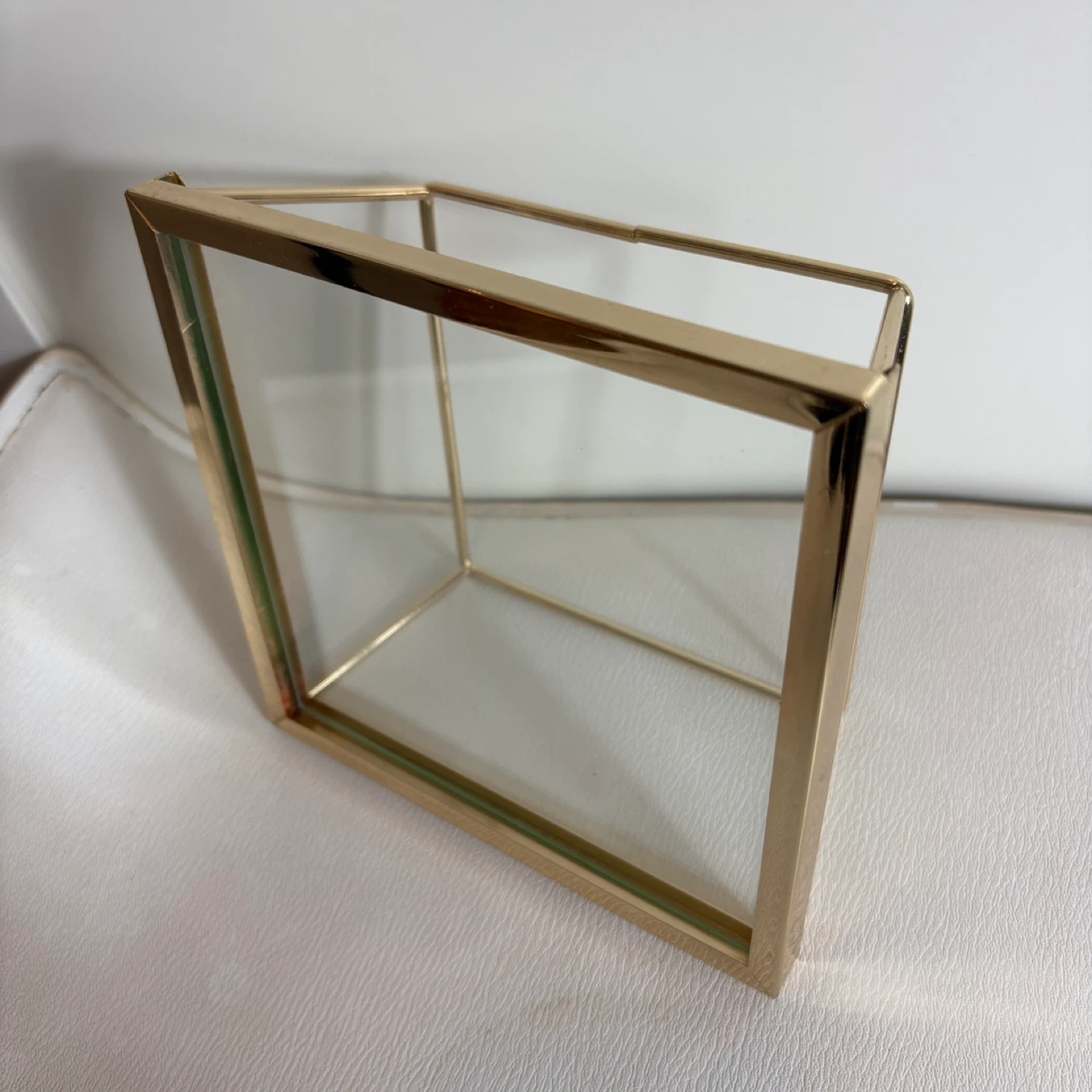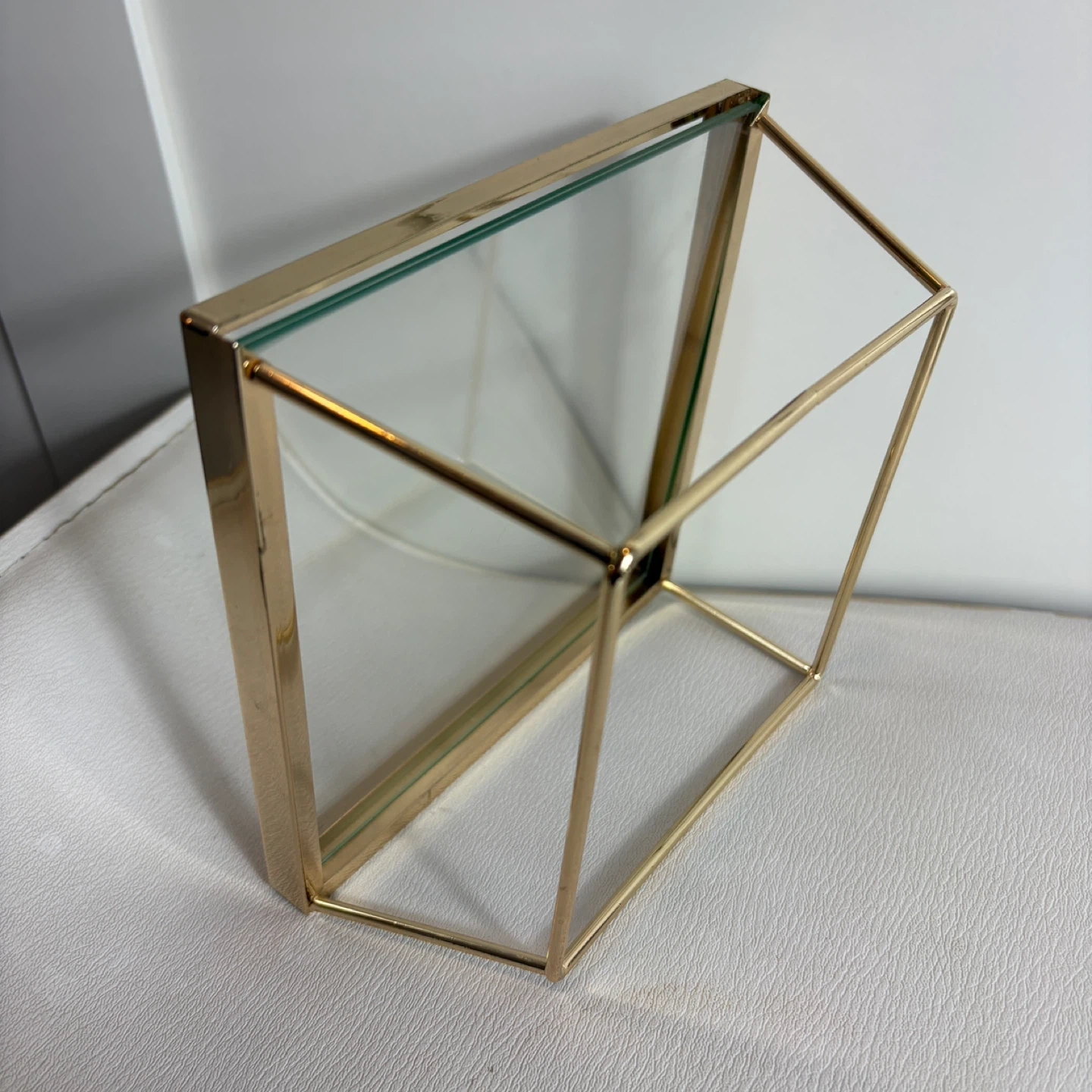 Modern gold metal and glass geometric picture frame in a square 6" x 6" size. Features a sleek open-frame design that looks great on shelves or desks. Perfect for displaying photos, art prints, or pressed flowers.