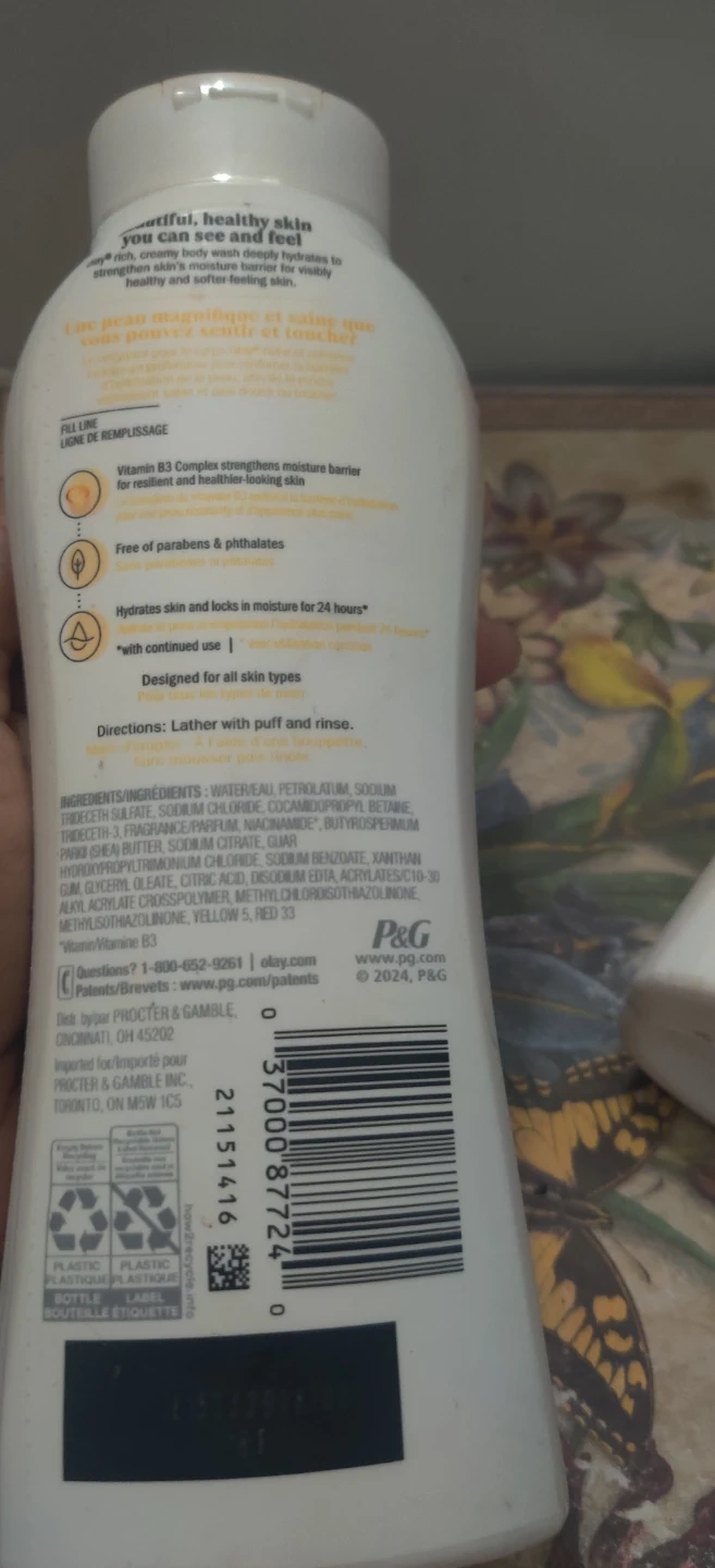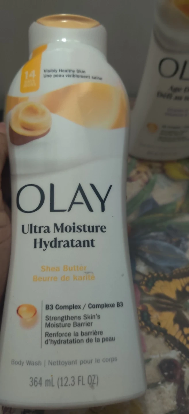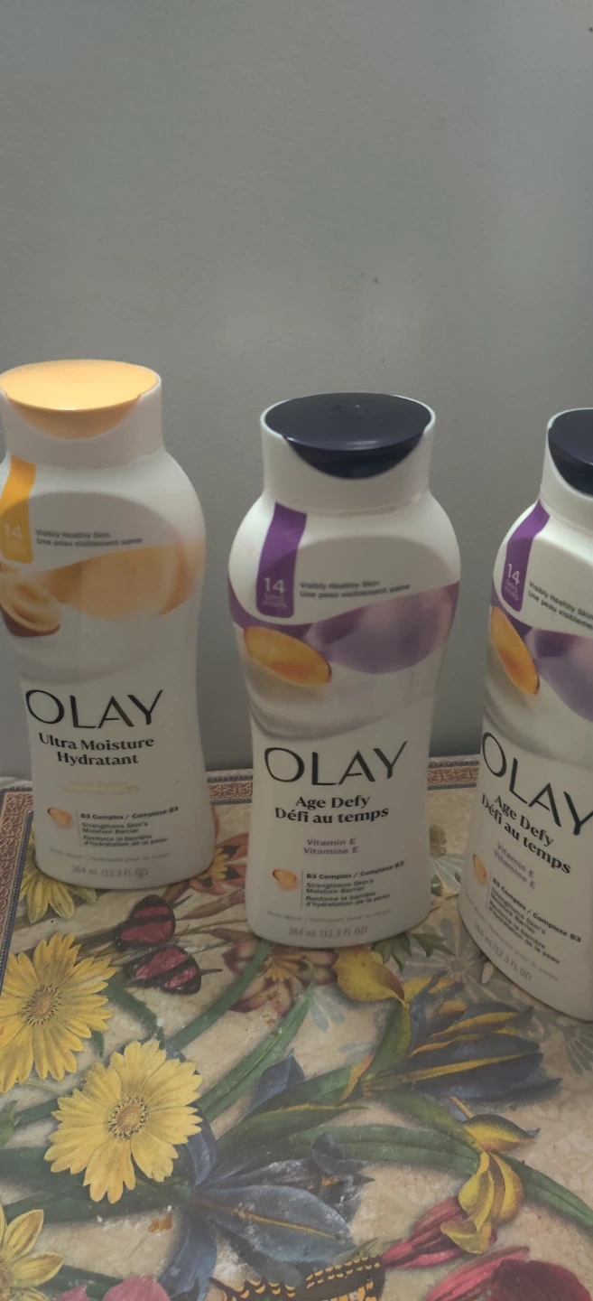 I have 3 Olay body wash available. There is one bottle of Ultra Moisture Hydratant Shea Butter, and two bottles of Age Defy Vitamin E. Each bottle contains 364 mL (12.3 FL OZ).