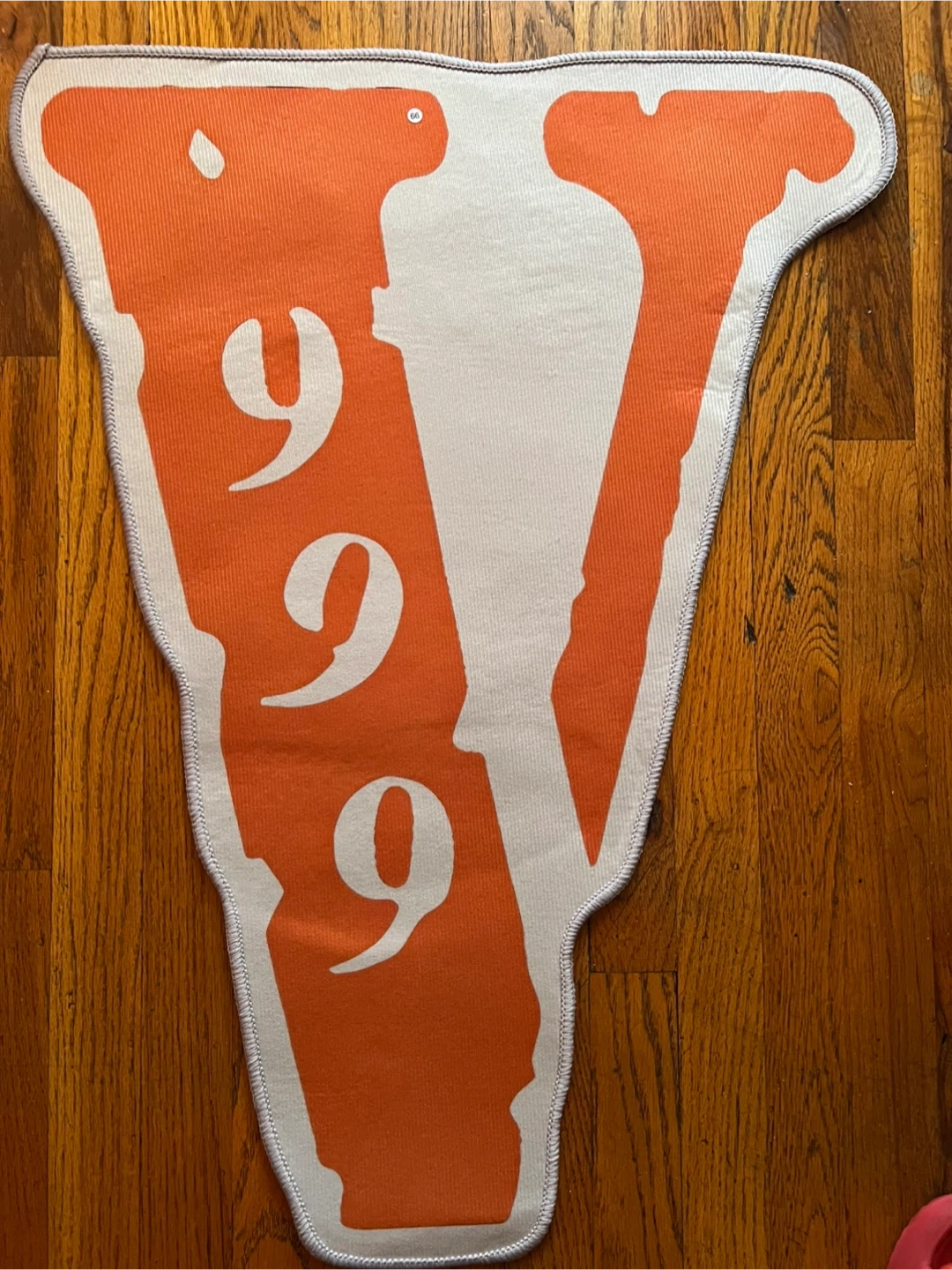 Vlone wall art/rug with the 999 design. The wall art/rug features an orange and white color scheme. It's a great statement piece for any room!