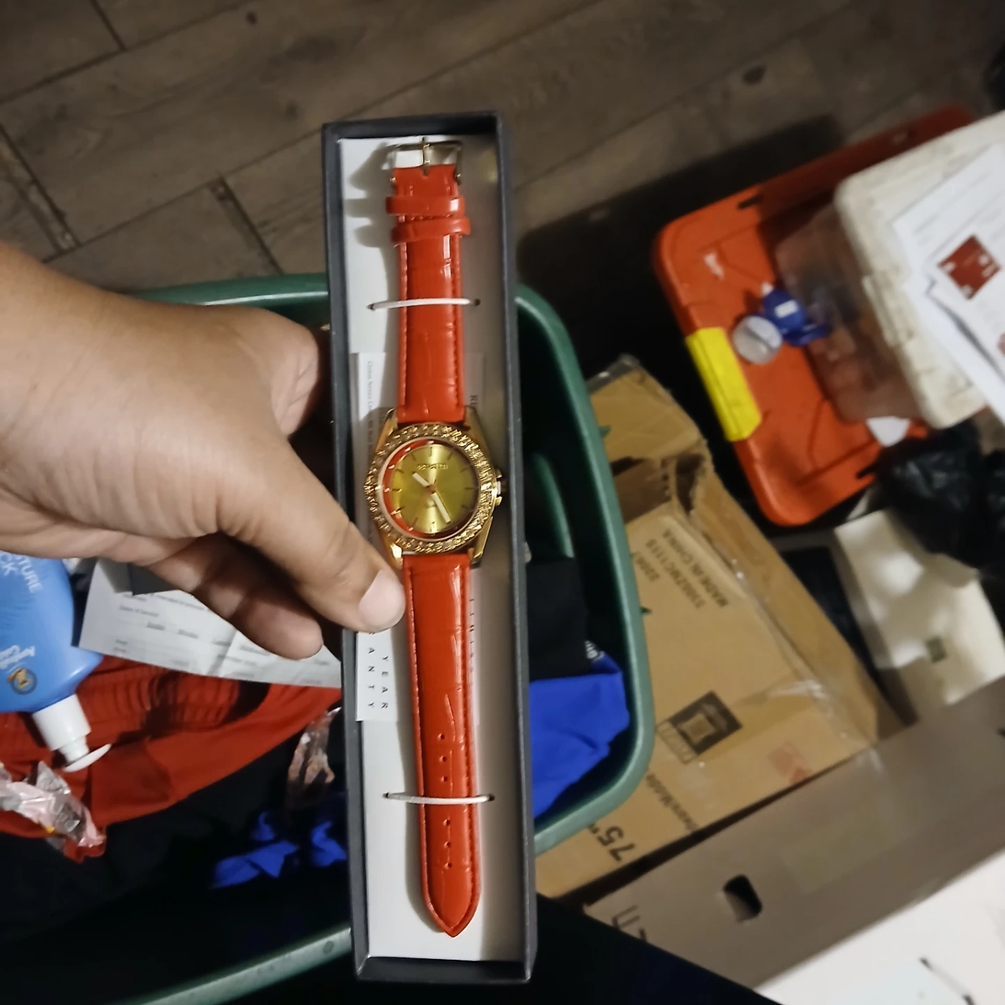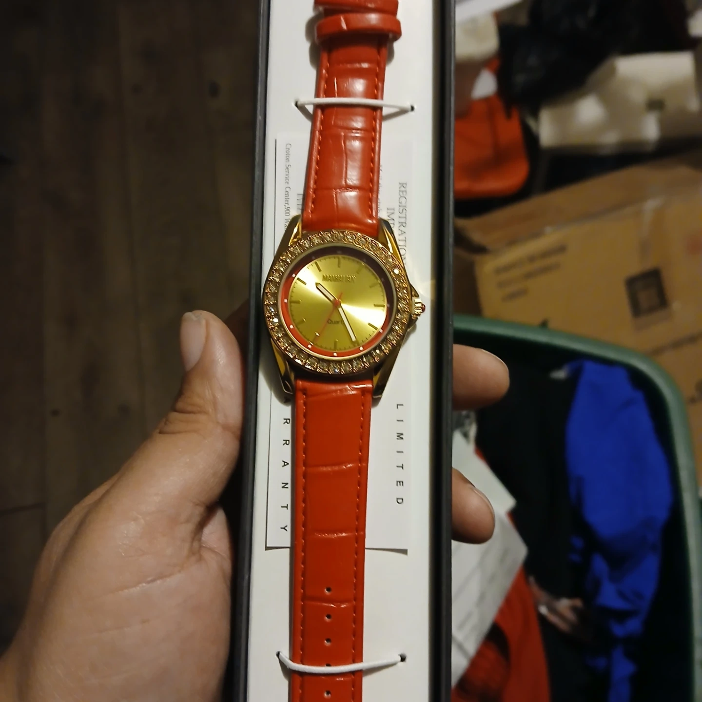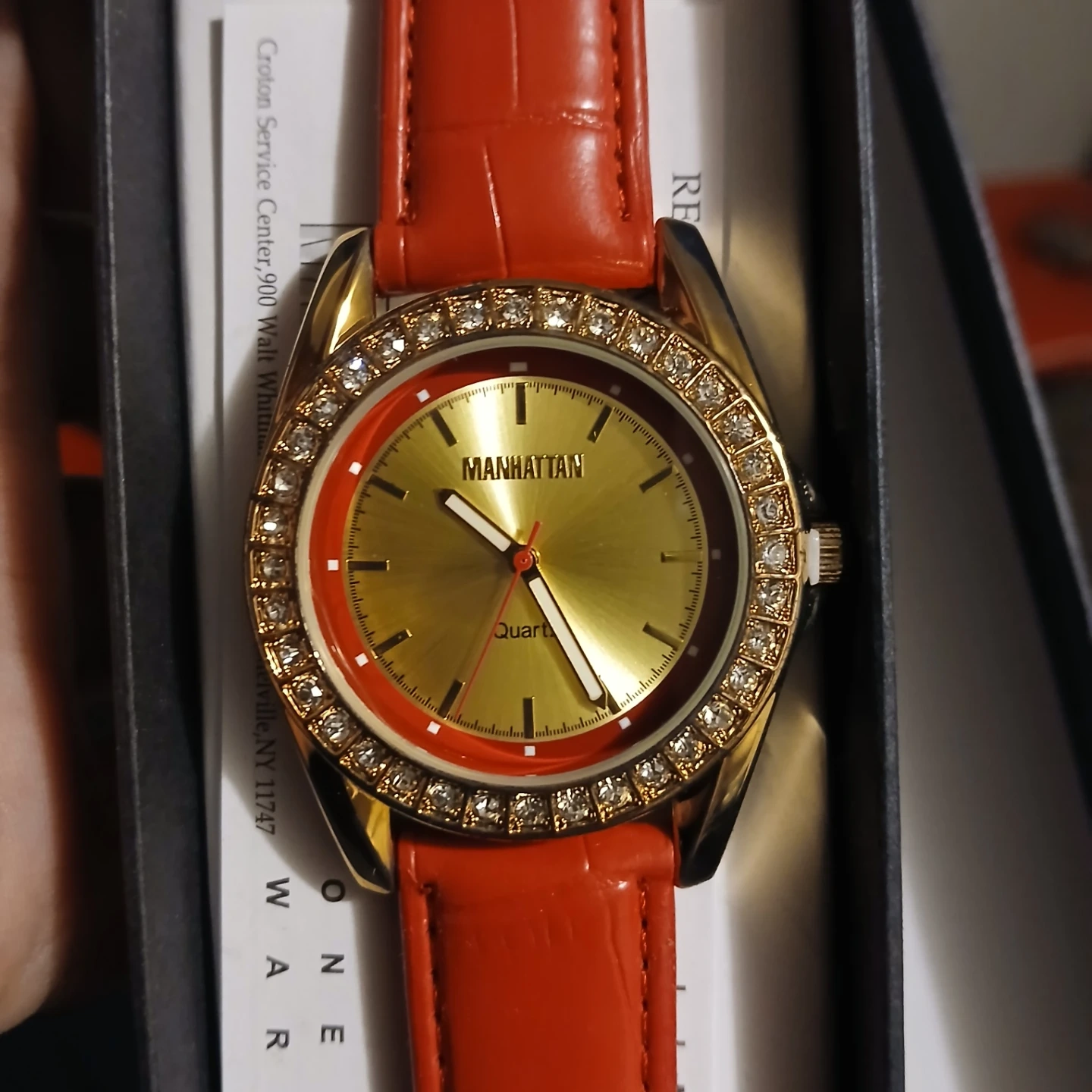 Selling a Manhattan Quartz watch with a striking red strap and gold-tone face! The watch is in excellent condition and comes with its original box. It has a beautiful design with crystal accents around the face. A great accessory to add a pop of color to your outfit!