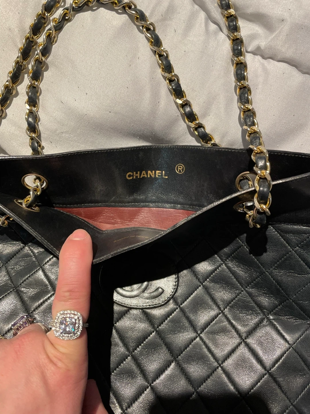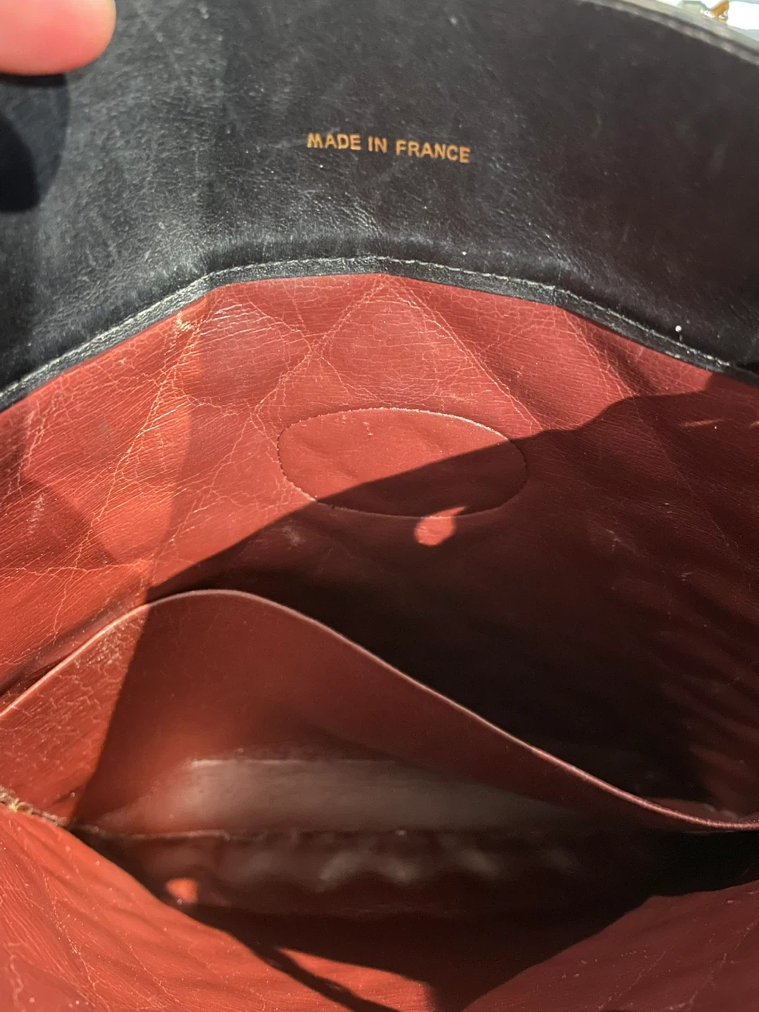 Selling a stylish Chanel tote bag! It's made in France and features a classic quilted design with gold-tone chain straps. The interior is a beautiful red colour. A great addition to any wardrobe!