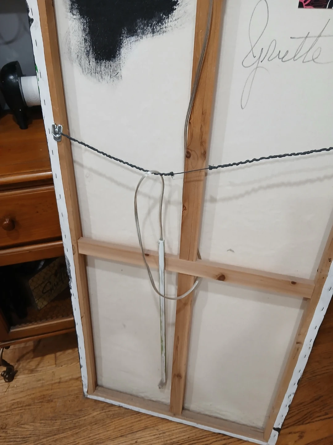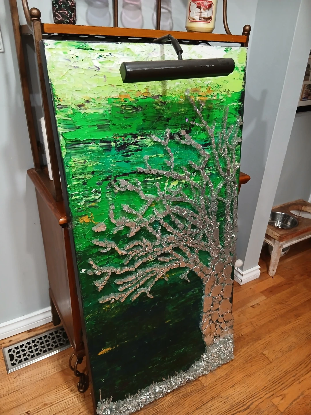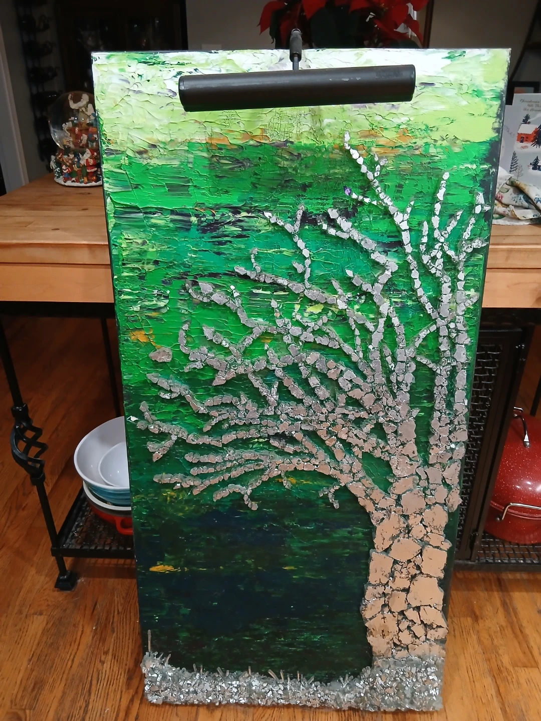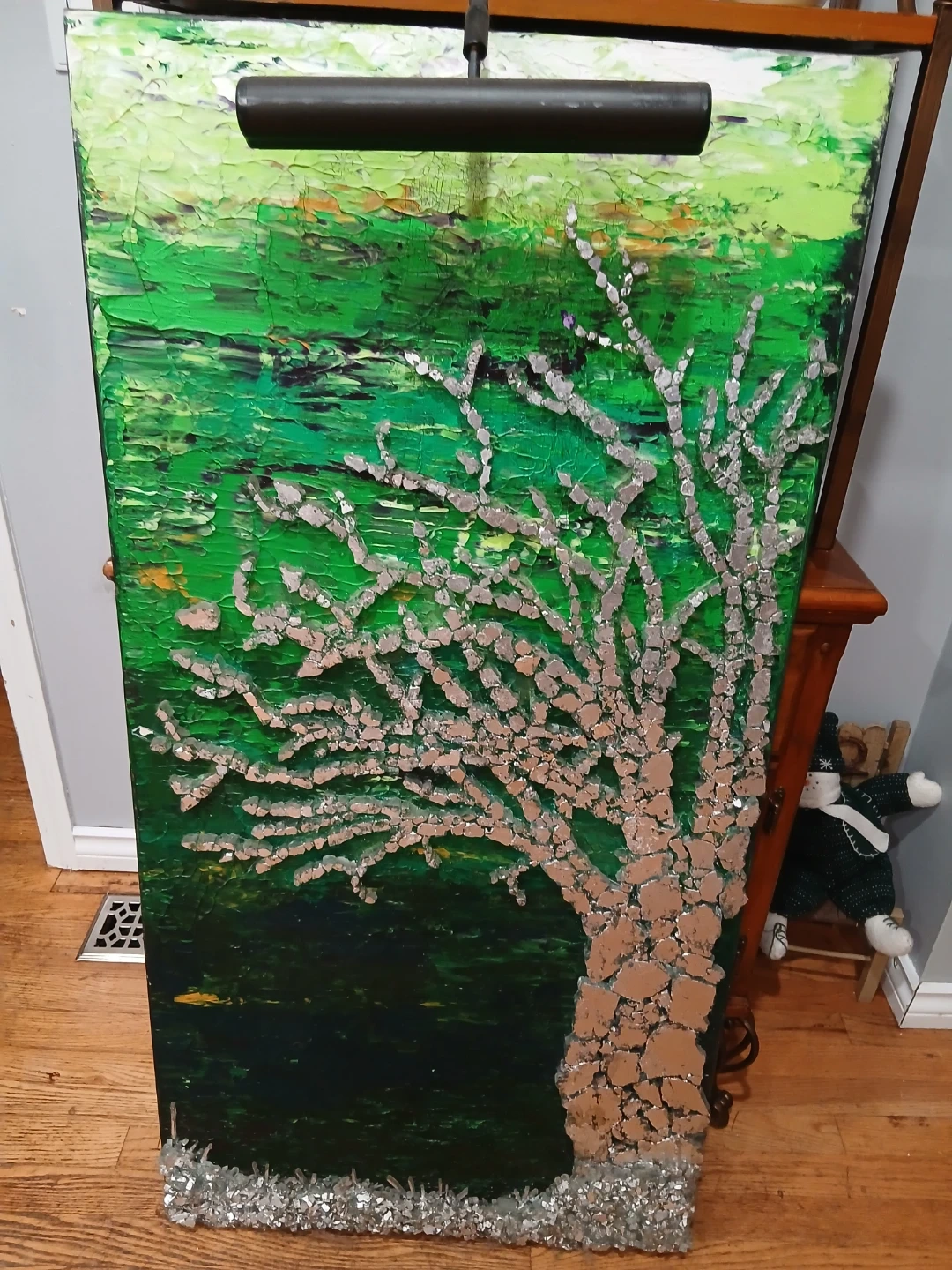 Unique abstract painting featuring a tree design with a mounted light. It's a striking piece of art that could add character to any room! Please note that the artist's signature is visible on the back.