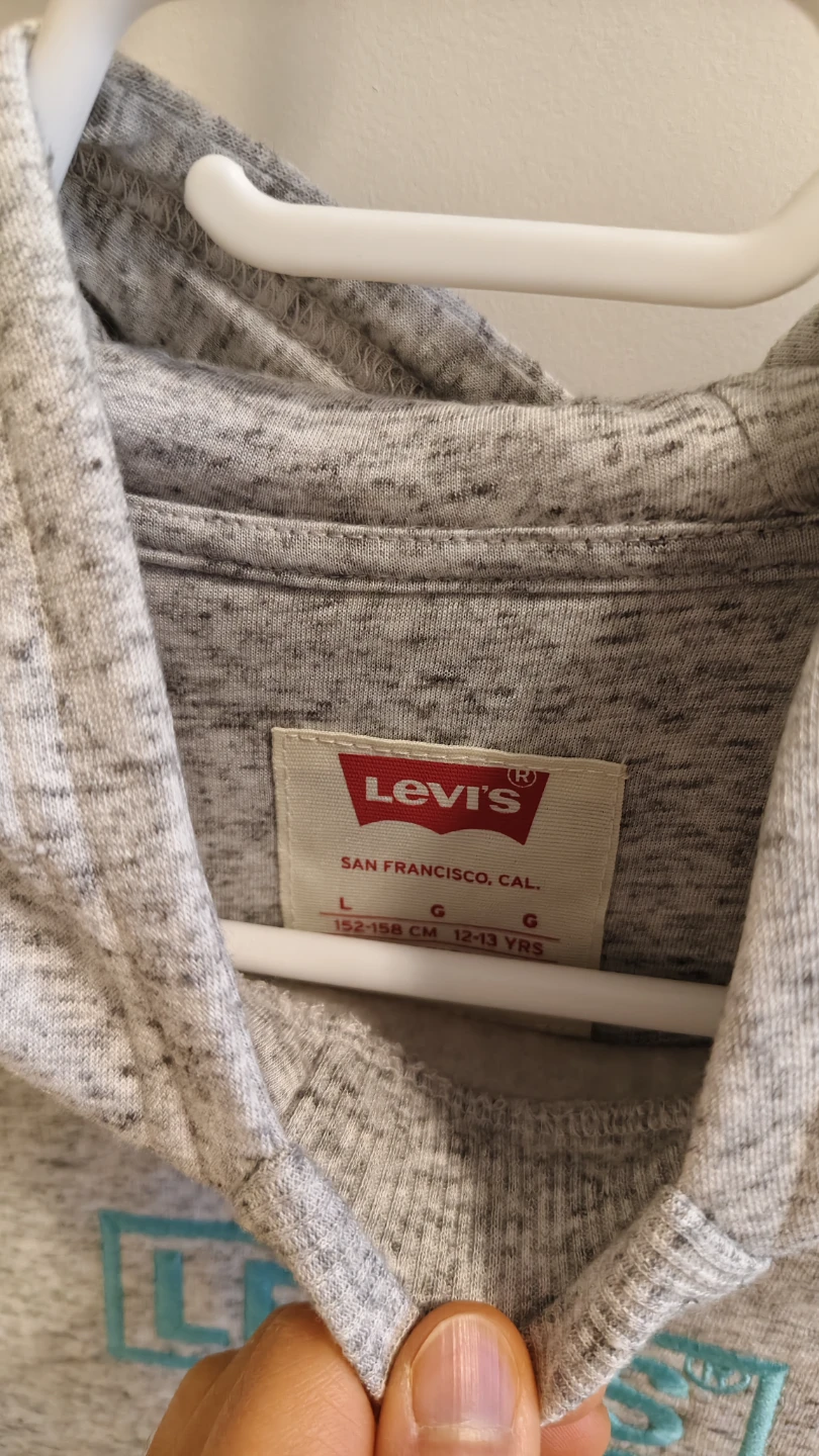 Selling a new Levi's hoodie in size L, suitable for kids aged 12-13 years (152-158 cm). It's a stylish grey colour with the Levi's logo on the front. Perfect for everyday wear!