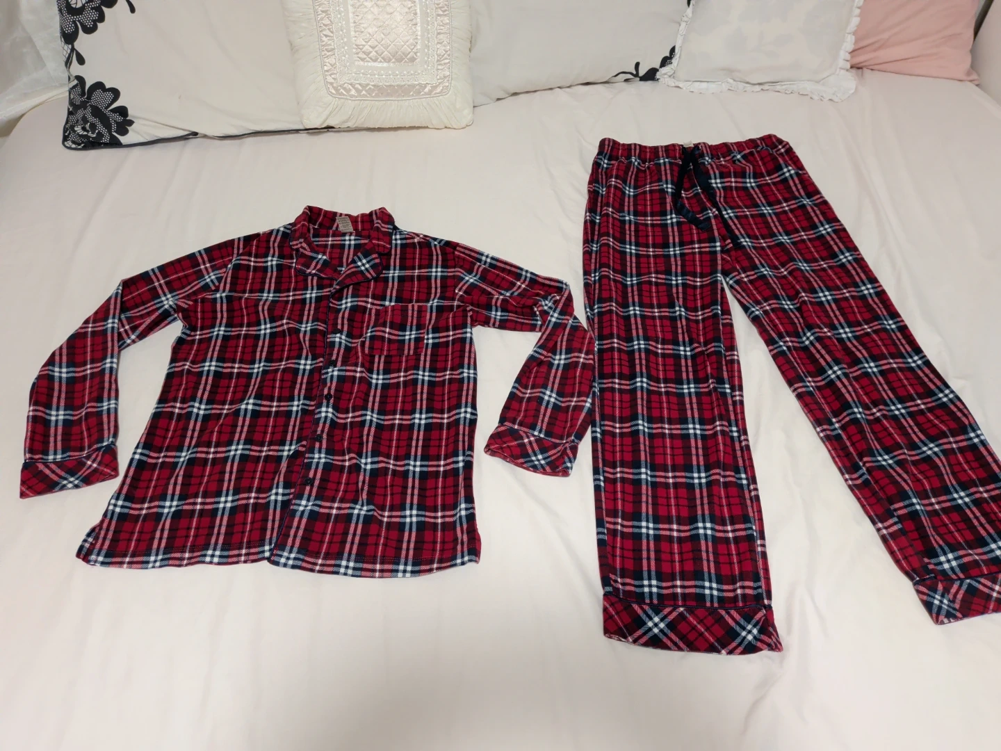Cozy red plaid flannel pajama set! Perfect for those chilly evenings. The set includes a long-sleeved button-up top and matching pants with an elastic waistband. It's in great condition and ready for a new owner! Exactly what is needed for the holidays !