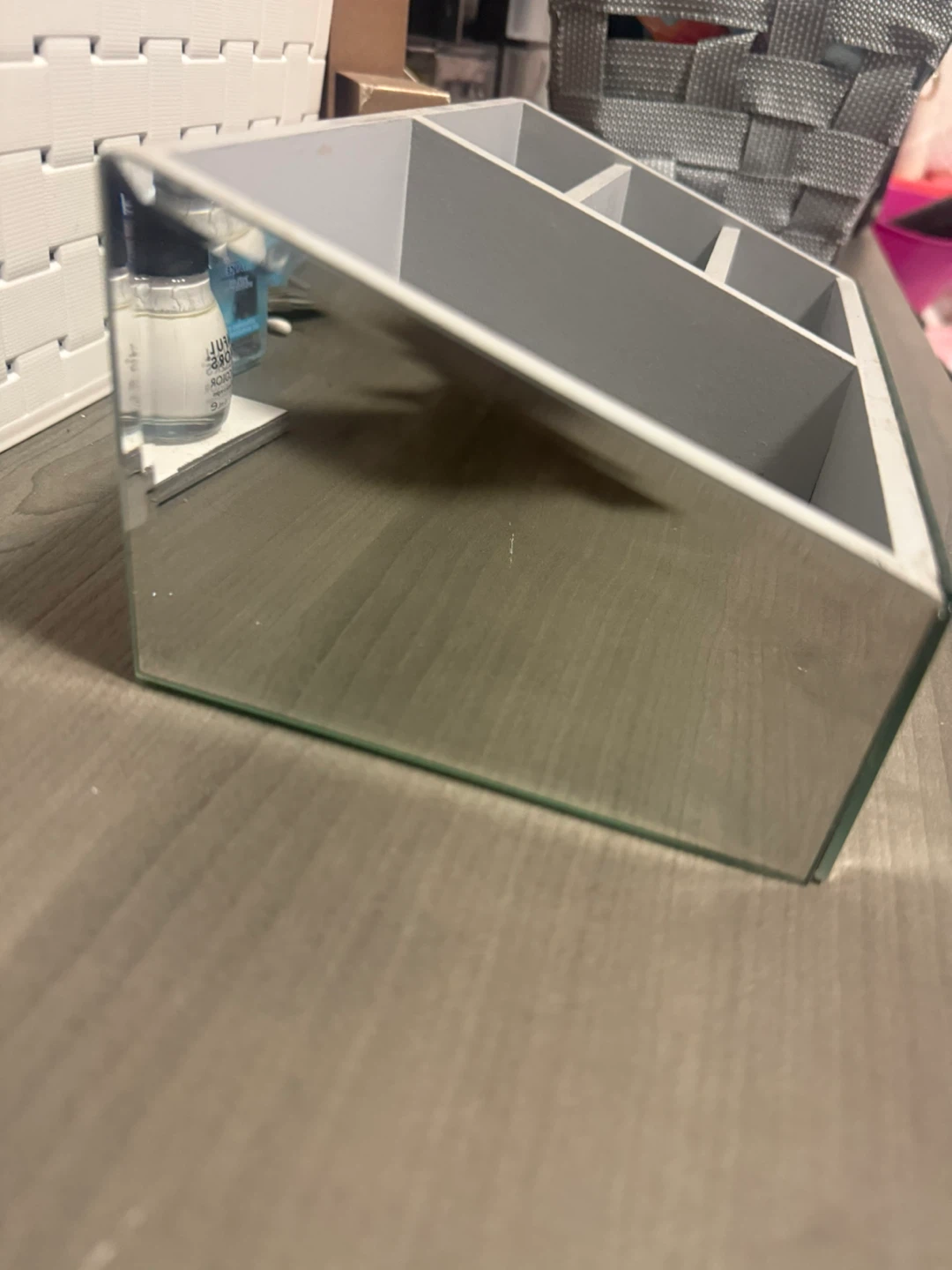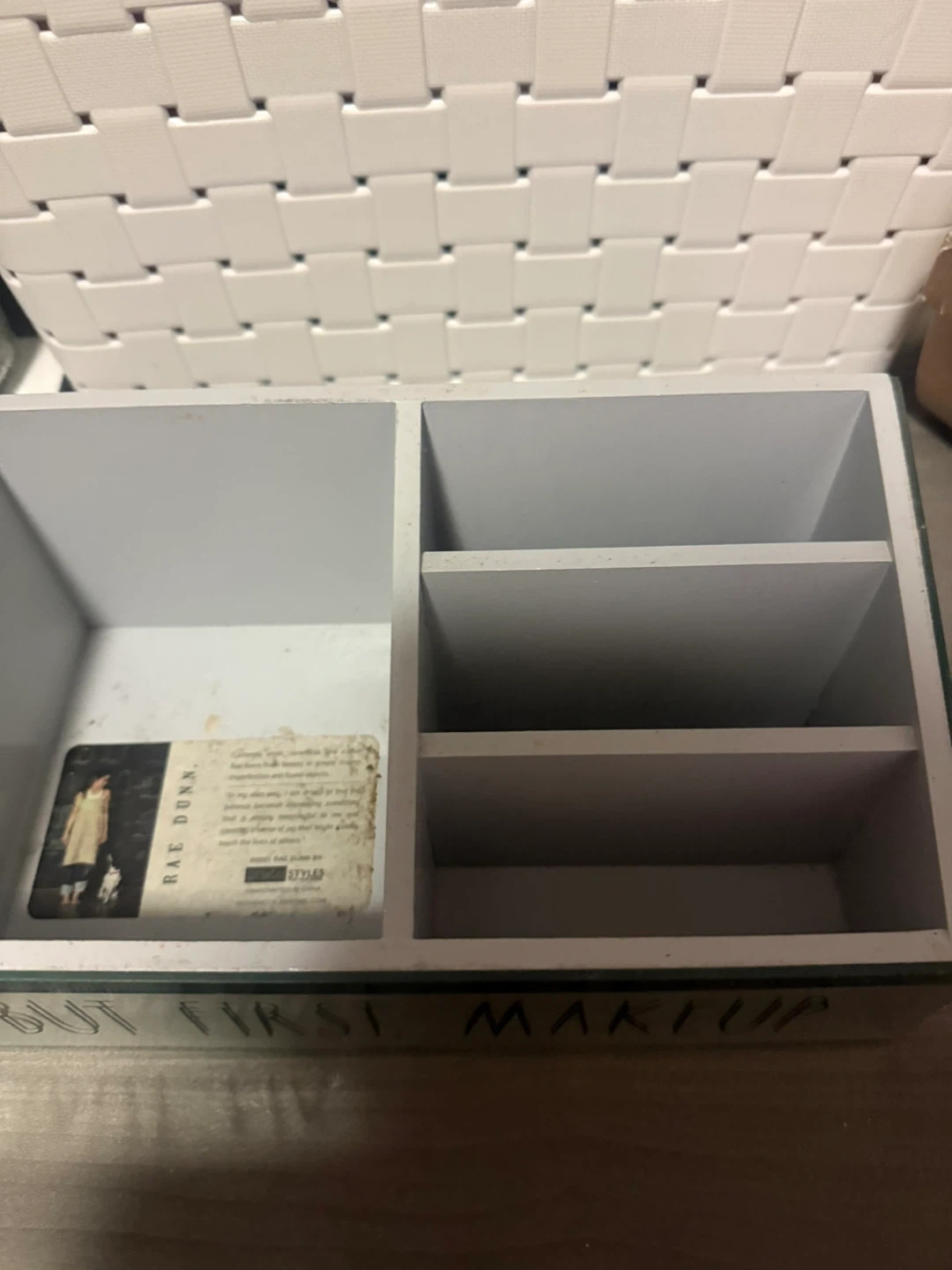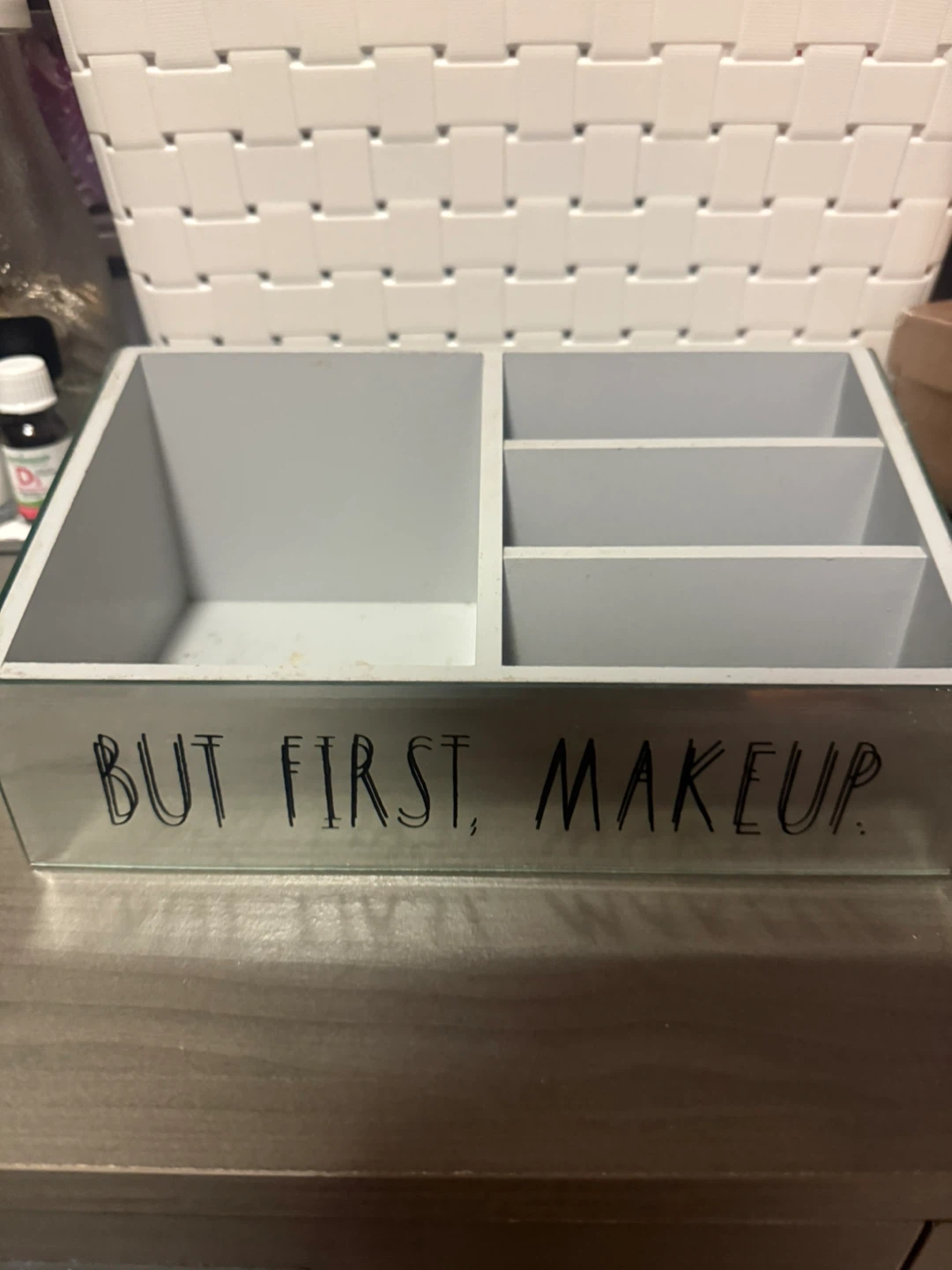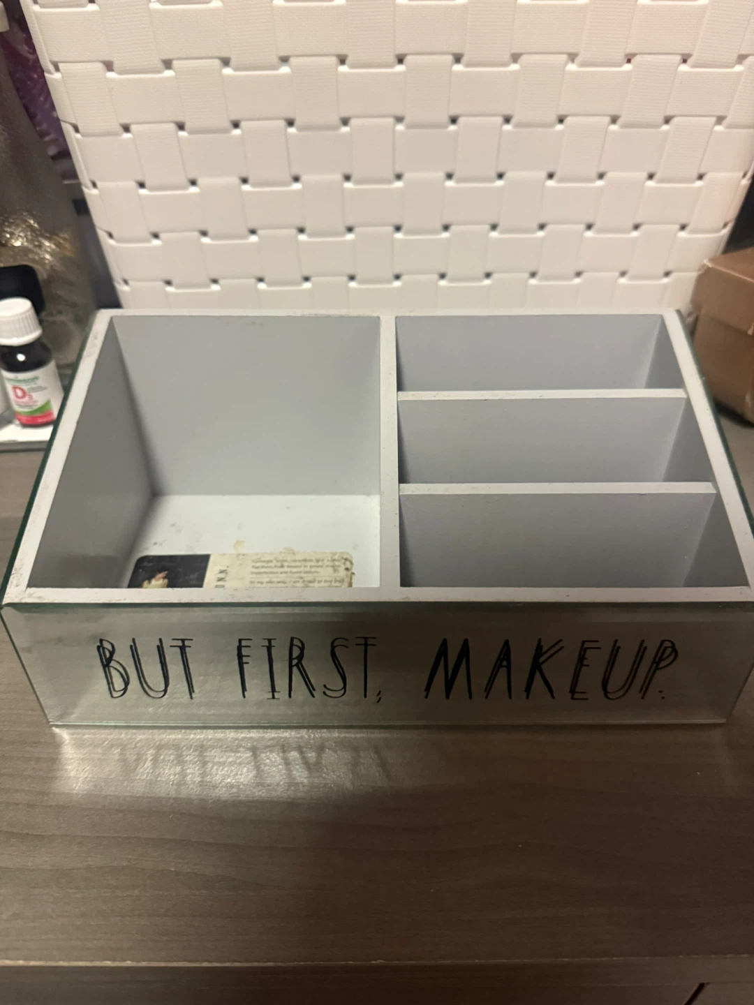 Selling a Rae Dunn makeup organizer! It has the words "BUT FIRST, MAKEUP" printed on the front. It's a super cute way to keep your makeup tidy and organized on your vanity or bathroom counter