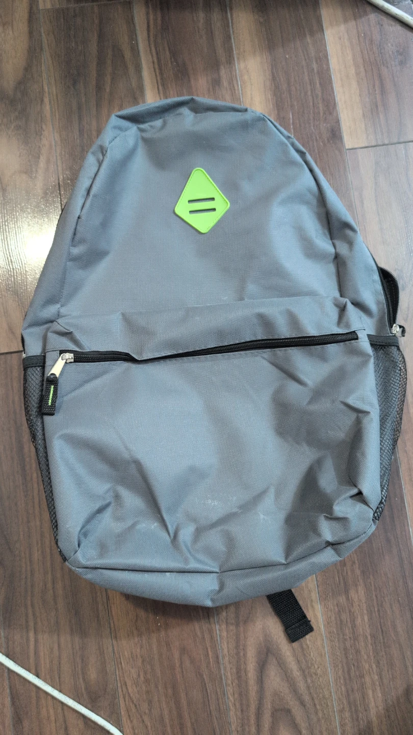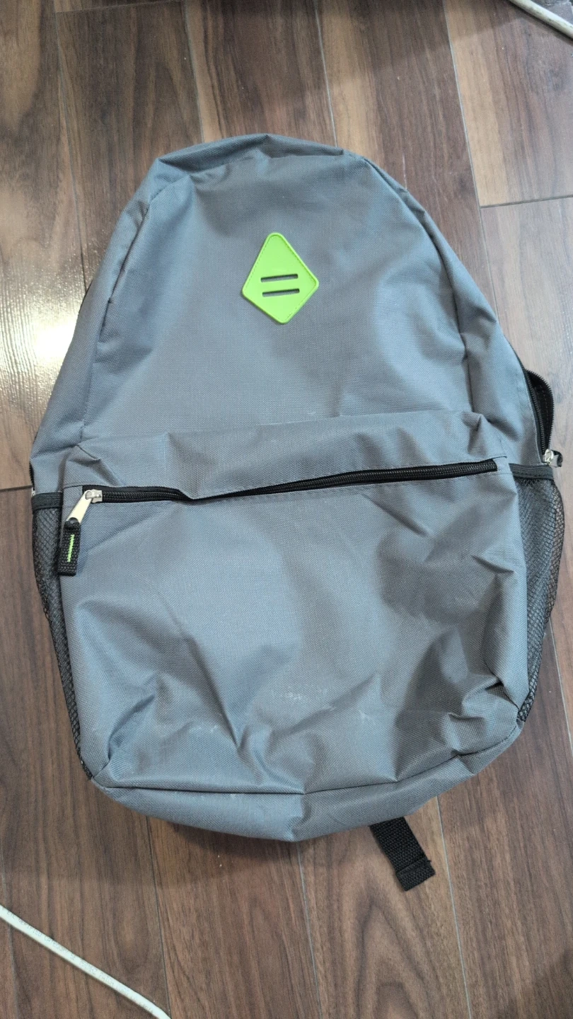This is a grey backpack with a green diamond design. It has a front zipper pocket and mesh pockets on the sides. It's in good condition!