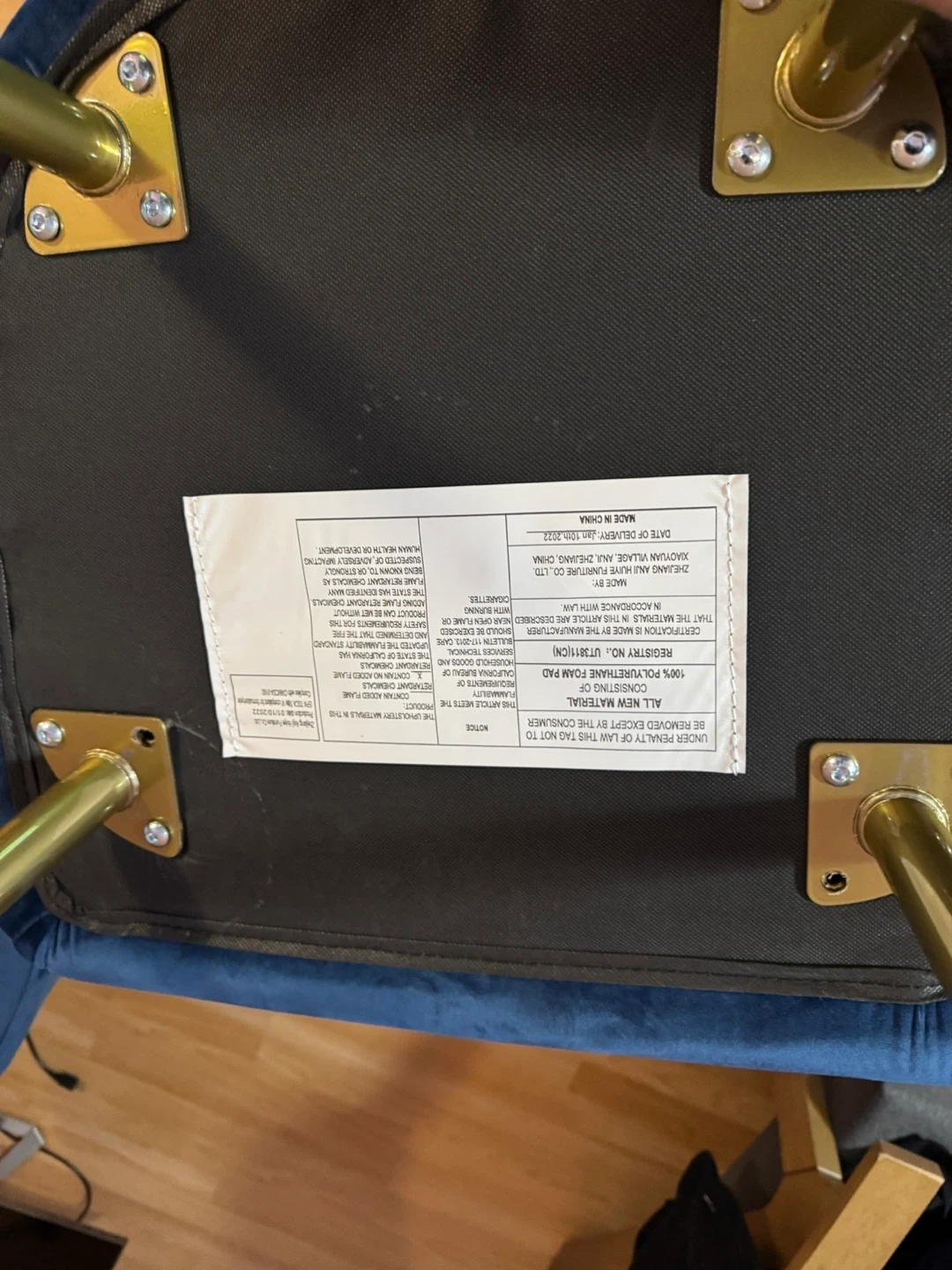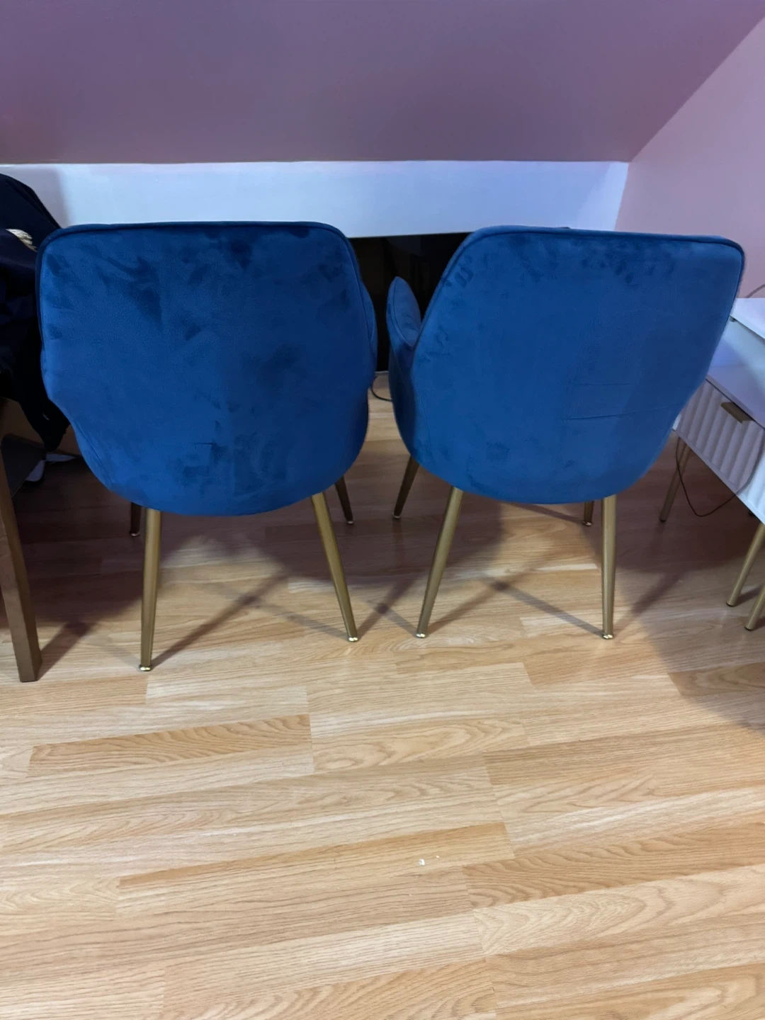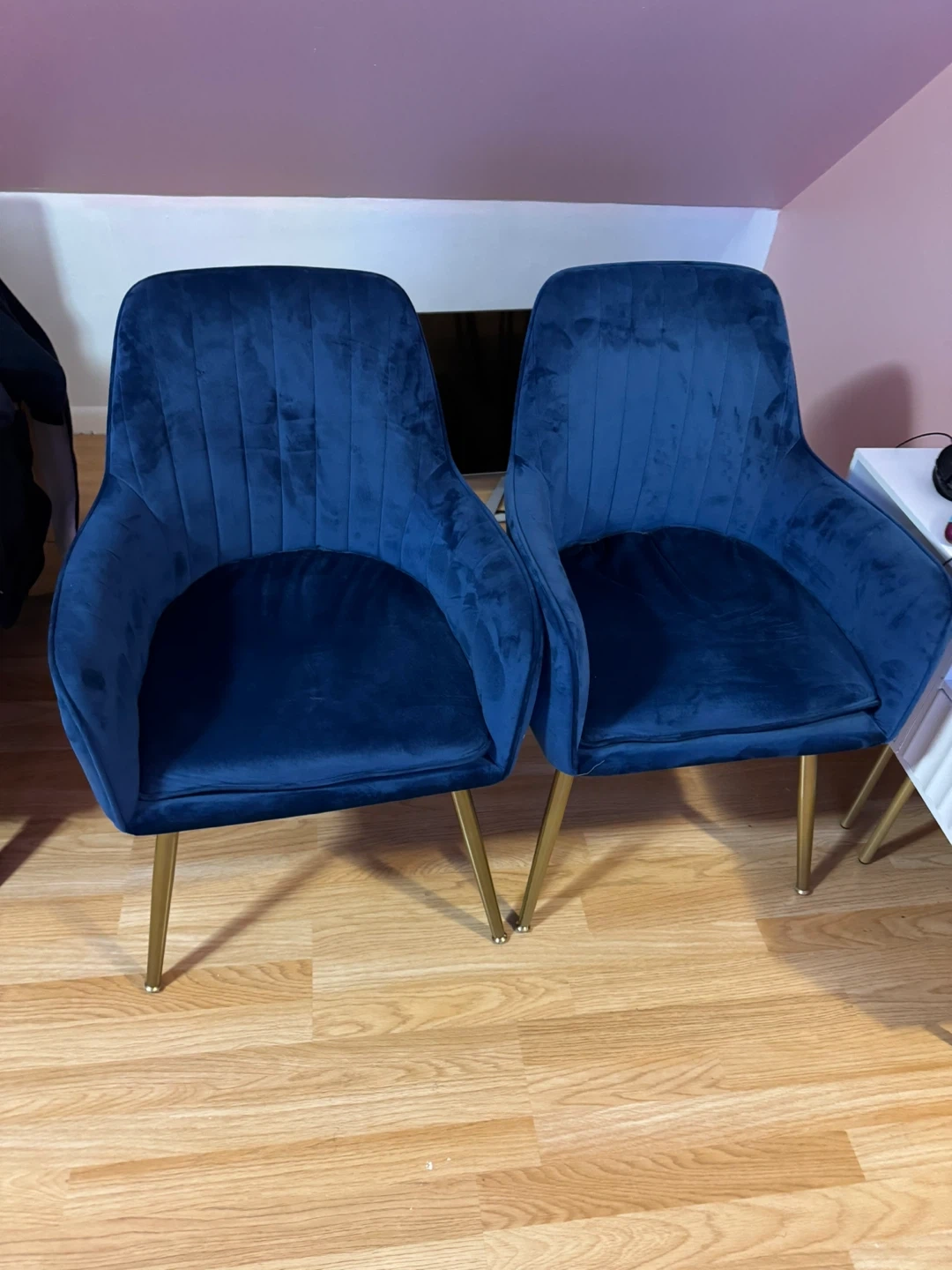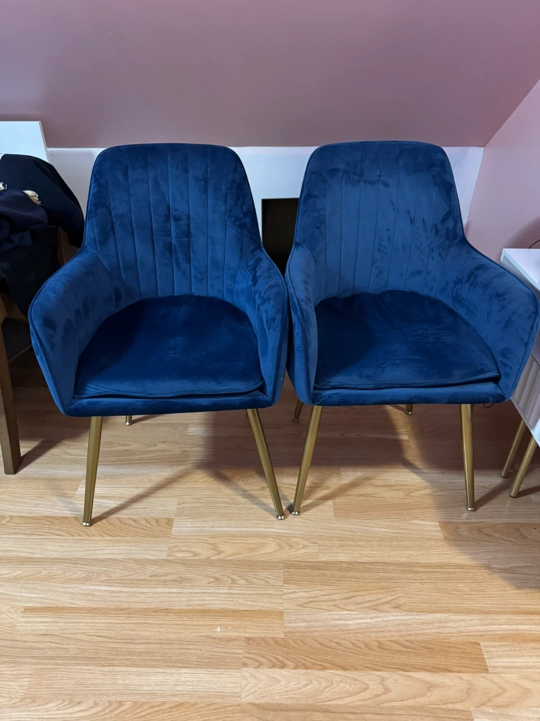 Selling a set of two stylish dining chairs! They feature a beautiful blue velvet upholstery and sleek gold legs. The chairs are made with all new material and 100% polyurethane foam pad. They were manufactured in 2022 July 20.