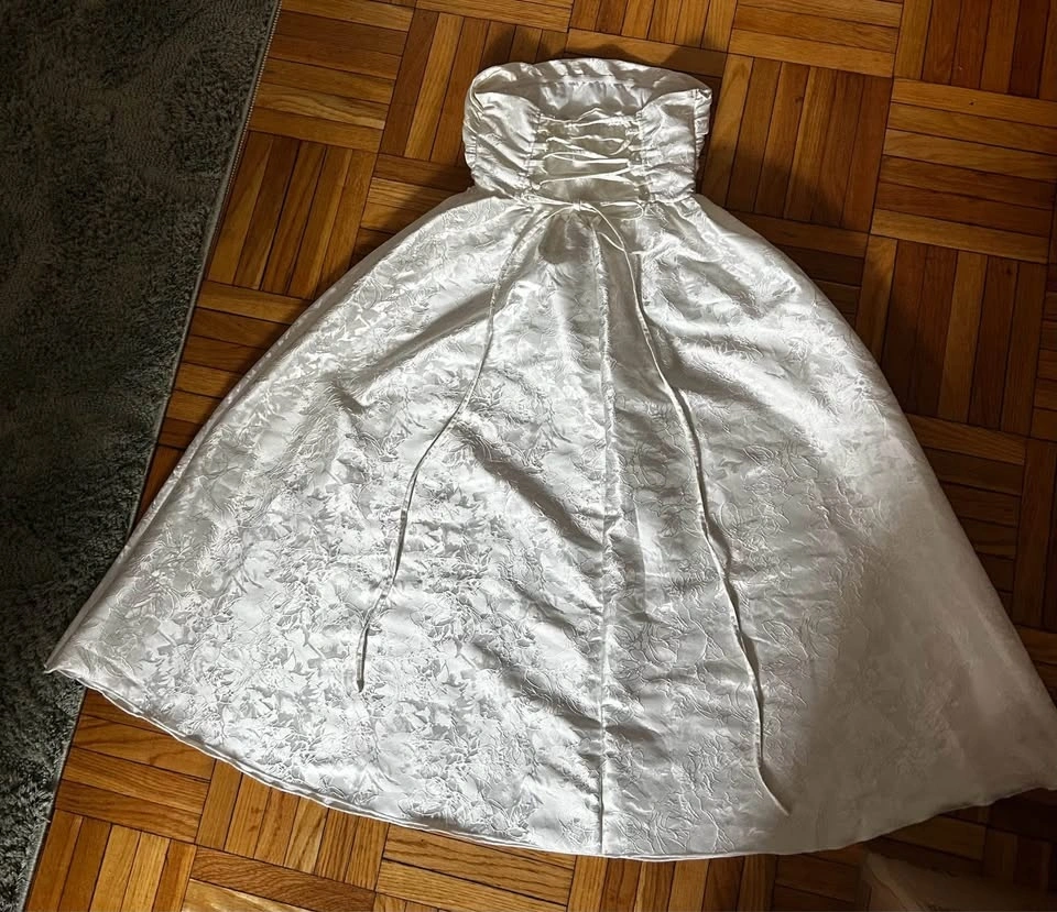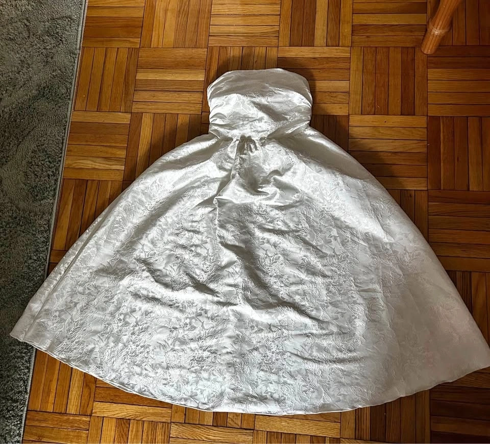 There’s no size or labels so I believe it’s handmade from a vintage wedding dress. I’m 5’10” and wear a size 2-4 and this fit me perfectly. The corset back allows for some fluctuation in size. Sadly, I never got a chance to wear this before my wedding but I’m hoping another bride will!