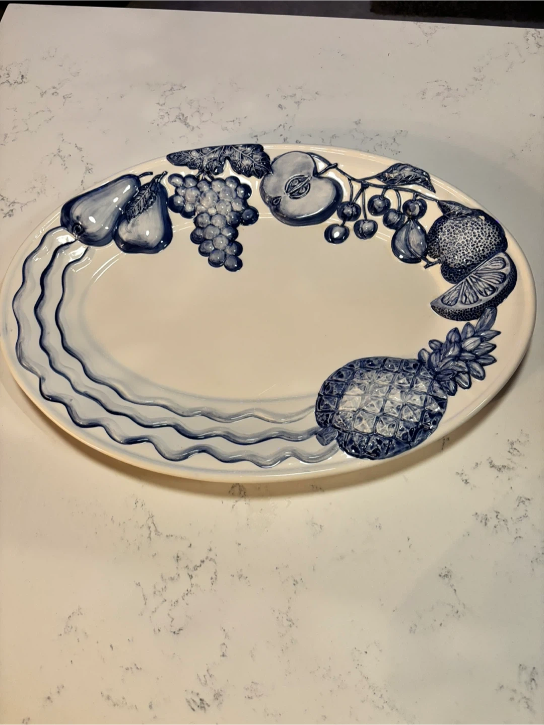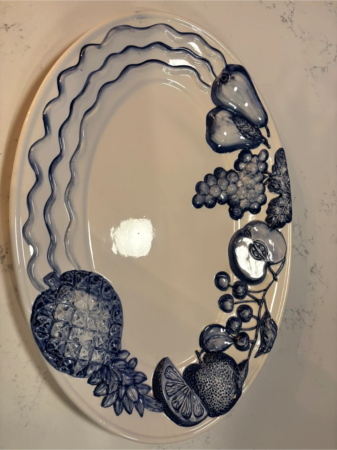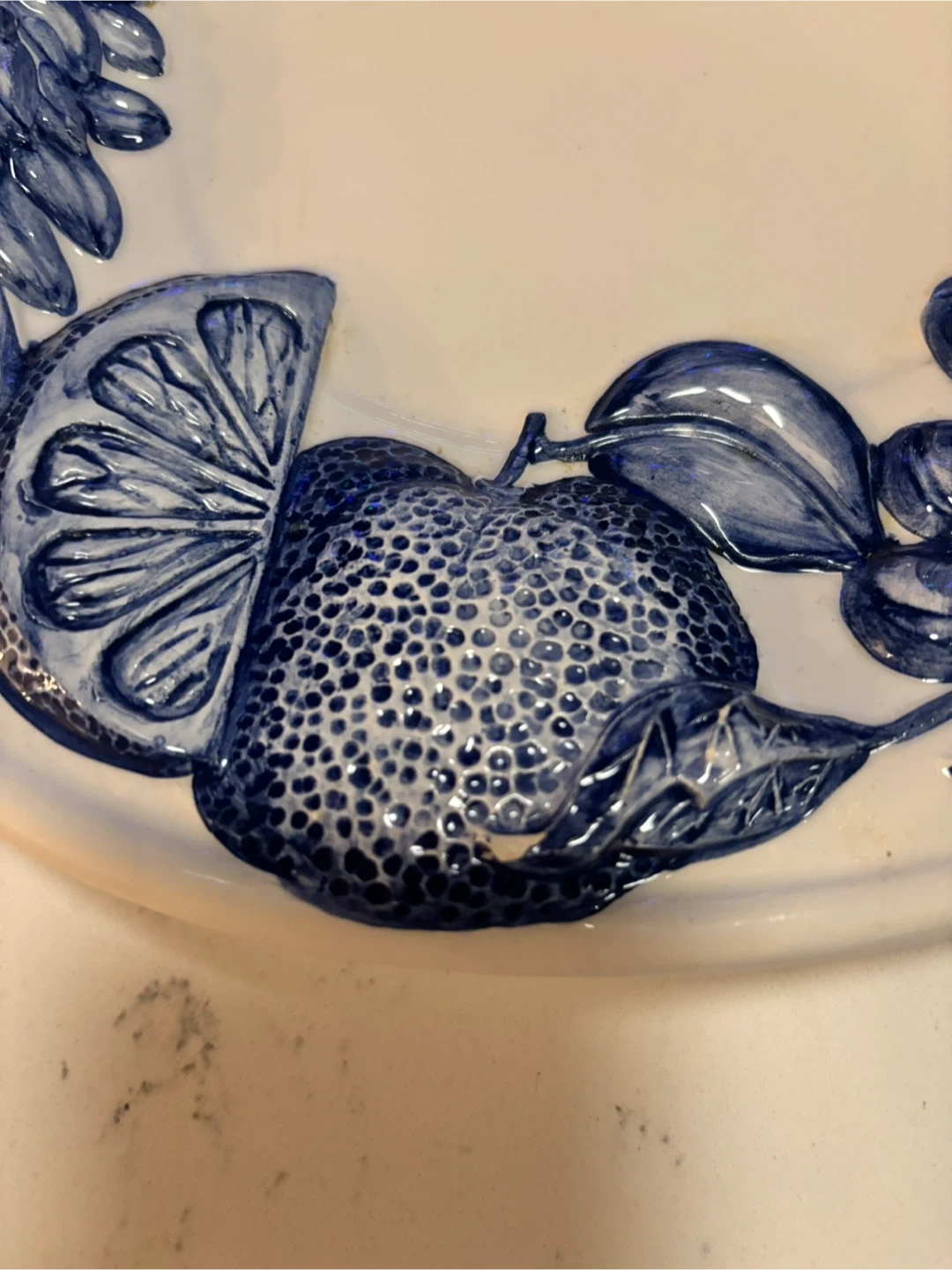 Beautiful blue-and-white fruit motif with raised detailing.