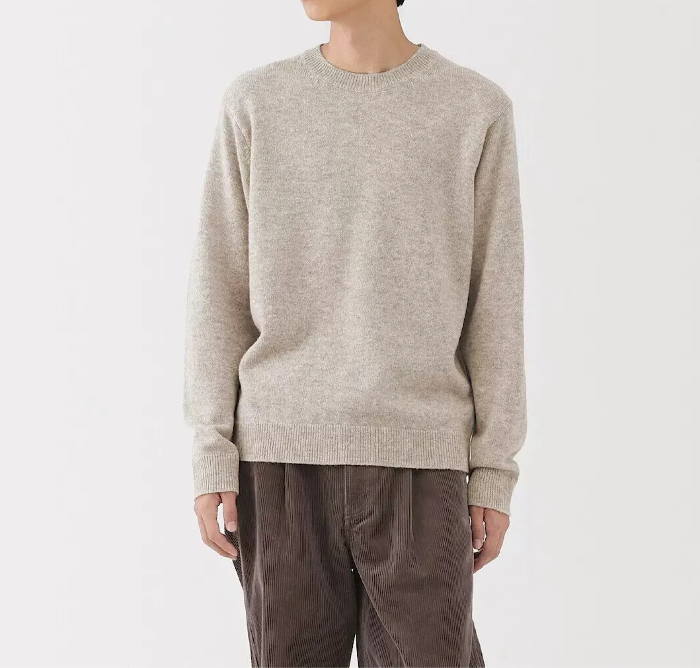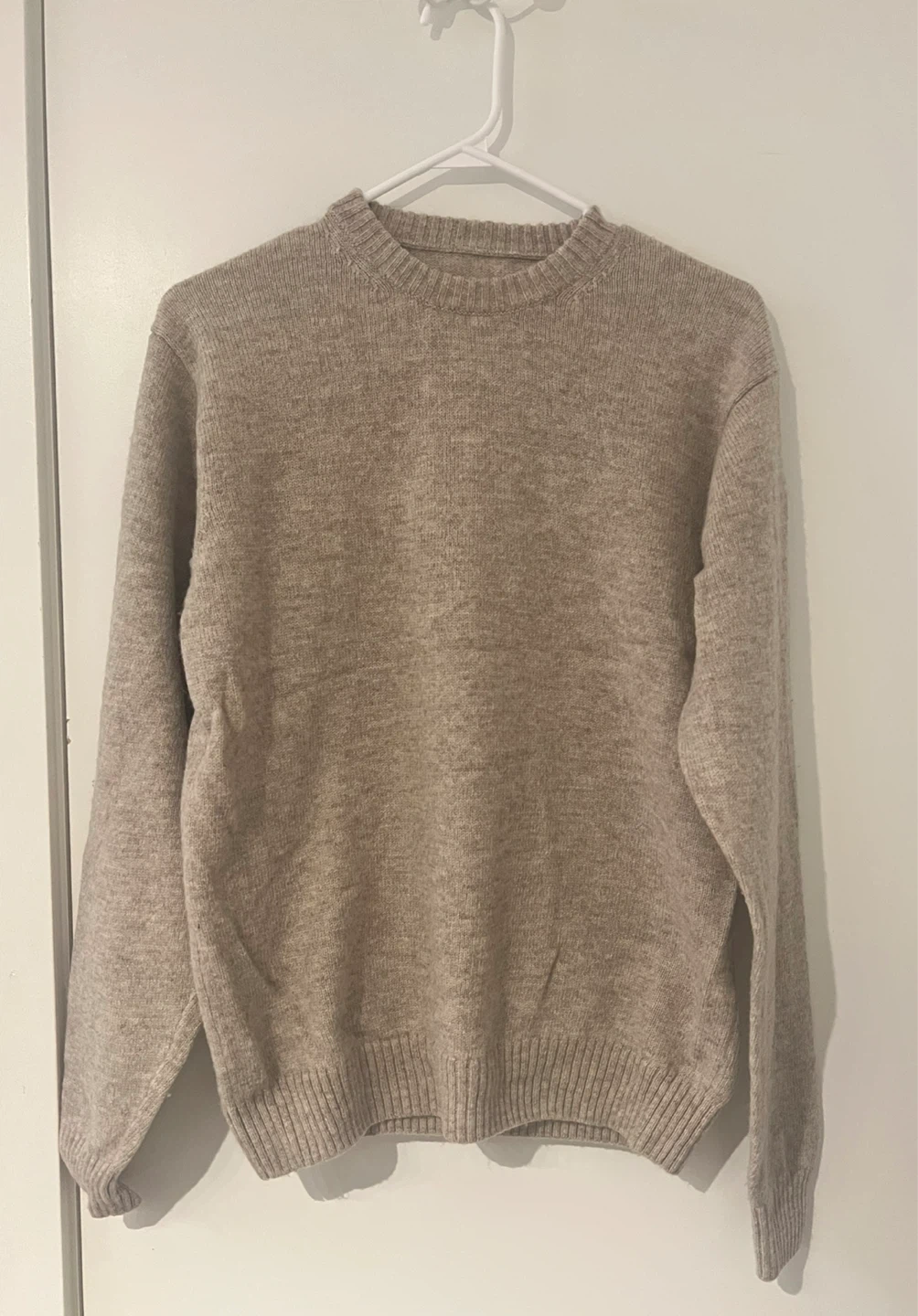 Selling a cozy beige crew neck sweater! It's in great condition and perfect for layering during the cooler months. The material feels soft and comfortable, making it a great addition to your wardrobe