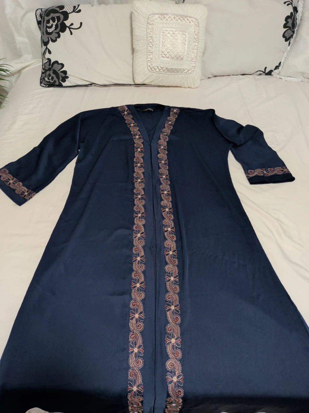 A beautiful navy blue abaya with intricate embroidery detailing. Brand new premium quality ready for a new wardrobe!