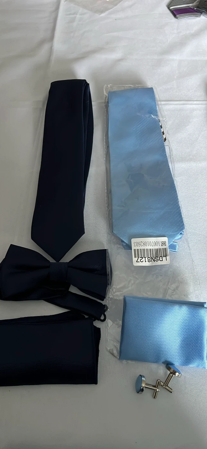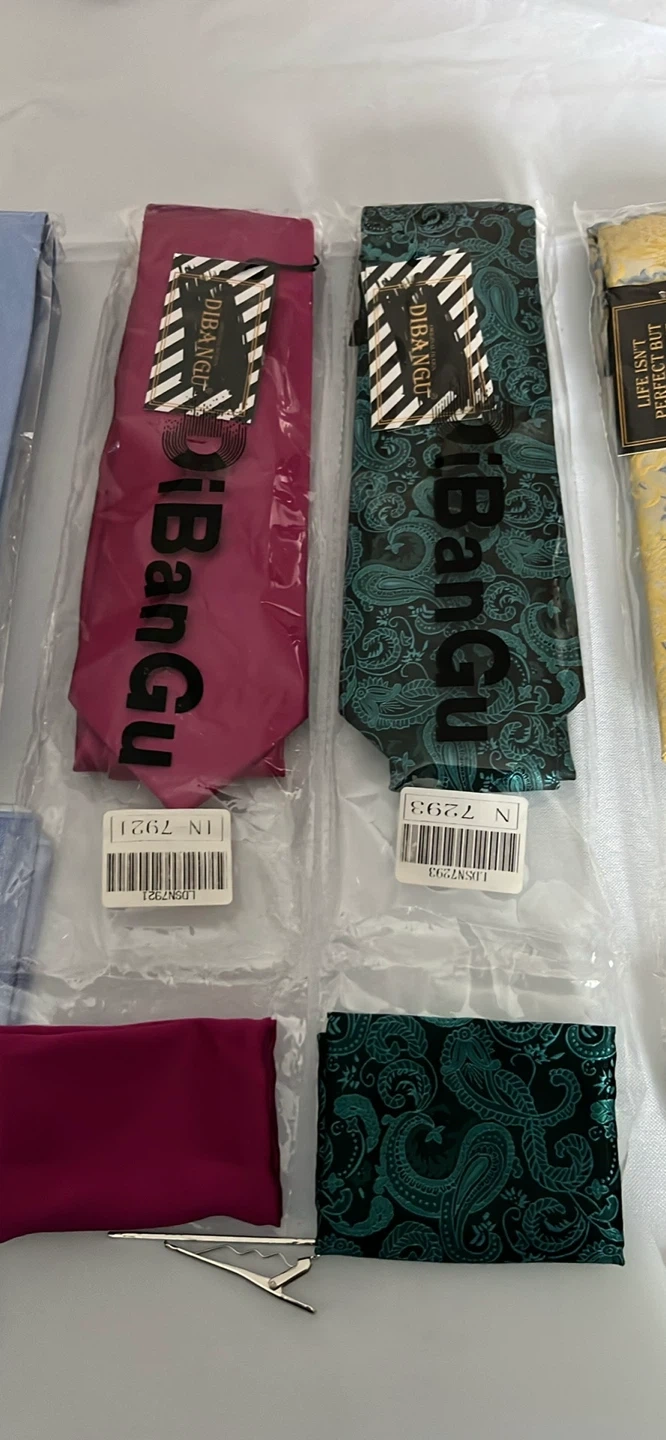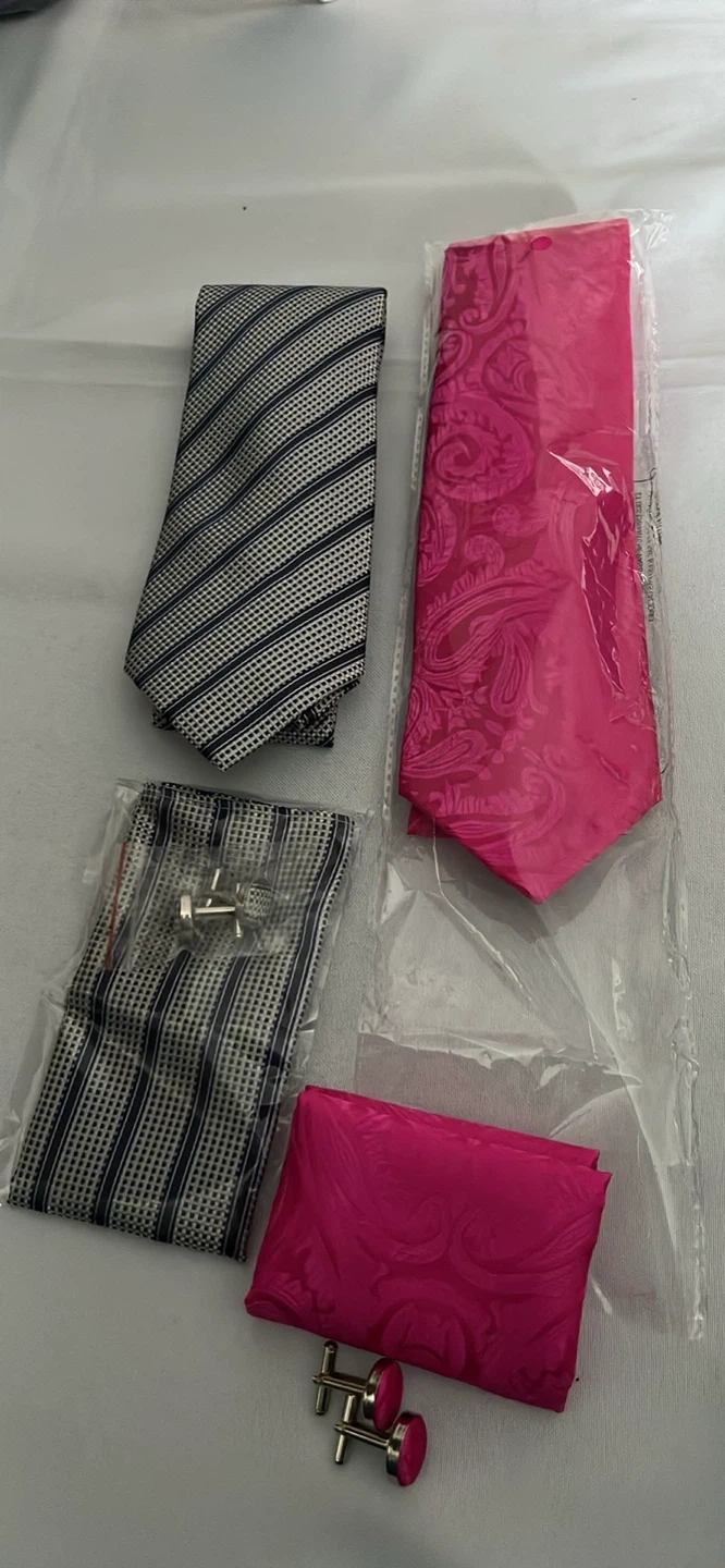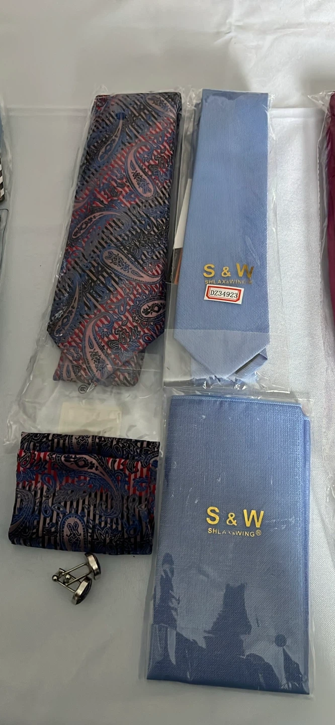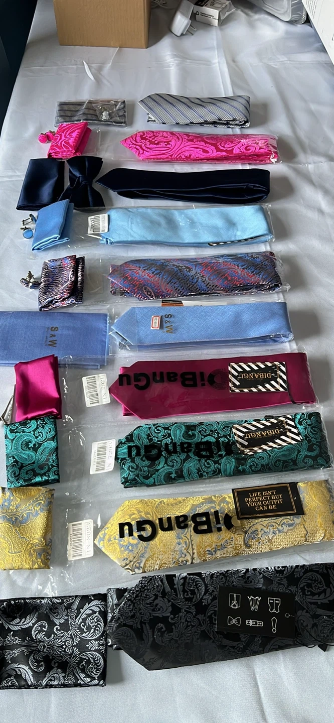 I have several new tie and cufflink sets available. Brands include Dibangu and S&W. They come in various colours and patterns, perfect for adding a touch of class to any outfit! $8 each