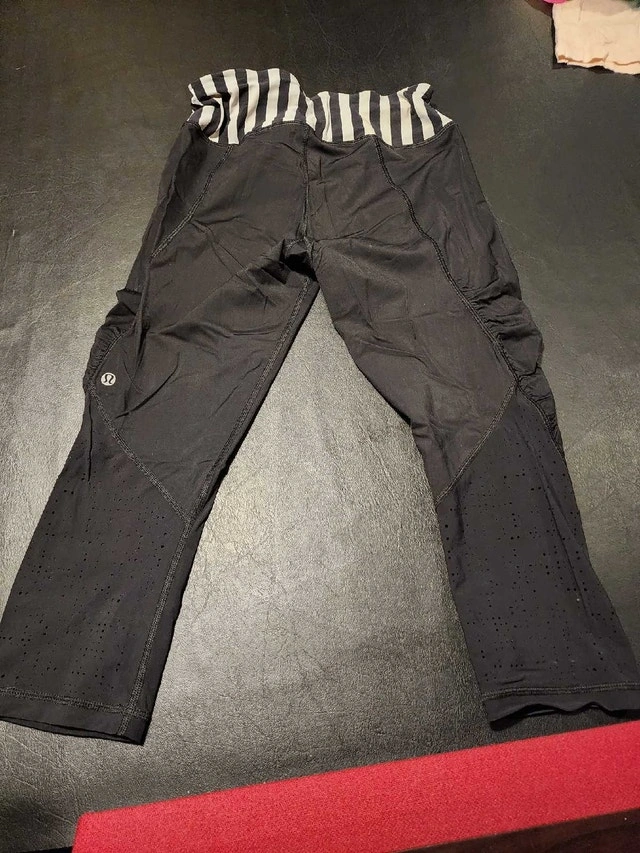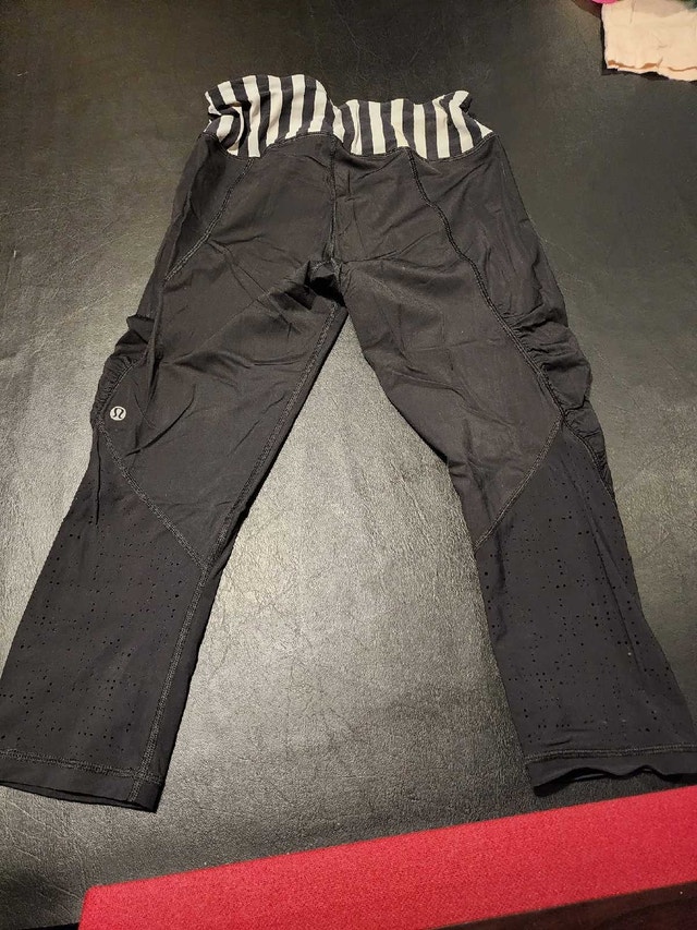 These are a pair of used Lululemon capri-length leggings, perfect for workouts or casual wear. They are a size small, black with a striped waistband and perforated detailing at the lower leg. Showing signs of wear, they're still comfy and ready for more action!
