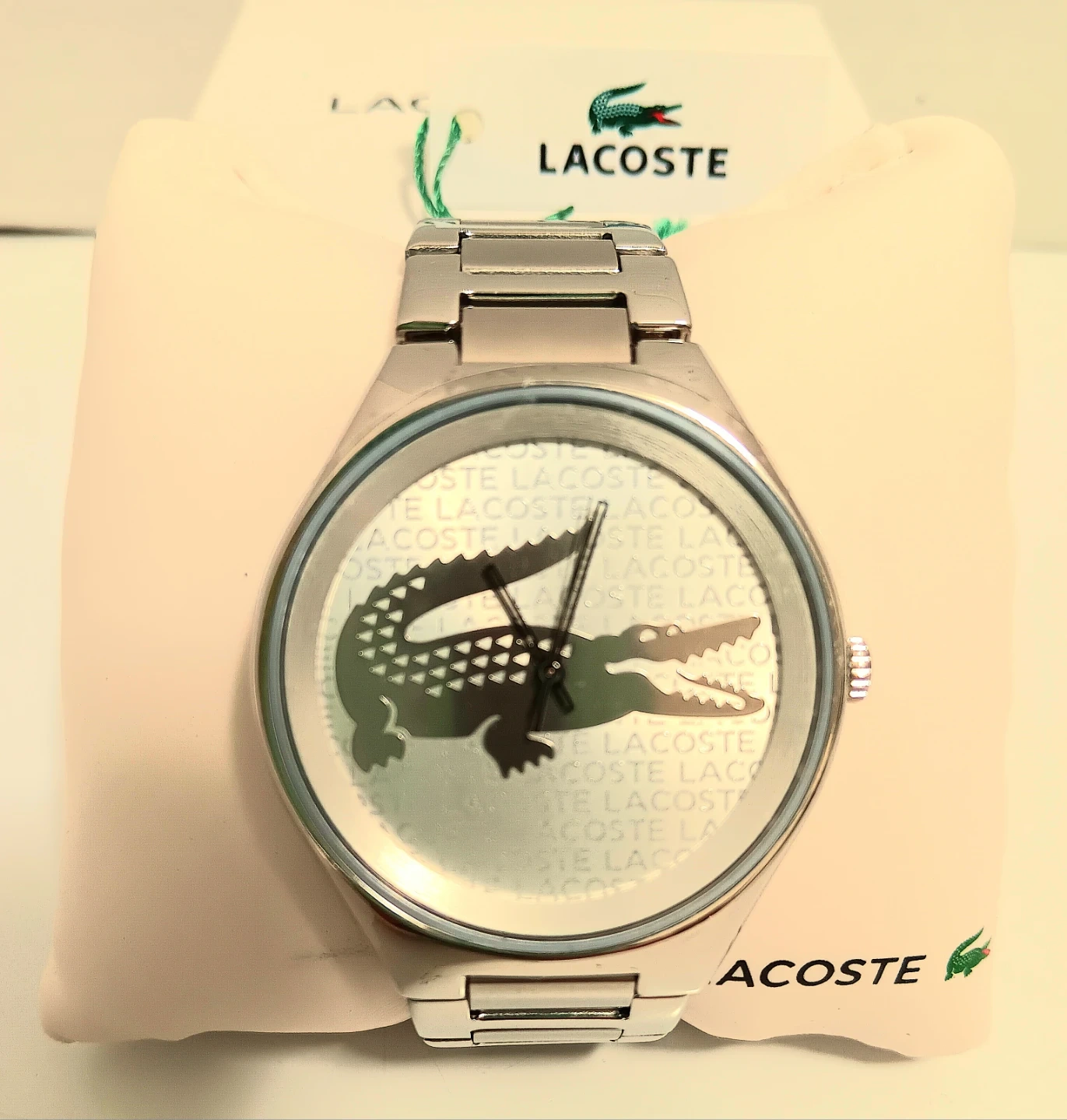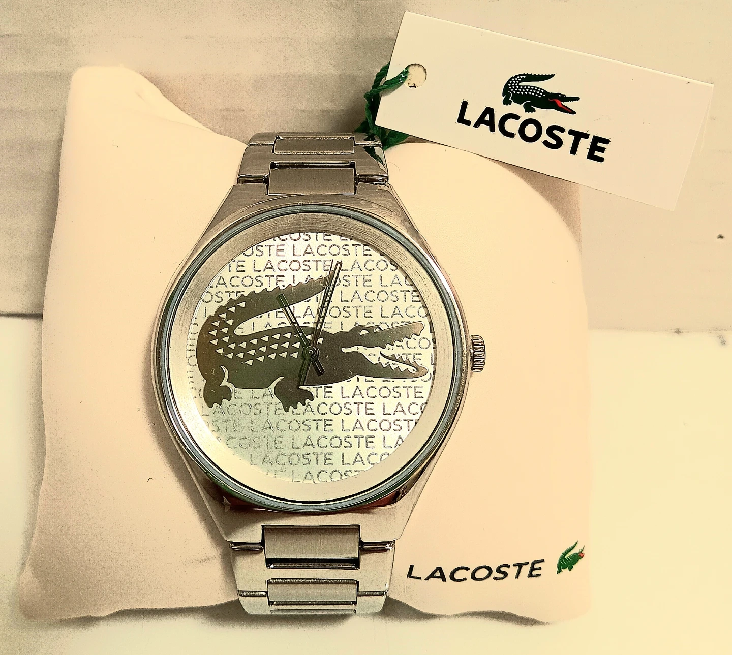 I'm selling a Brand New Lacoste watch with a stainless steel bracelet and the iconic Lacoste crocodile on the watch face. The watch is in excellent condition.