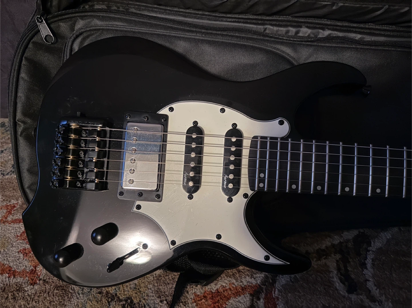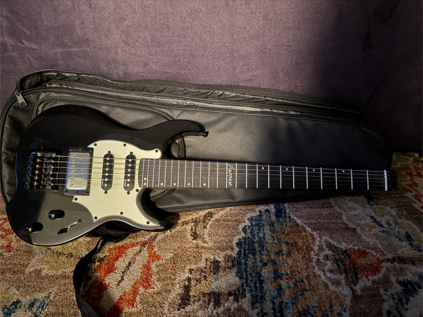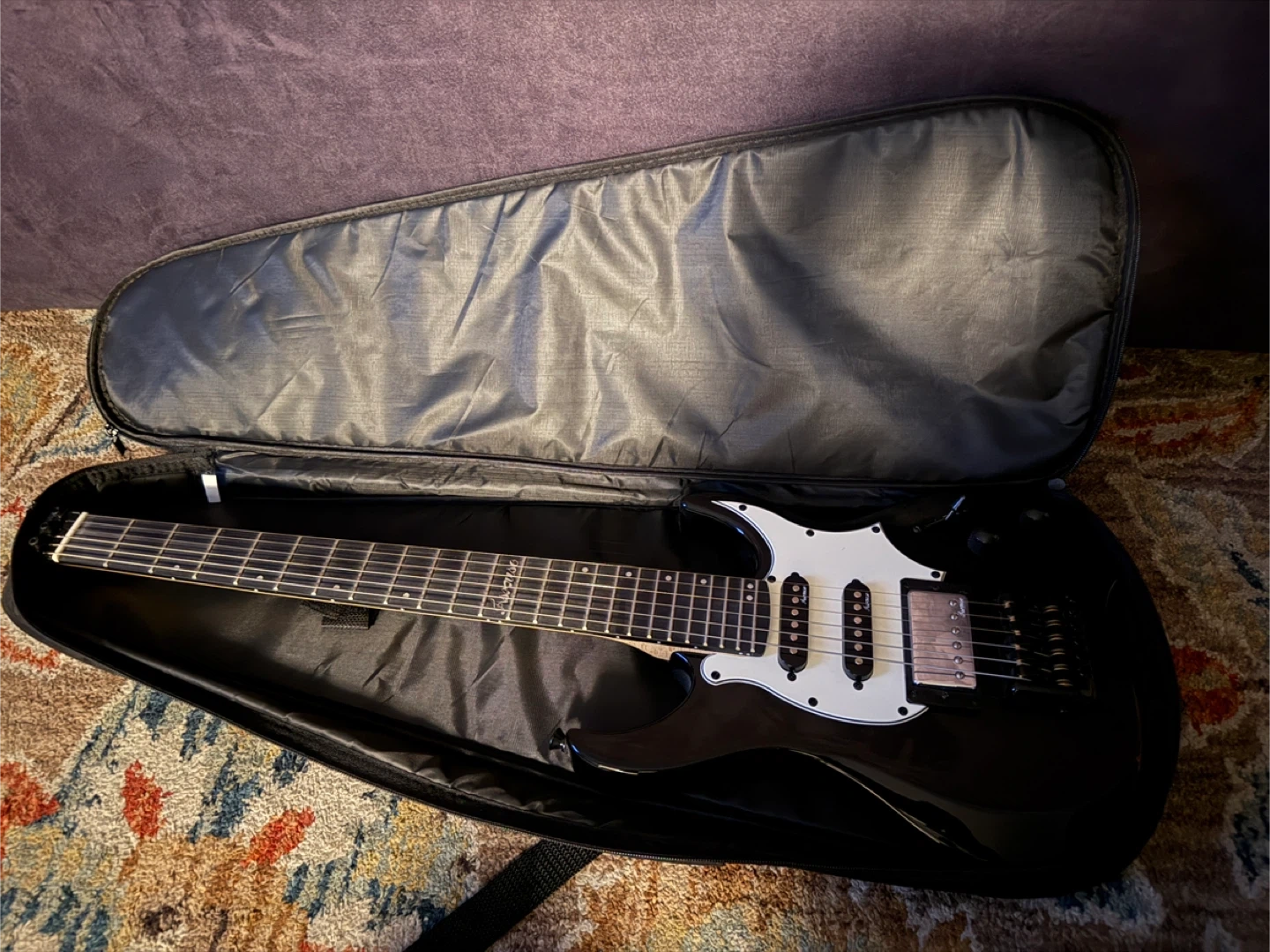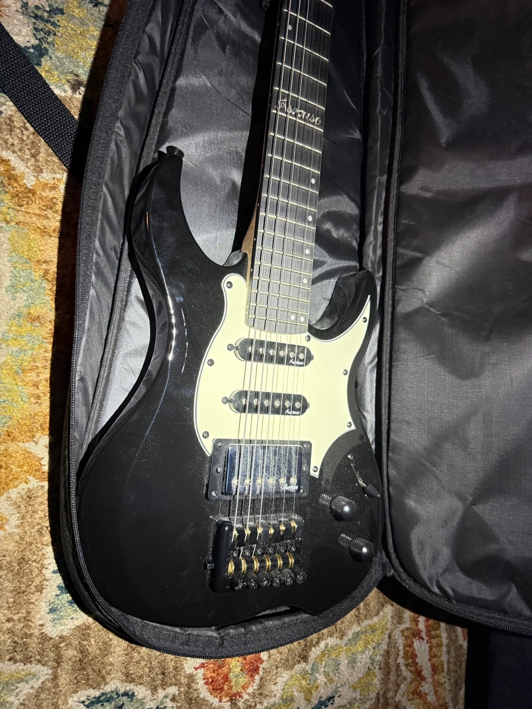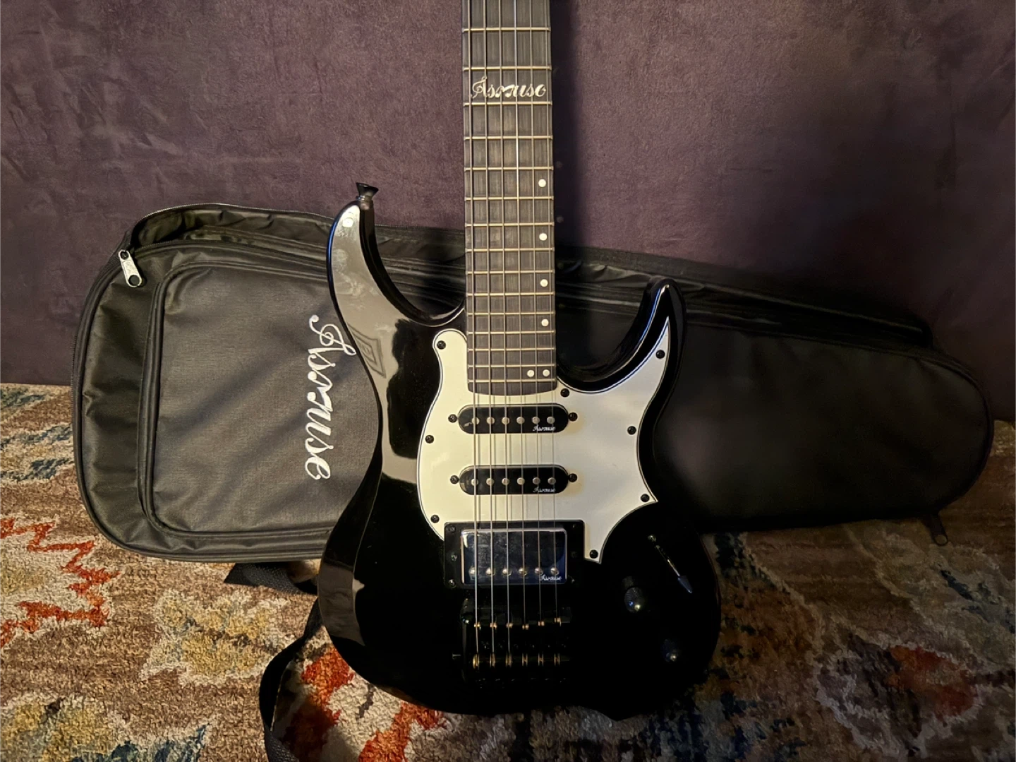 Selling an Asmuse headless electric guitar in black! It comes with a case for easy transport and storage. Perfect for anyone looking to rock out! Makes a great Christmas gift. Cheap, plays great!
