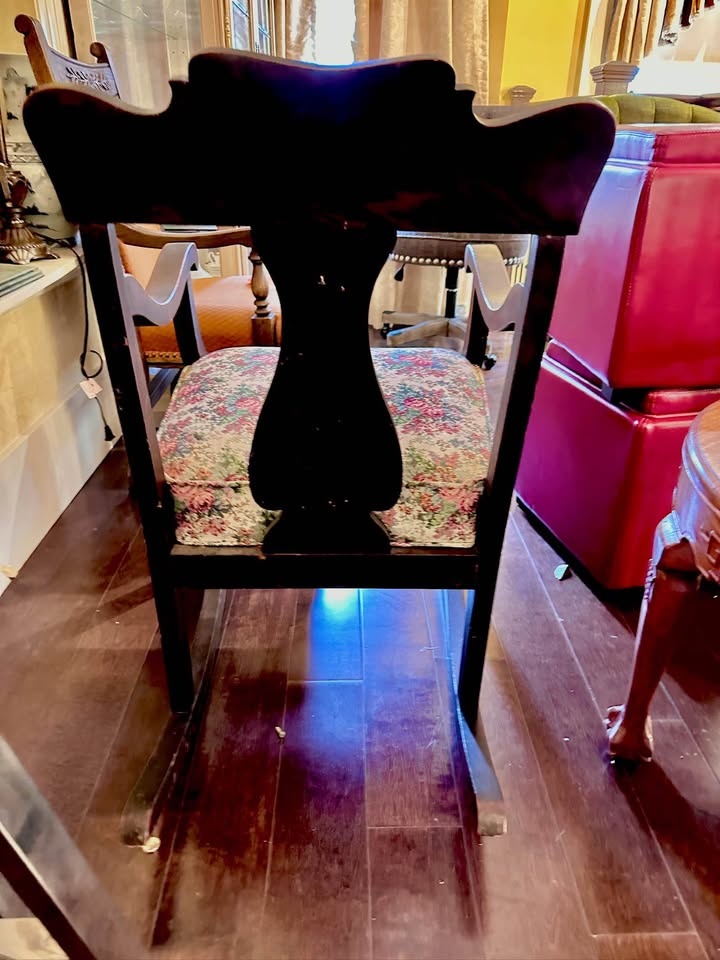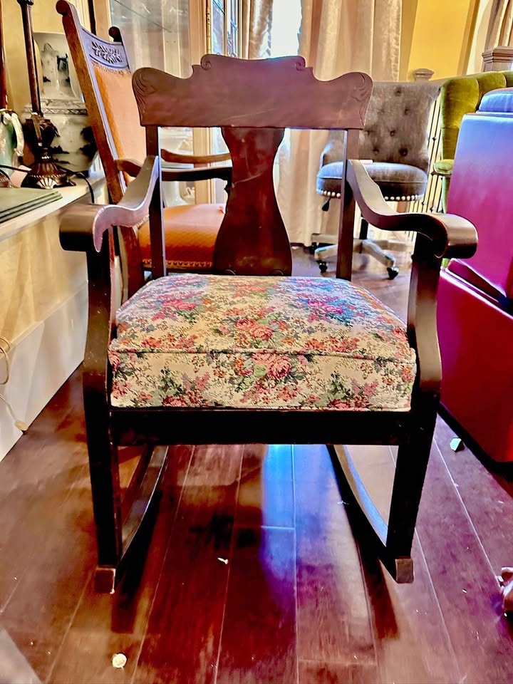 Floral Upholstered Seat, Decorative Back This vintage wooden rocking chair features a curved decorative backrest and sturdy arms with a warm, classic finish. The floral upholstered seat adds a charming touch, making it a comfortable and nostalgic piece.