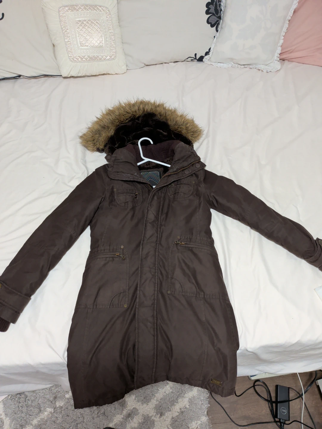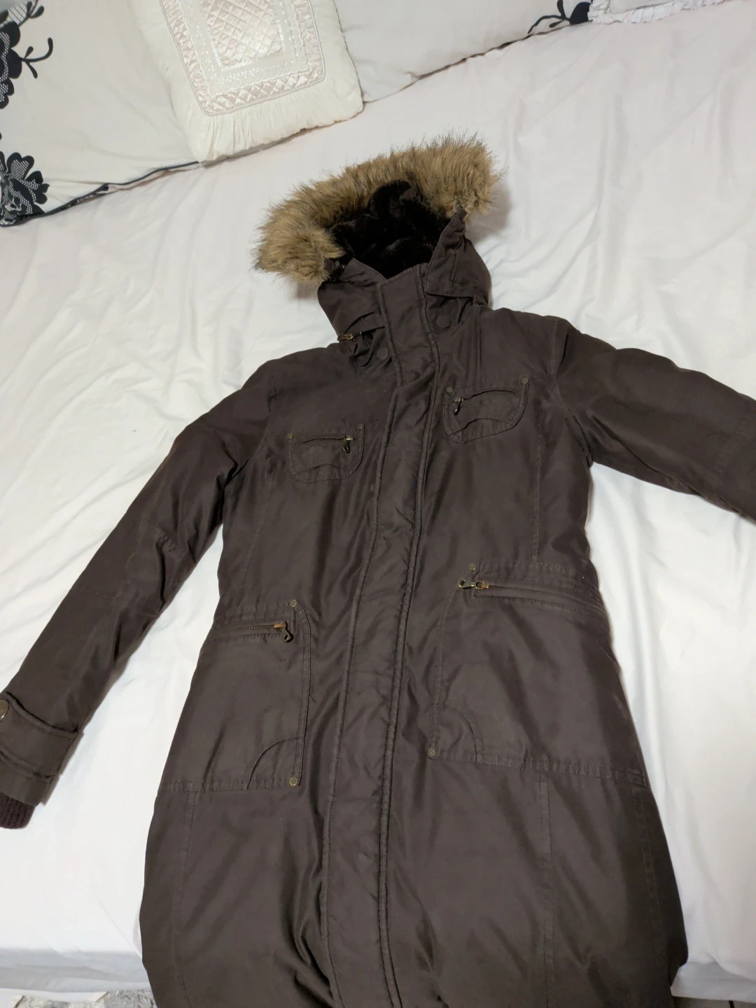 A stylish TNA winter parka in a lovely brown colour. It's perfect for staying warm during the colder months. This parka features a faux fur trimmed hood and a flattering silhouette. It's in great condition and ready for a new owner!