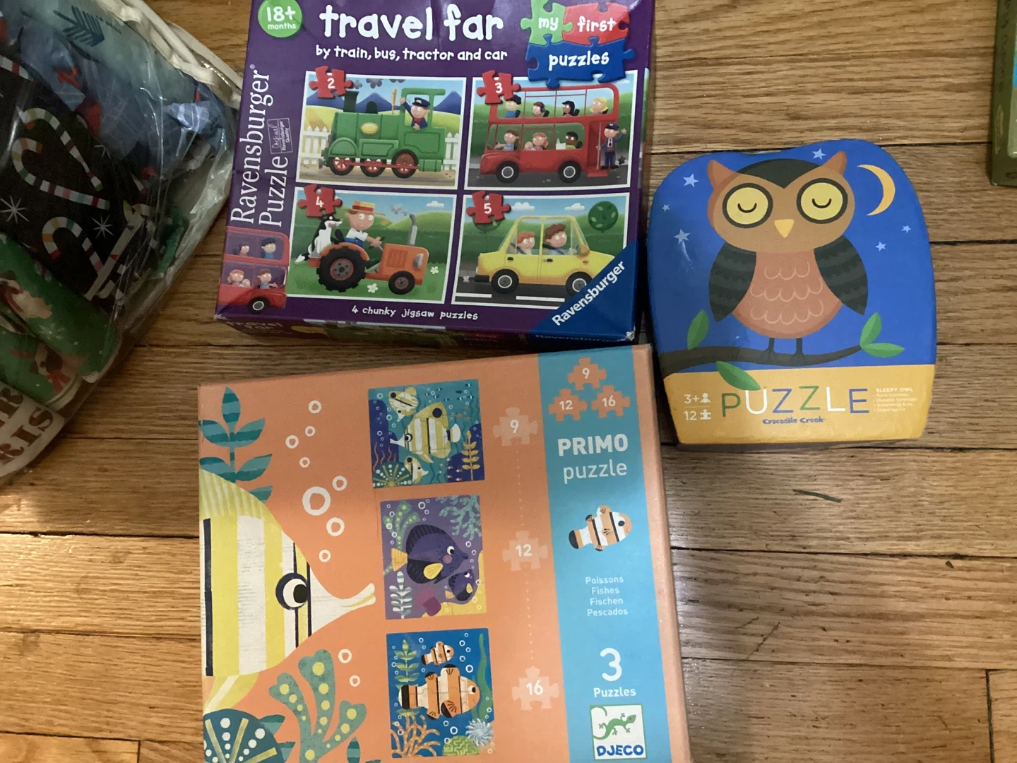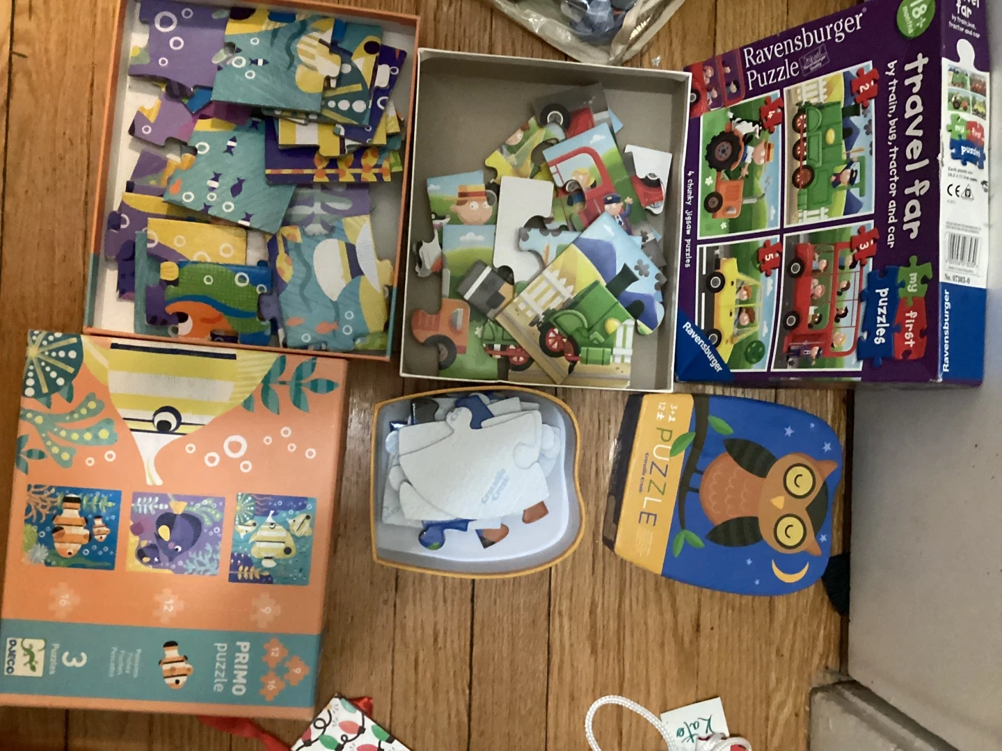 Selling a set of kids' puzzles! Includes a Ravensburger 'Travel Far' puzzle (18+ months) with chunky jigsaw pieces, a Djeco 'Primo' puzzle (3 puzzles included), and a Crocodile Creek 'Sleepy Owl' puzzle (3+). Great for developing problem-solving skills!
