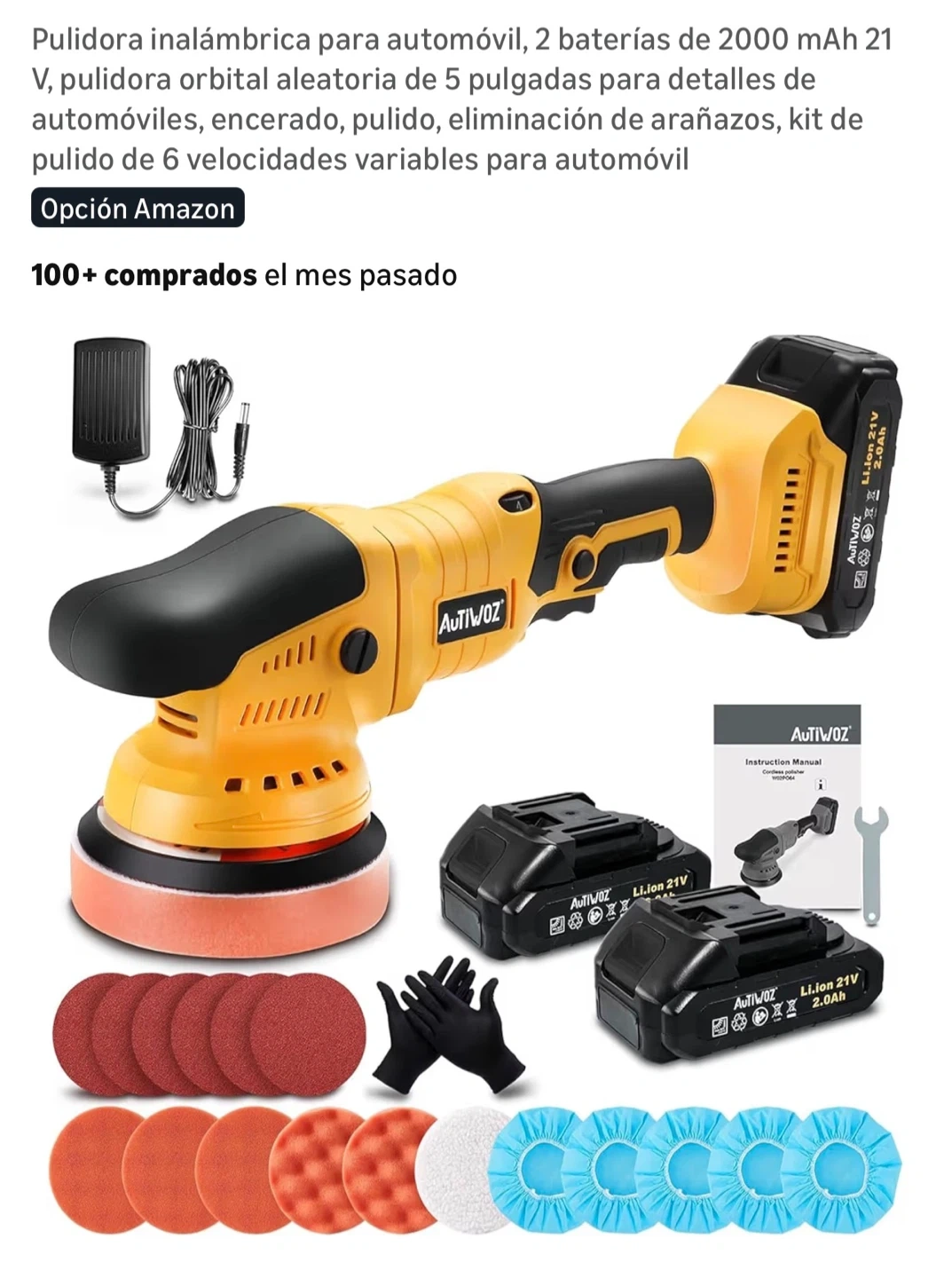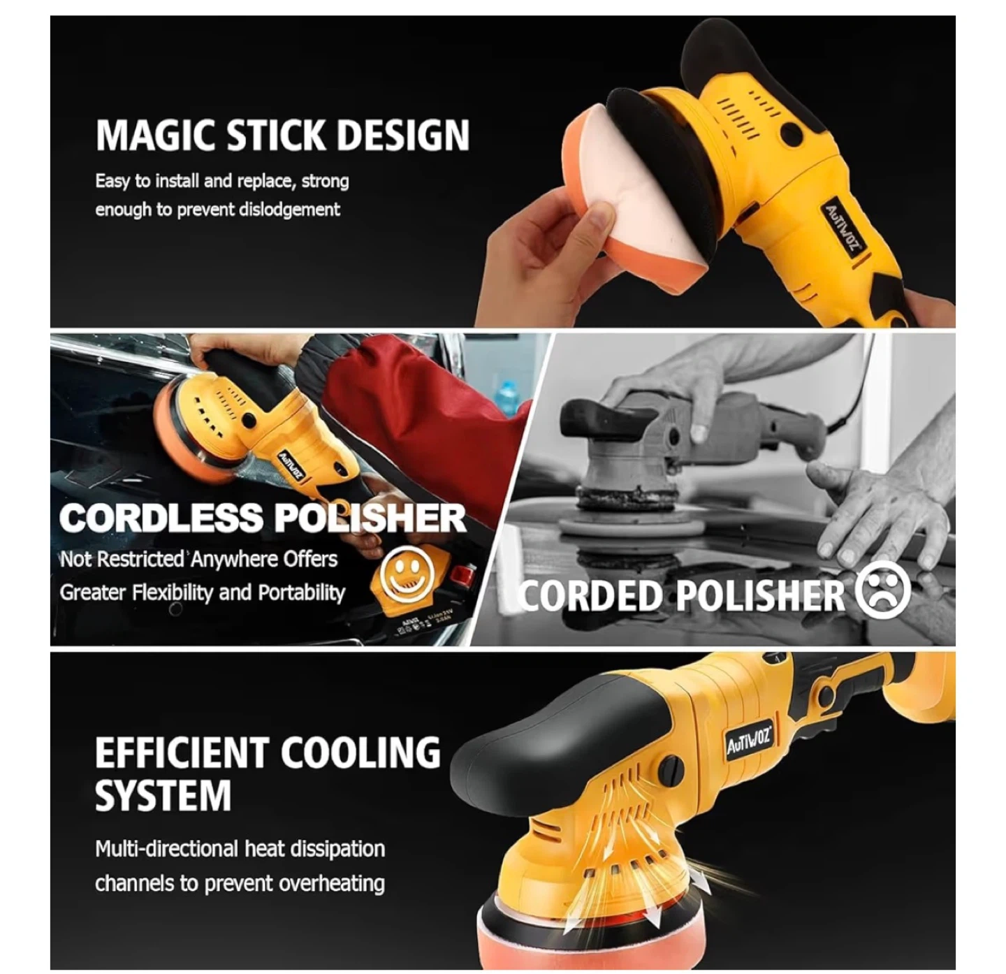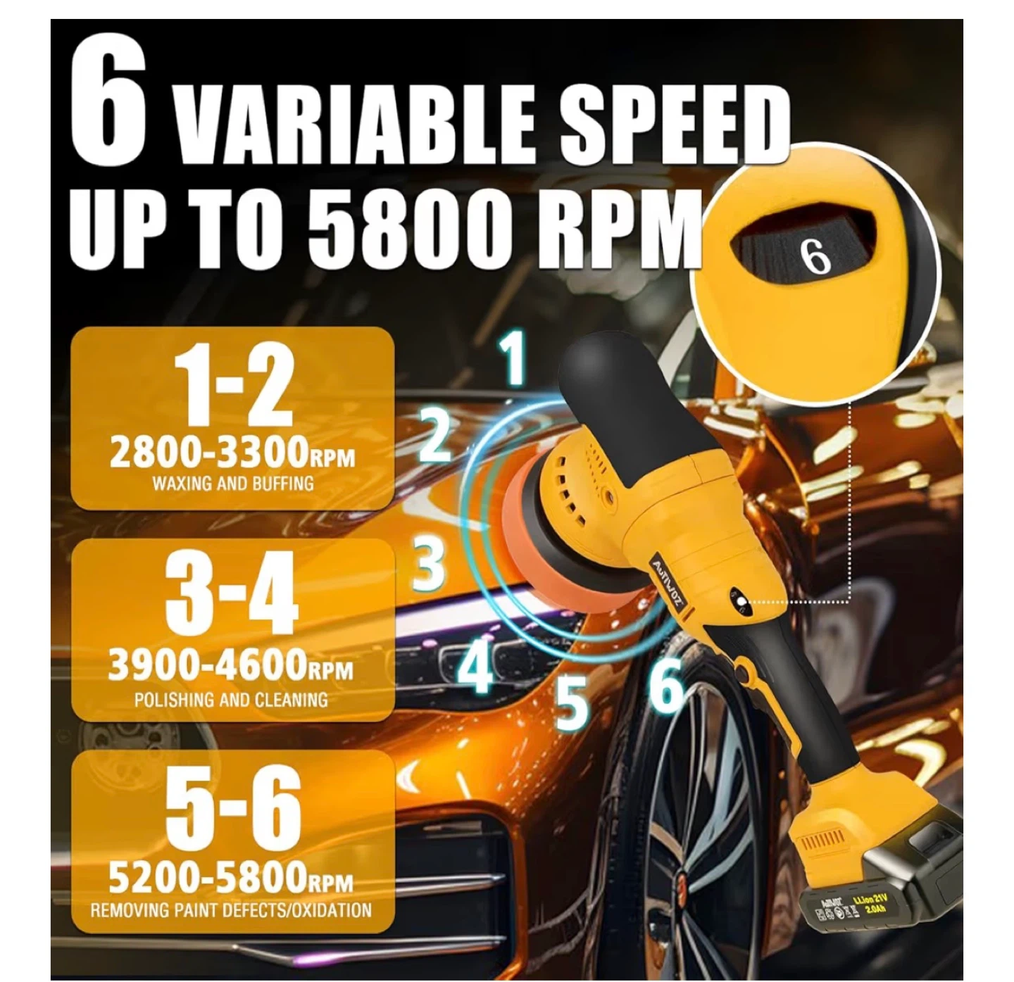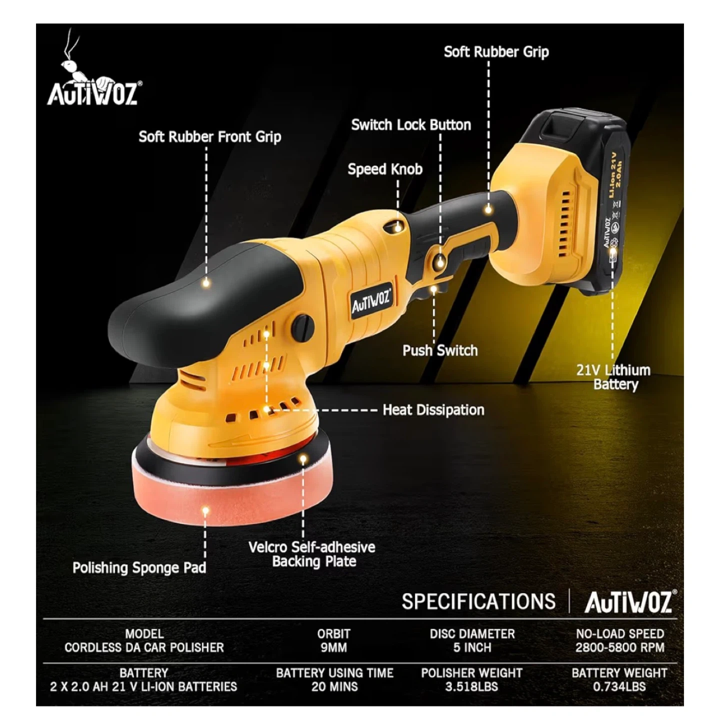 I'm selling an AUTWOZ Cordless DA Car Polisher. It features a 5-inch disc diameter and variable speeds up to 5800 RPM. It's great for polishing scratches, waxing, and buffing. It also has a soft rubber grip and a switch lock button for comfortable use