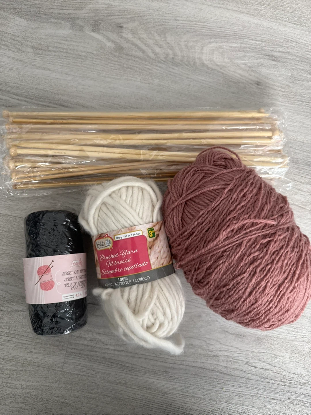 Selling a bundle of yarn that includes a black knit mate yarn, a white brushed yarn, and a mauve yarn. Also included a set of knitting needles. Perfect for your next knitting project!