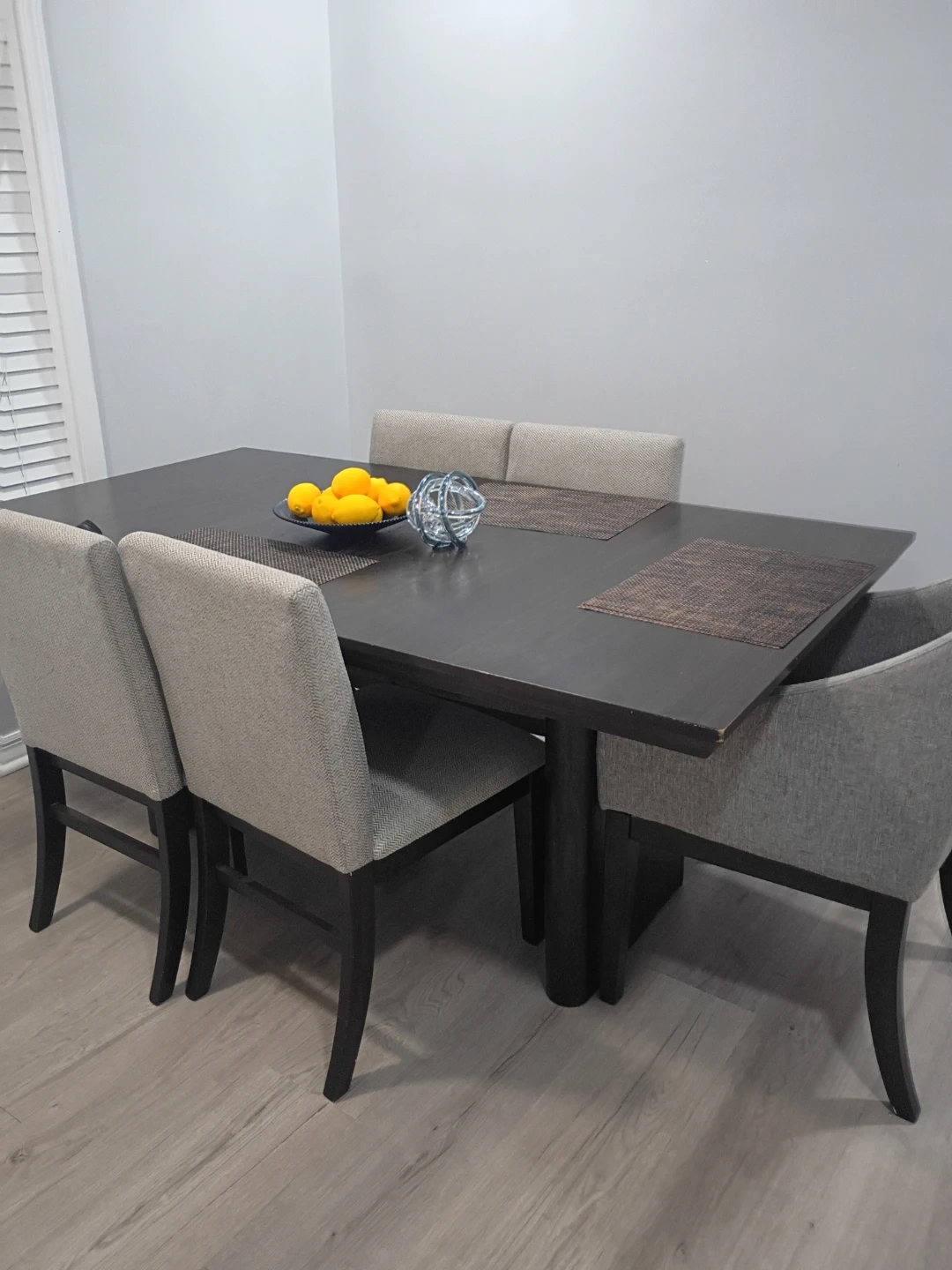 Selling a dining table with four chairs. The table is a dark color and the chairs are upholstered in a light gray fabric. Great for a small dining area!