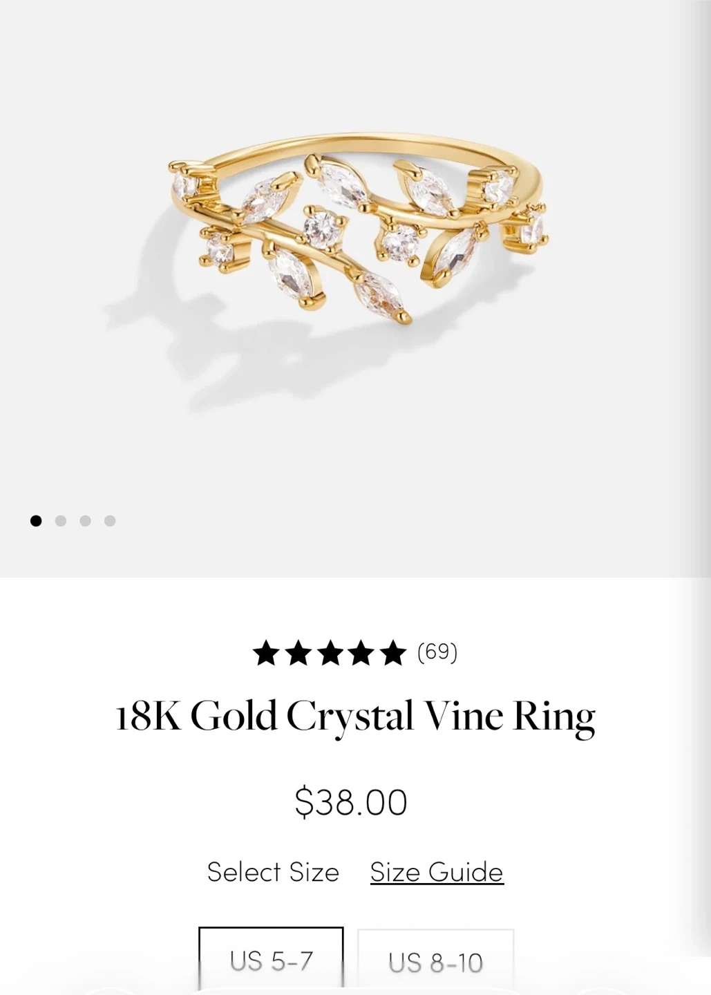 Selling a beautiful 18K gold crystal vine ring. It's in excellent condition and a lovely piece to add to your collection. It is a US size 5-7.