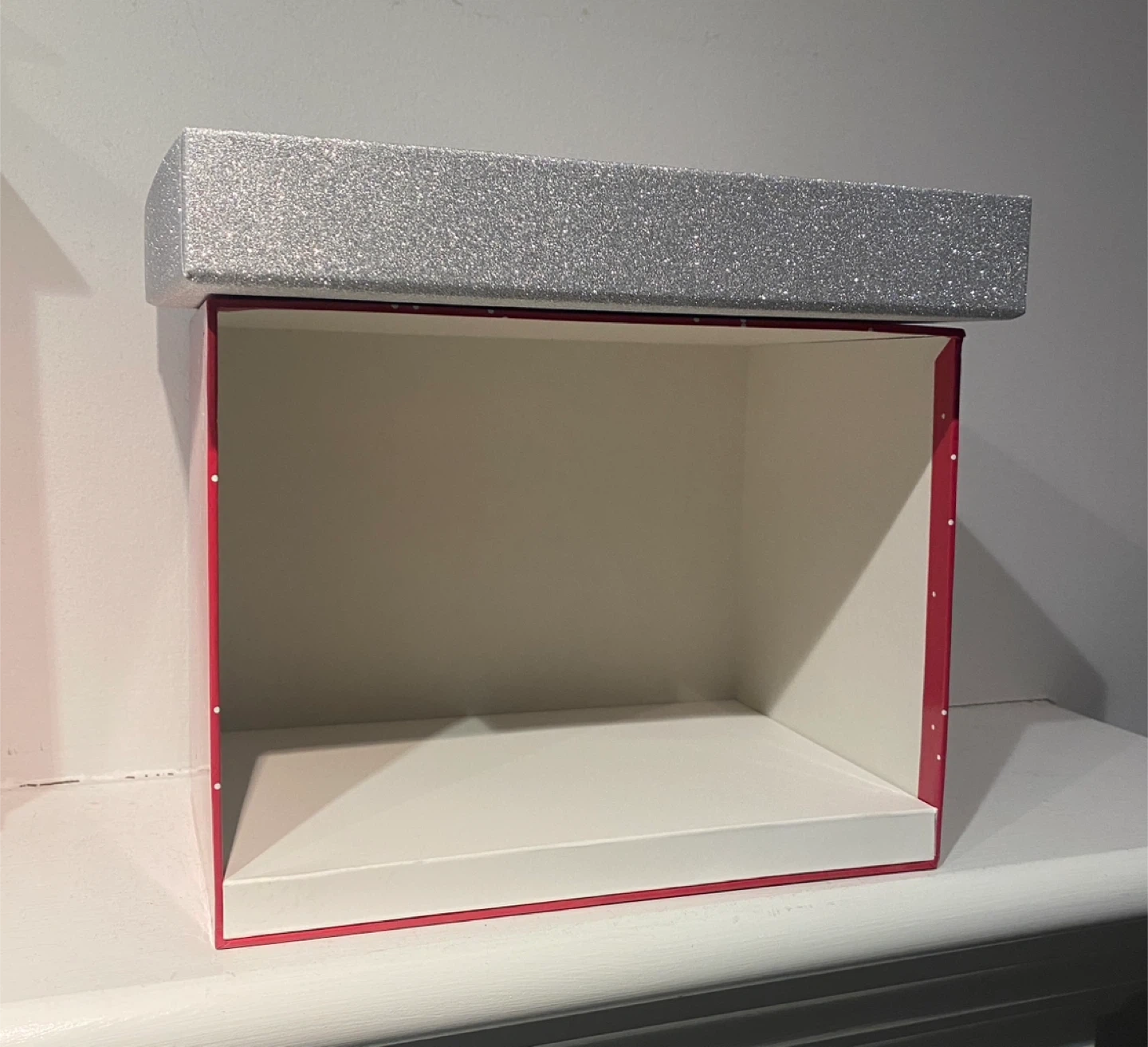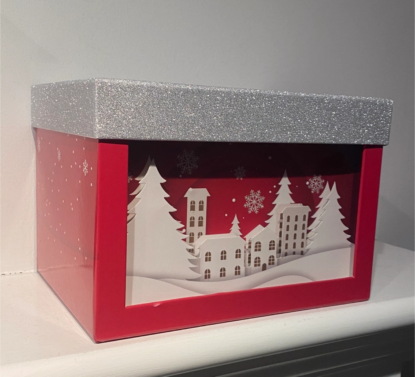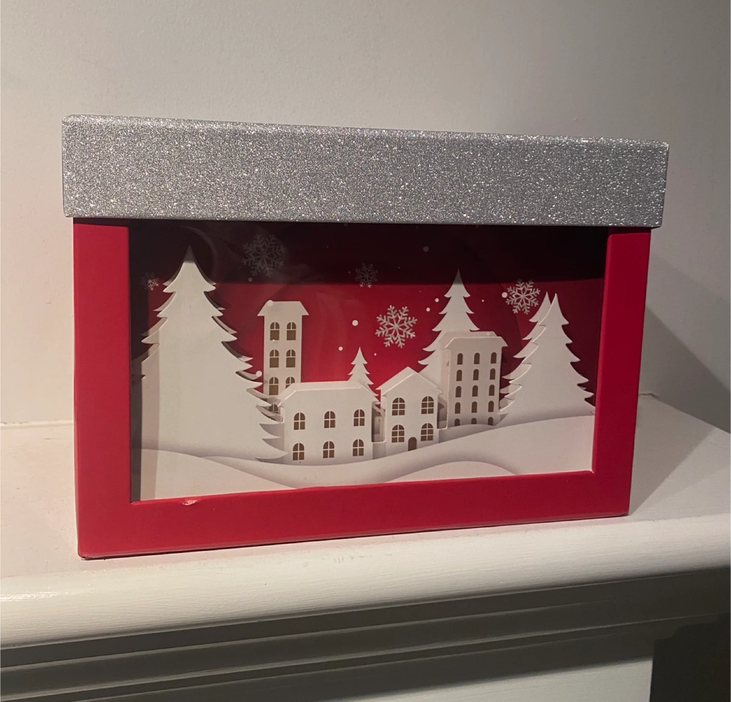 They feature a red frame with a silver glitter lid, and the small box is showcasing a charming winter village scene inside