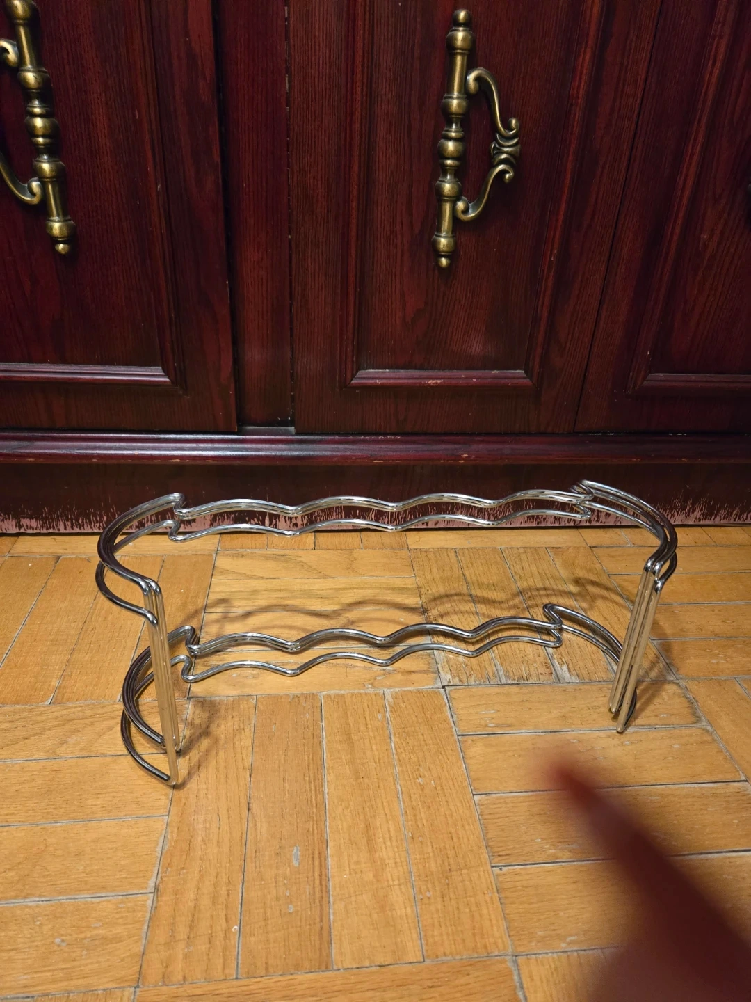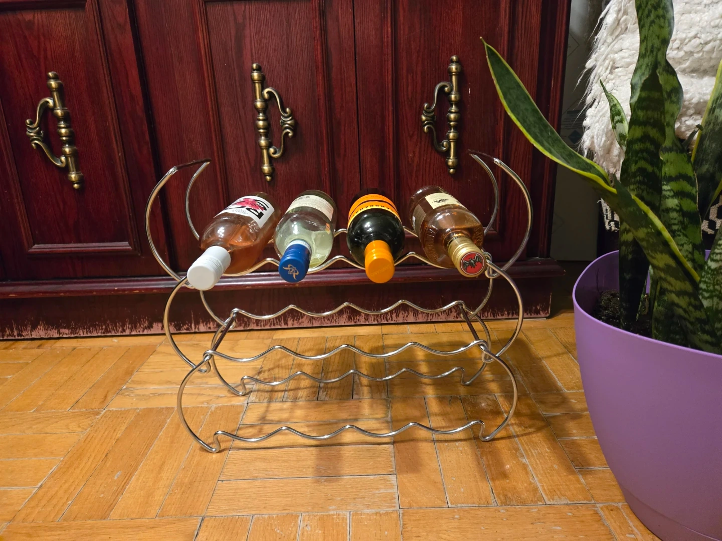 A convenient stackable metal wine rack that can hold 12 bottles of wine. 3 levels of the rack could be used separately or in any combination depending on available space. It is very sturdy and in great shape, ready to use in your home!