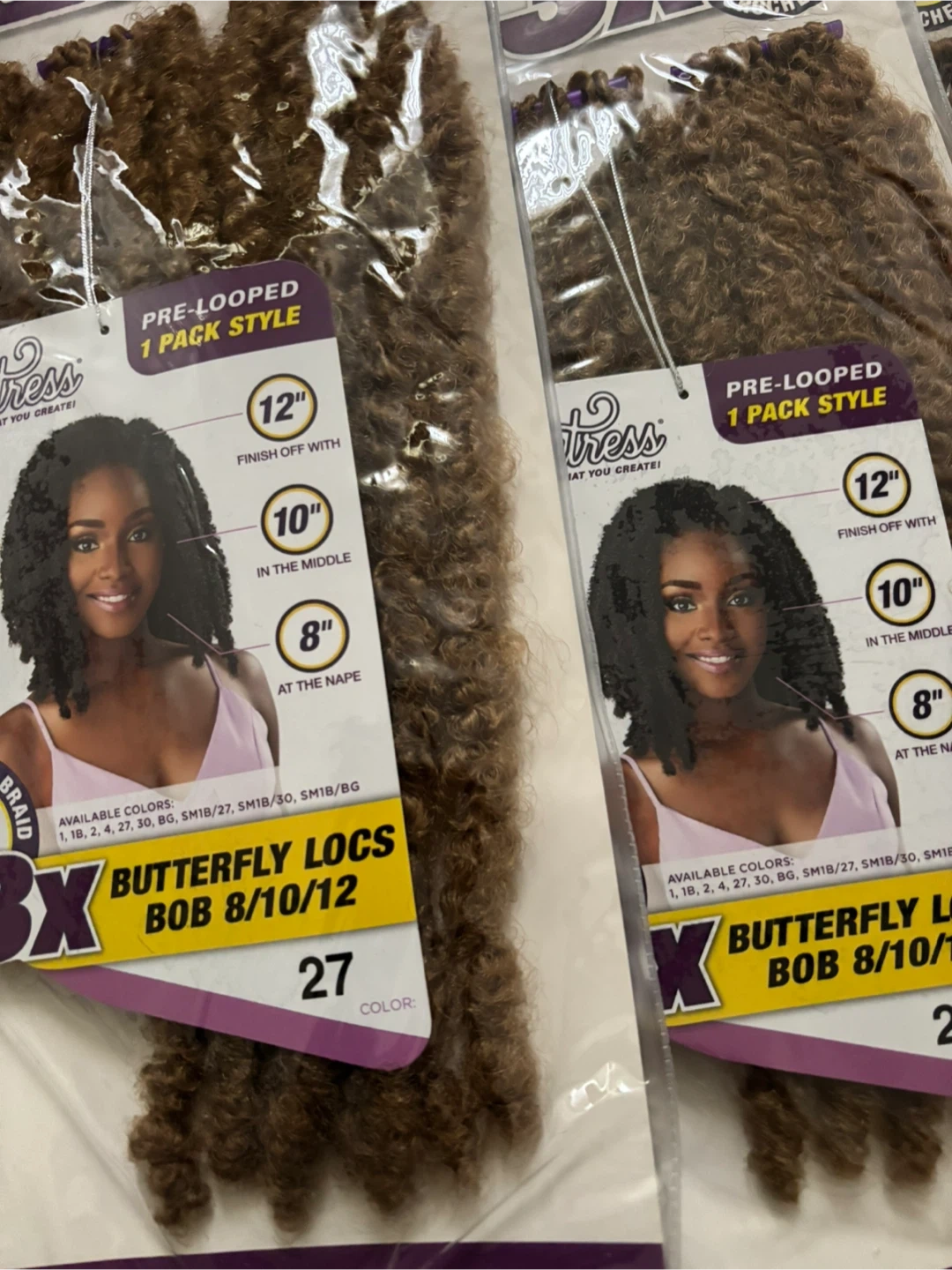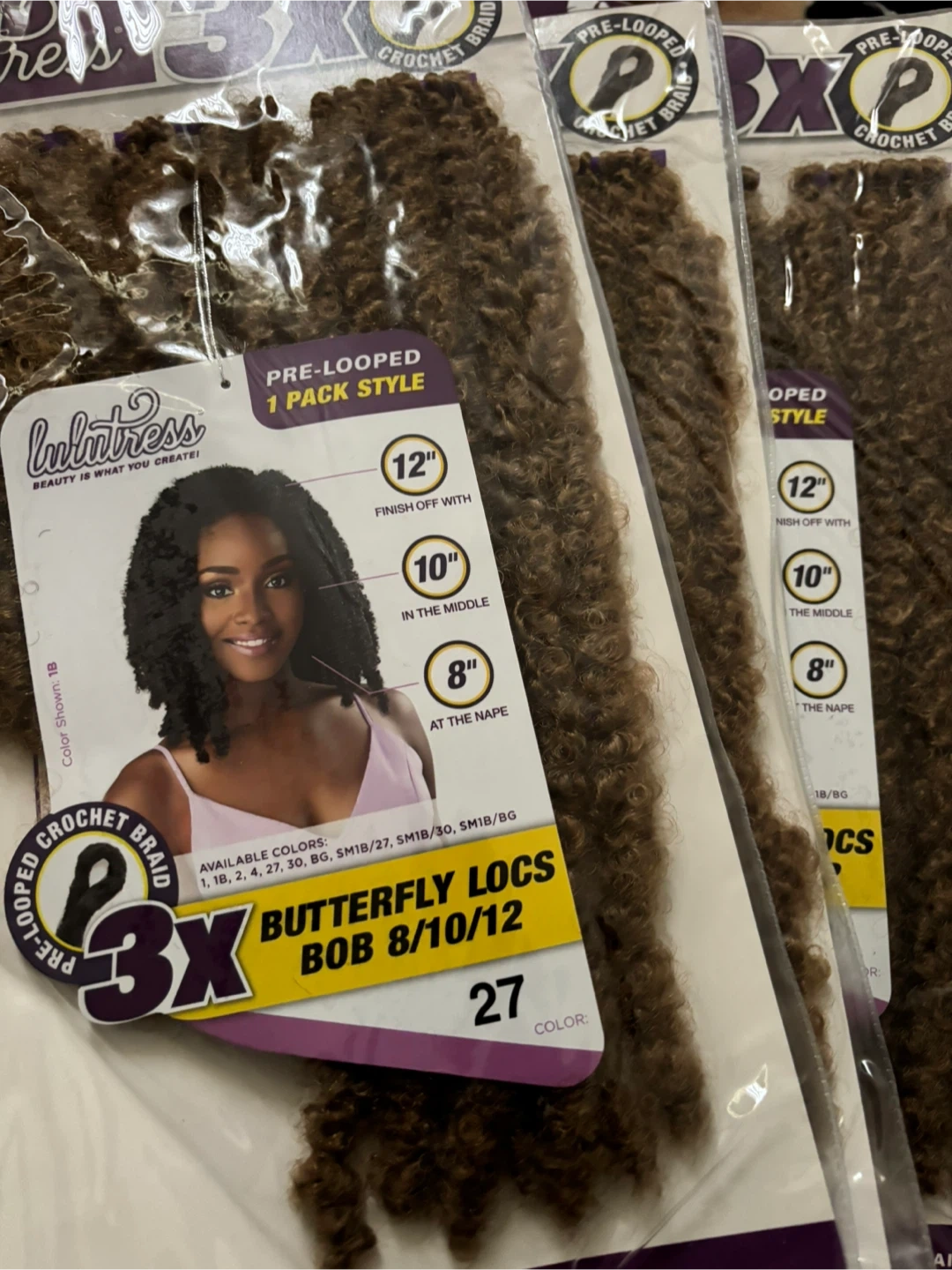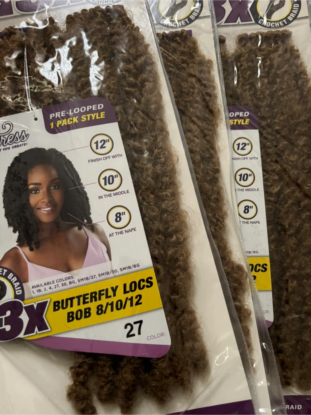 These are 3X X-Pression Butterfly Locs in the Bob 8/10/12 style. The colour is #27. They are pre-looped for easy crochet installation and come 1 pack is $6 only have a few left