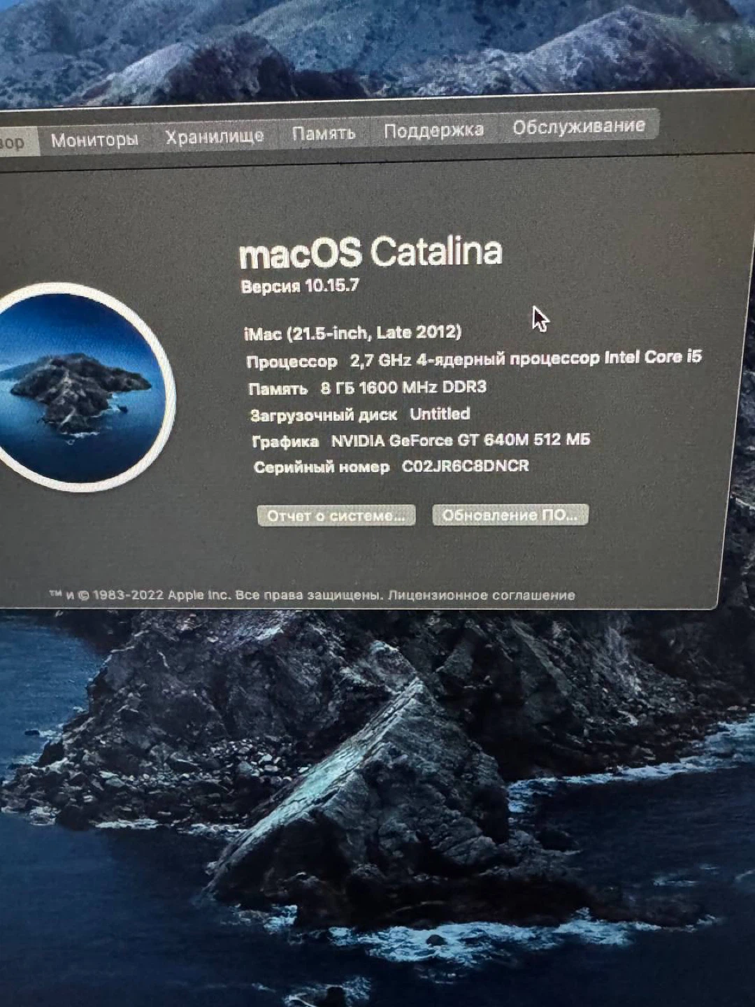 Selling an Apple iMac 21.5-inch (Late 2012) running macOS Catalina version 10.15.7. It has a 2.7 GHz 4-core Intel Core i5 processor, 8 GB 1600 MHz DDR3 memory, and a NVIDIA GeForce GT 640M 512 MB graphics card. Serial number is C02JR6C8DNCR