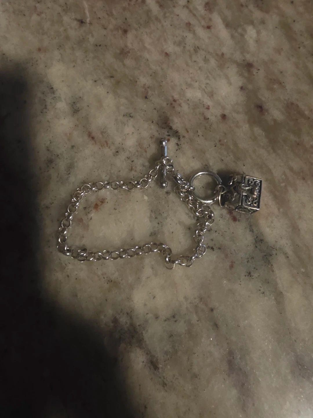 Selling a silver charm bracelet. It features a chain with a toggle closure and a decorative charm. Perfect for adding a touch of style to any outfit!