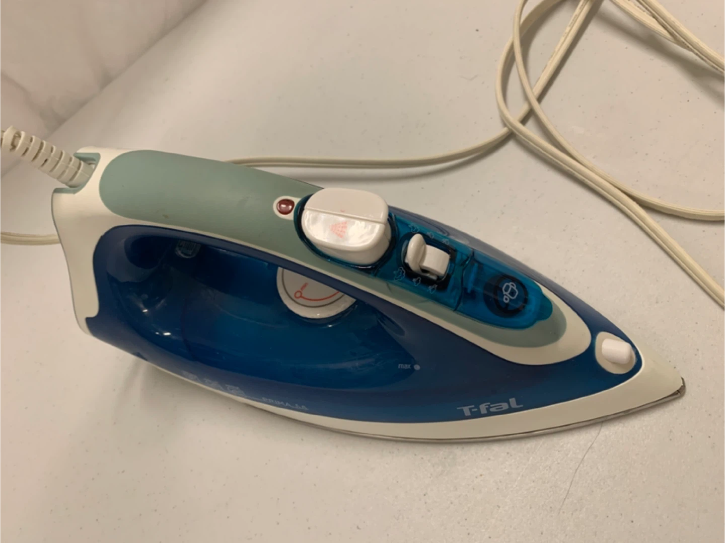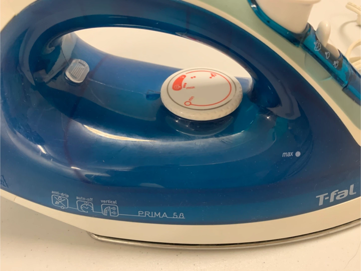 Selling a T-fal Prima 5.8 steam iron in good condition. It features anti-drip, auto-off, and vertical steam functions. Perfect for getting your clothes wrinkle-free!