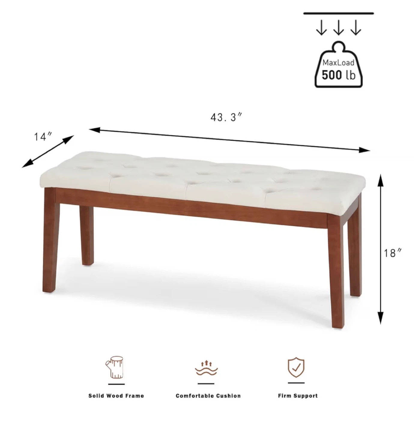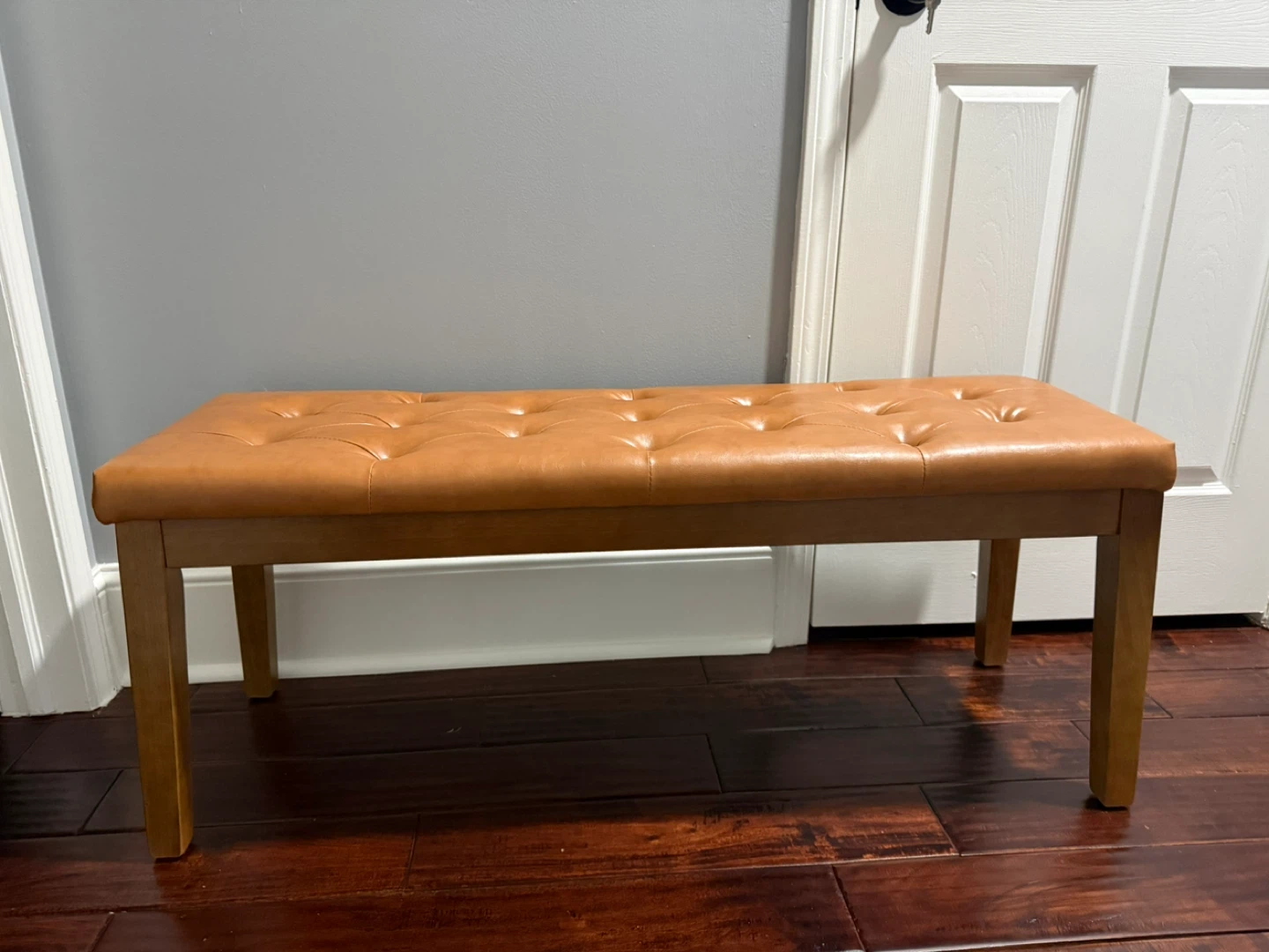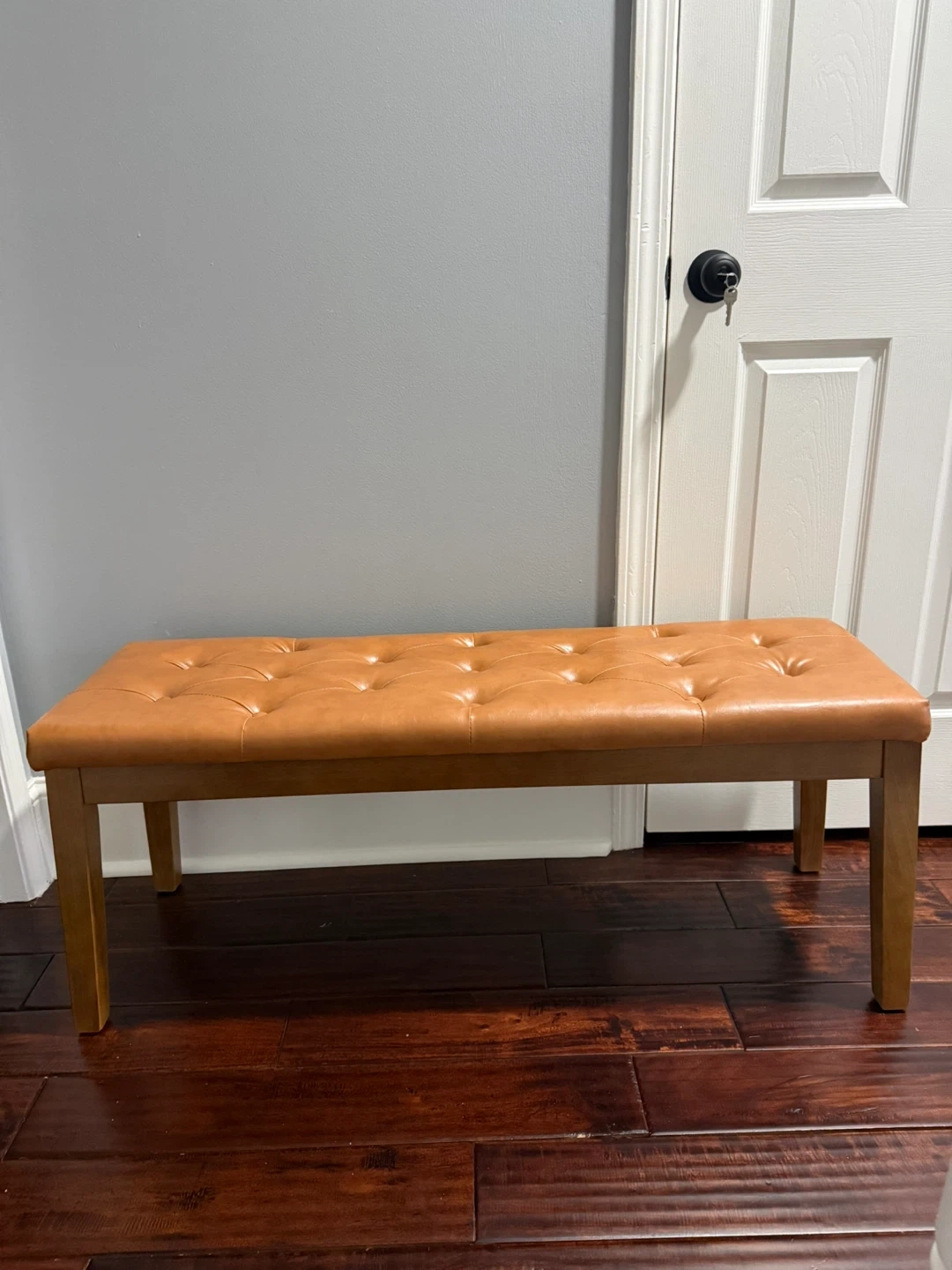 Selling a MILCIL upholstered entryway bench. It has a solid wood frame and a comfortable cushion. The bench offers firm support and can hold up to 500 lbs. The dimensions are 43.3" x 14" x 18". It comes with the original box!