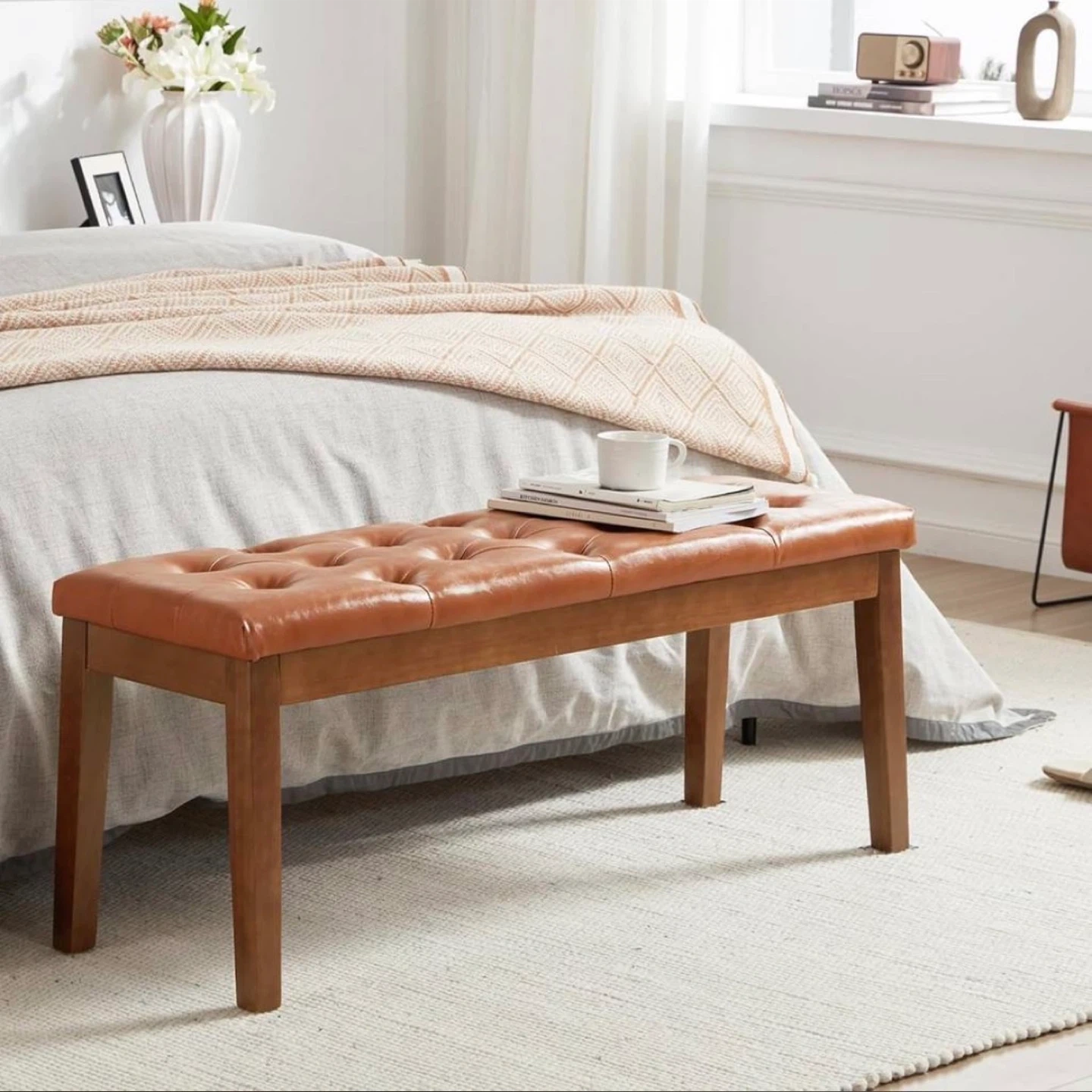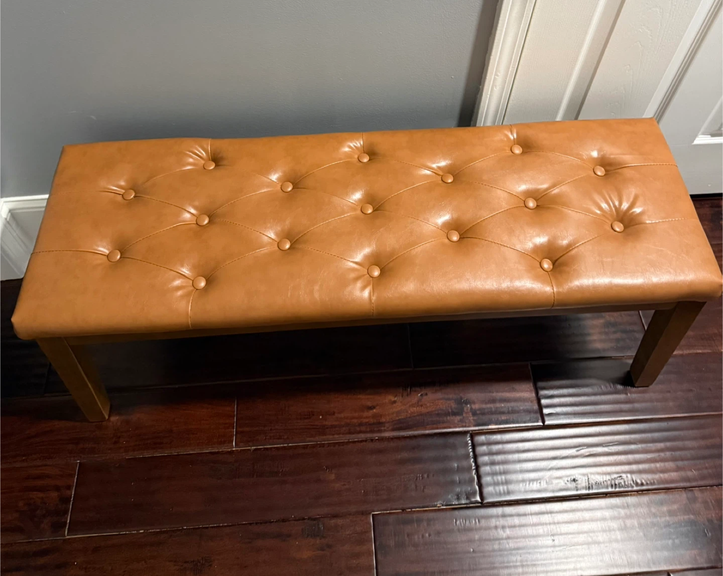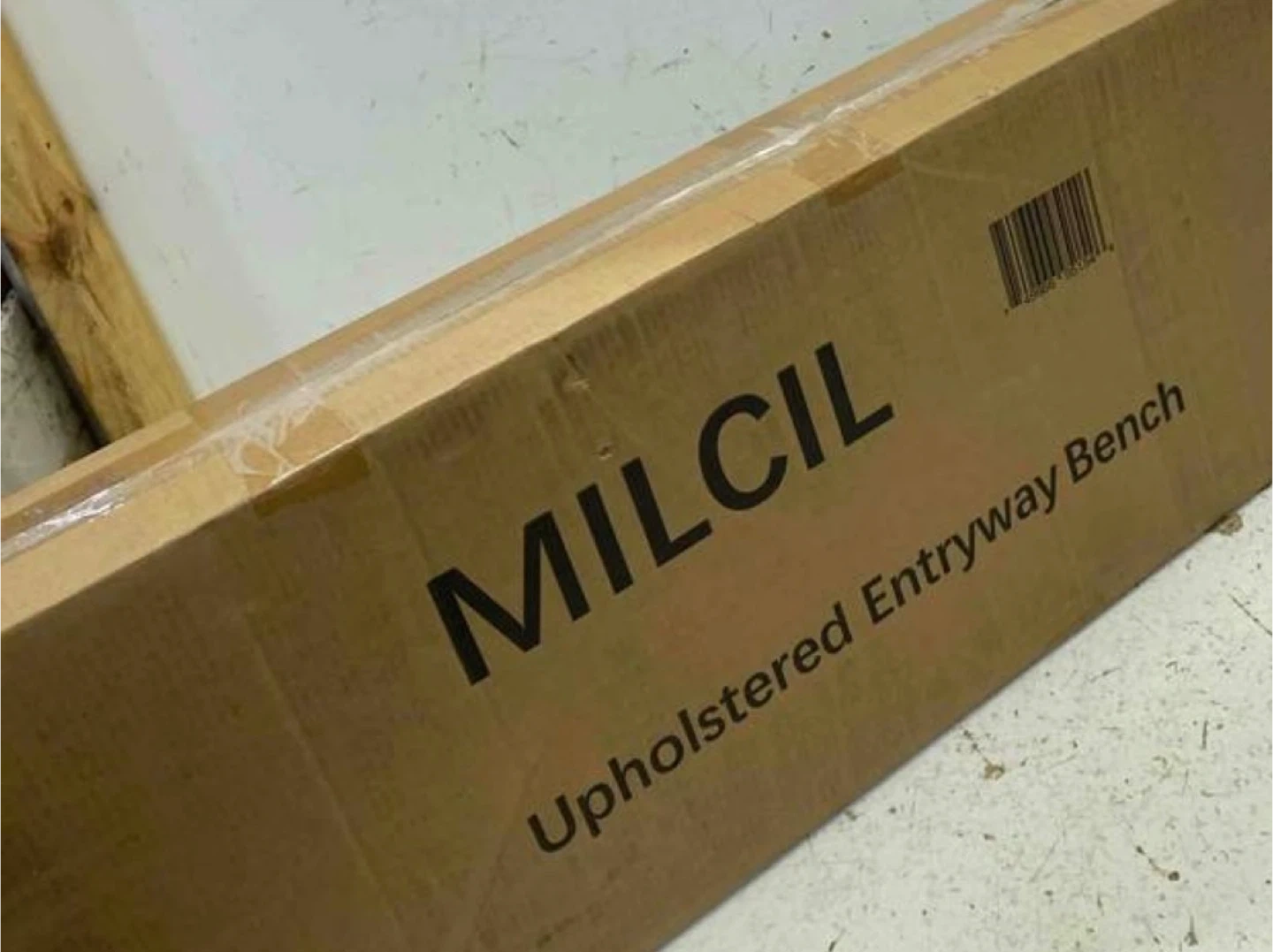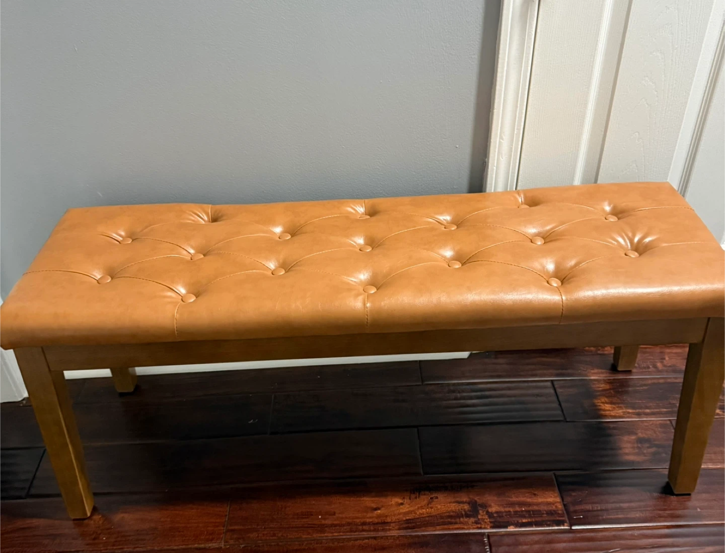 Selling a MILCIL upholstered entryway bench. It has a solid wood frame and a comfortable cushion. The bench offers firm support and can hold up to 500 lbs. The dimensions are 43.3" x 14" x 18". It comes with the original box!